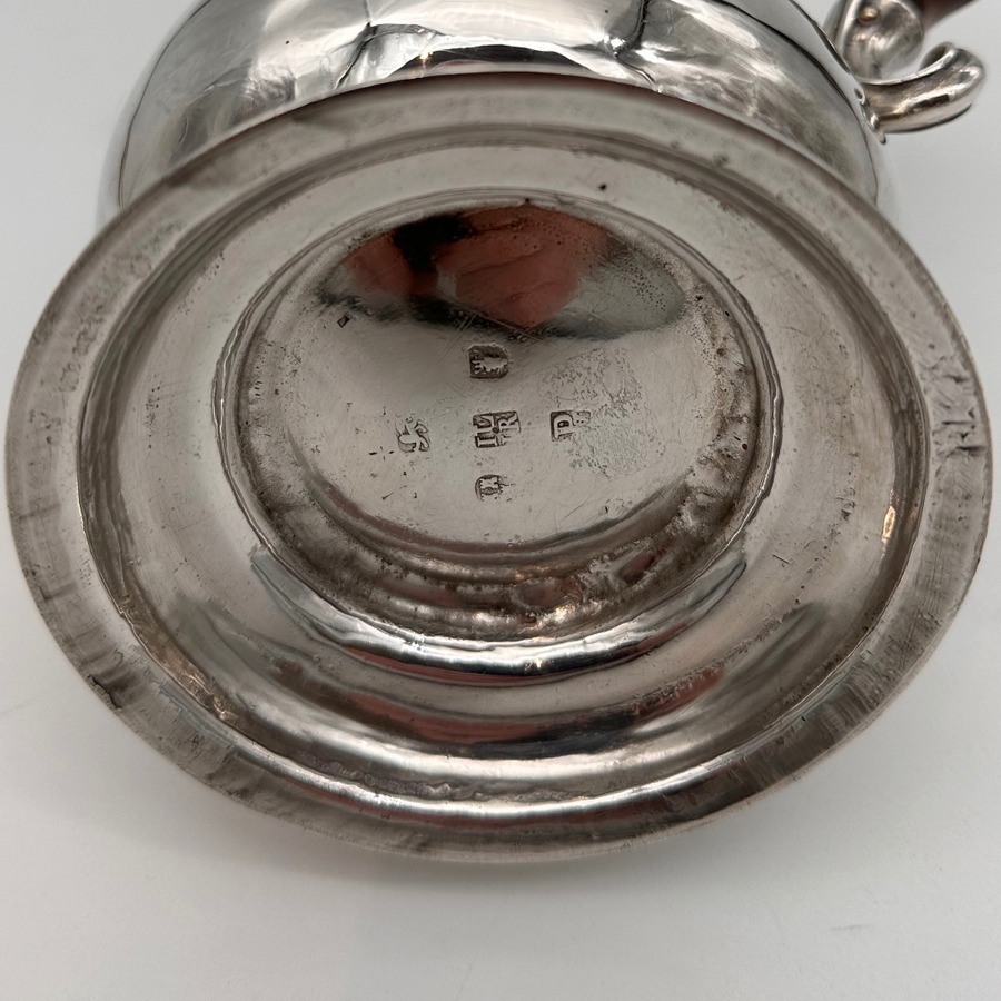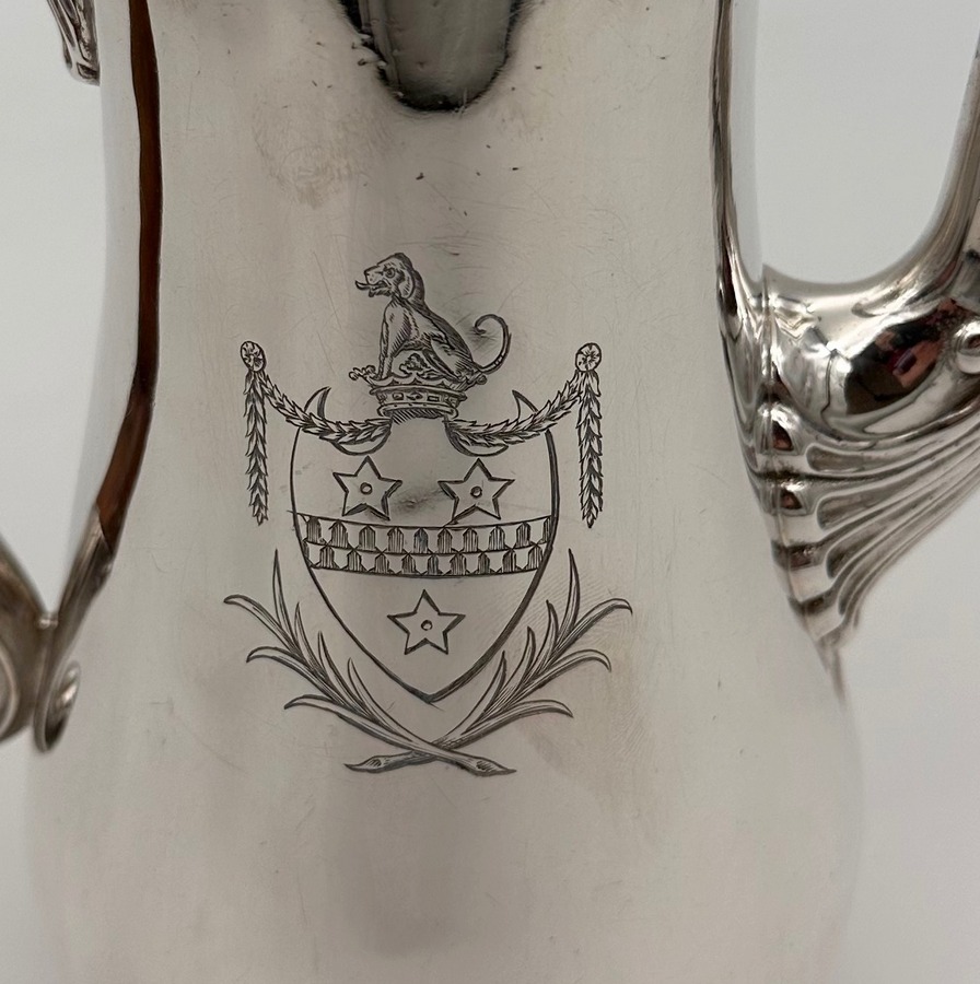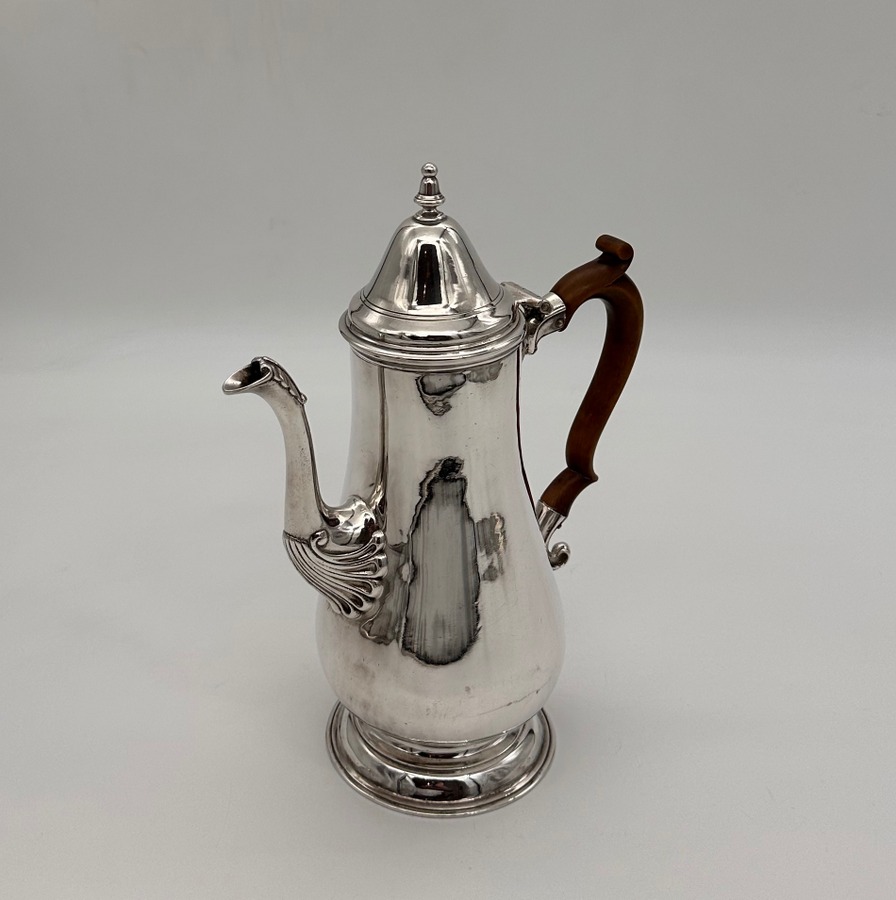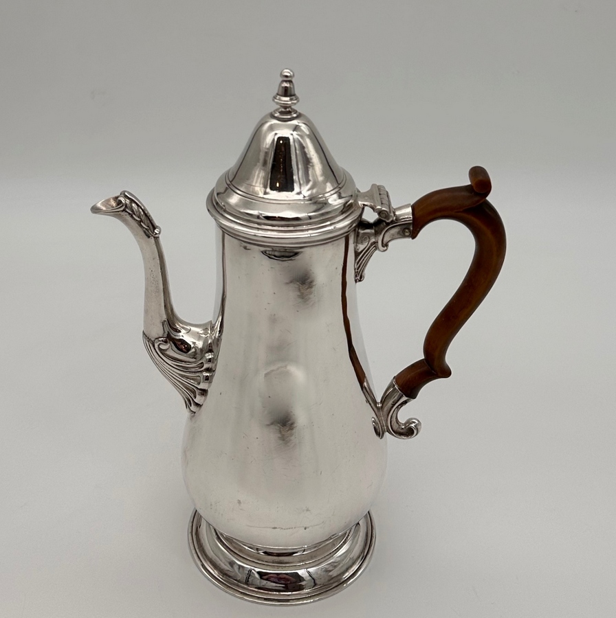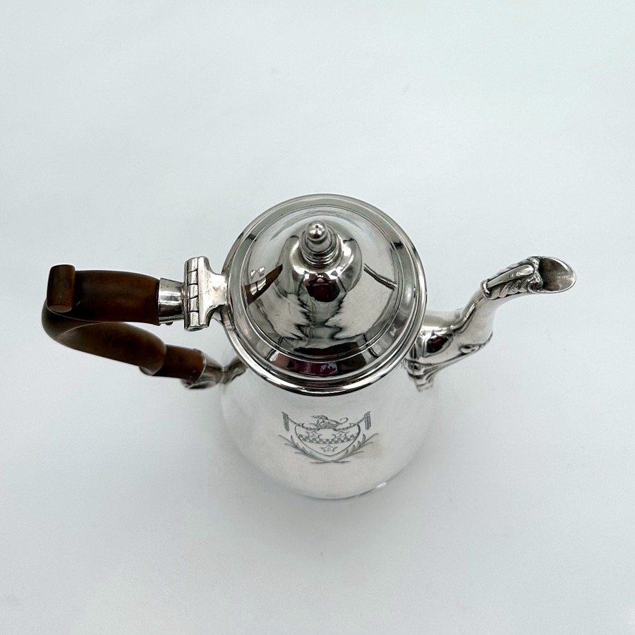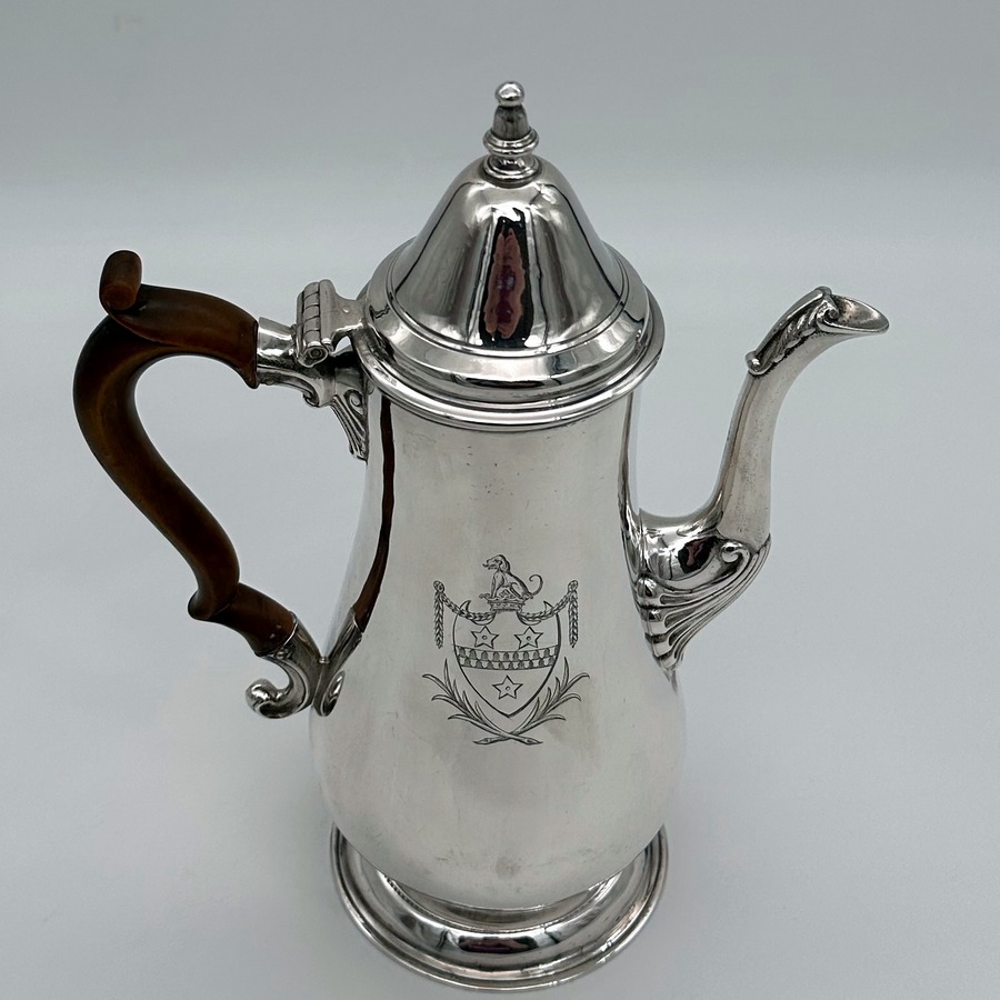 Rare and incredibly unusual 18th century silver coffee pot designed with a delightful baluster shaped body and a beautiful elongated domed hinged lid. The body has a stylish contemporary armorial (achievement for Baugh most probably a northern branch due to the Newcastle assay) for importance.