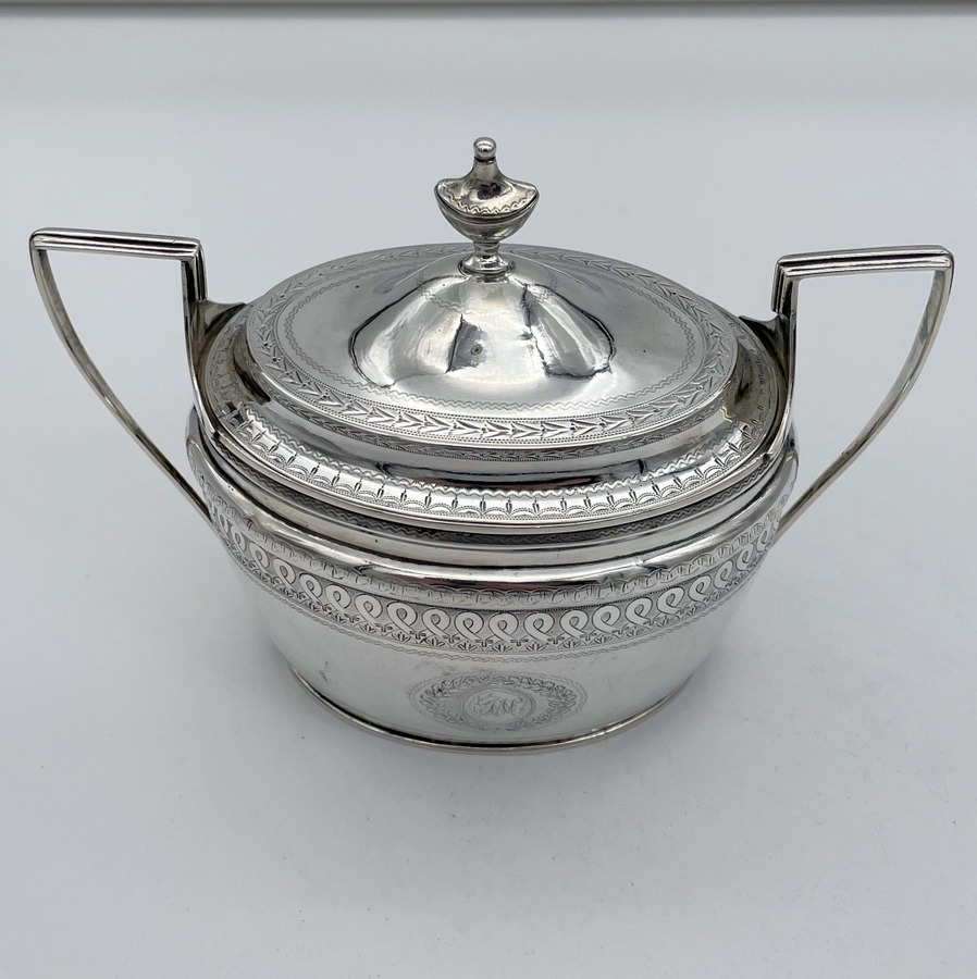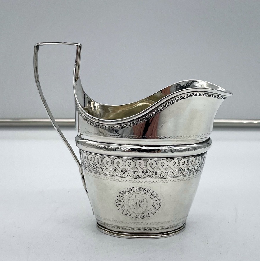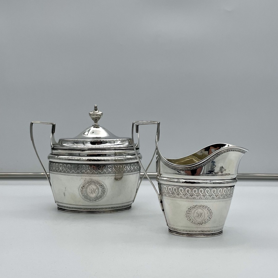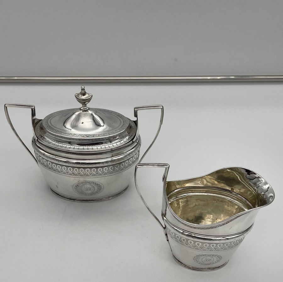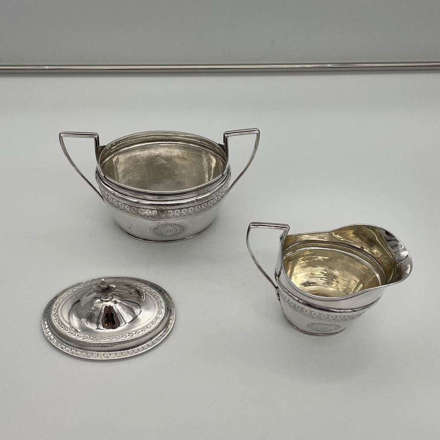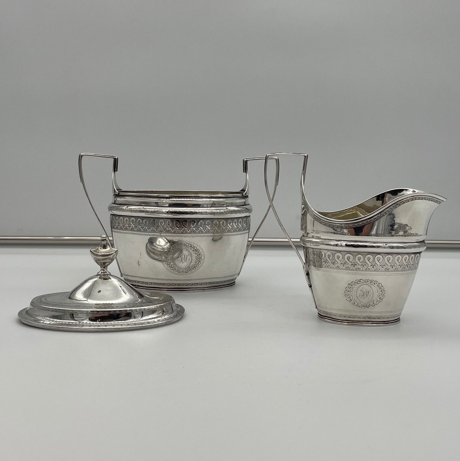 A rare American made sterling silver antique covered sugar bowl and cream jug decorated with beautiful bright cut engraved borders. There are double elegant floral cartouches both with contemporary entwined initials and times new roman font.