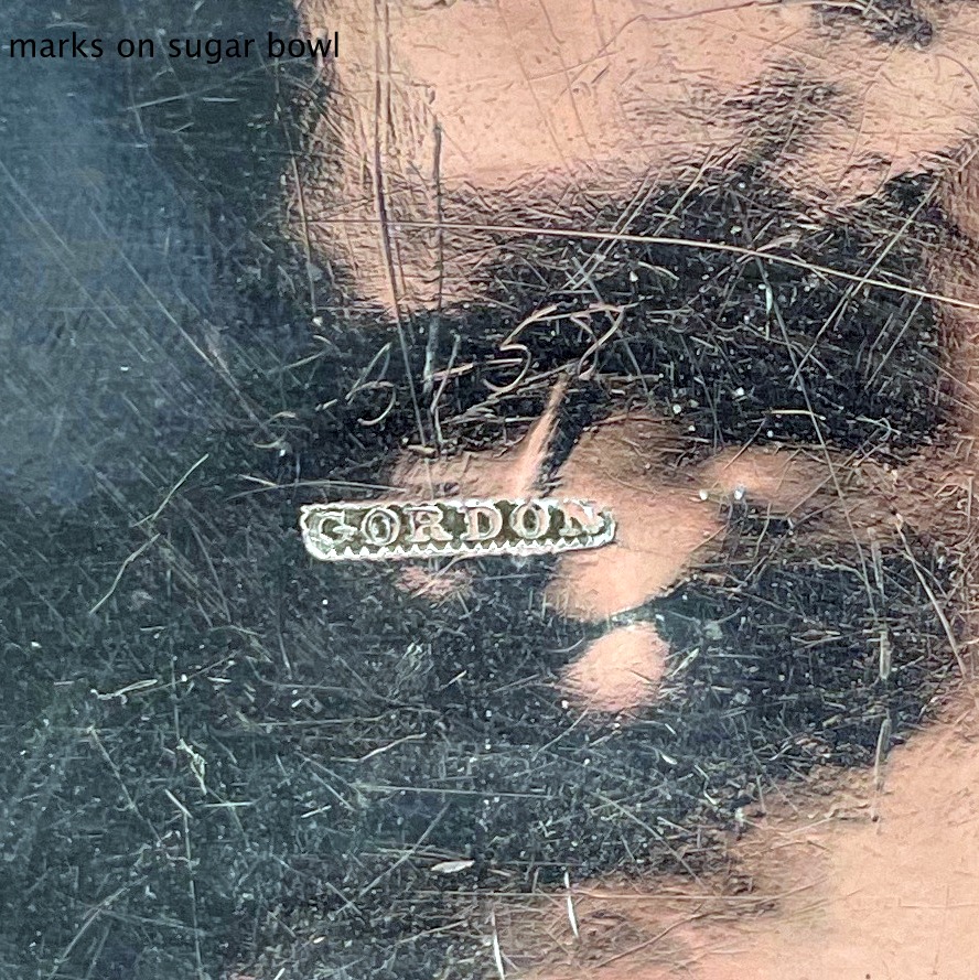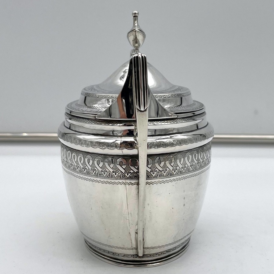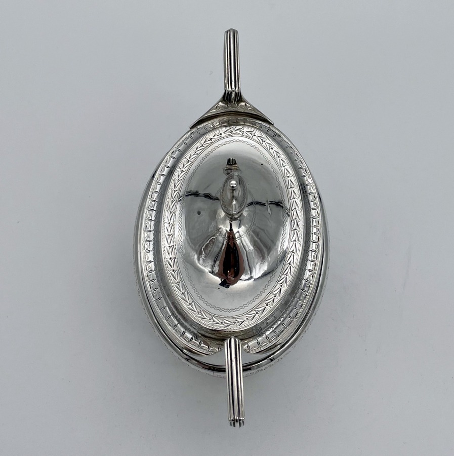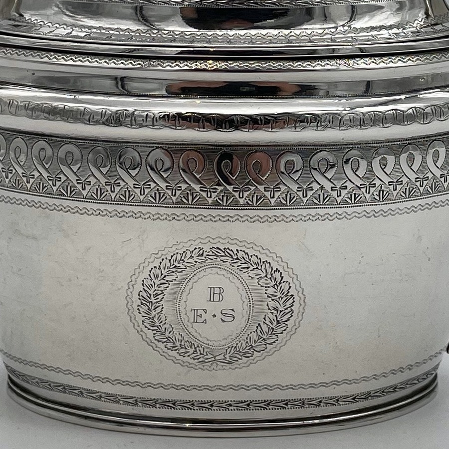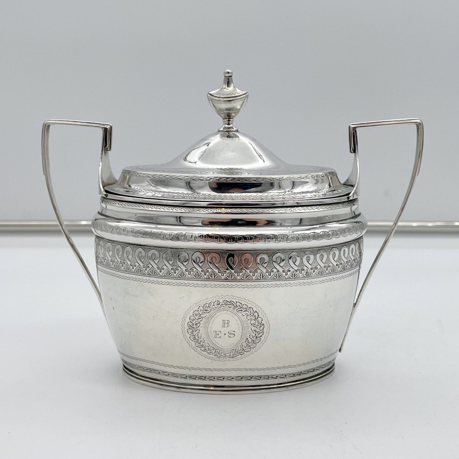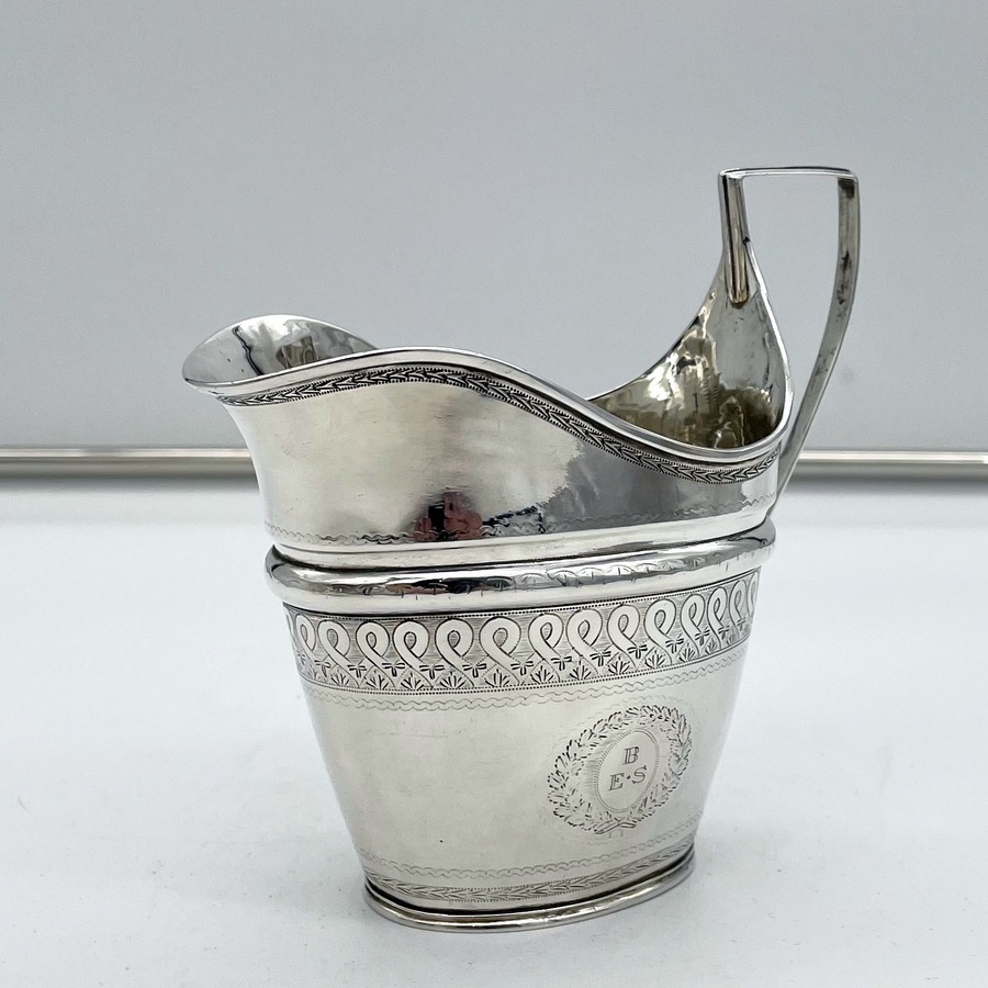 A rare American made sterling silver antique covered sugar bowl and cream jug decorated with beautiful bright cut engraved borders. There are double elegant floral cartouches both with contemporary entwined initials and times new roman font.