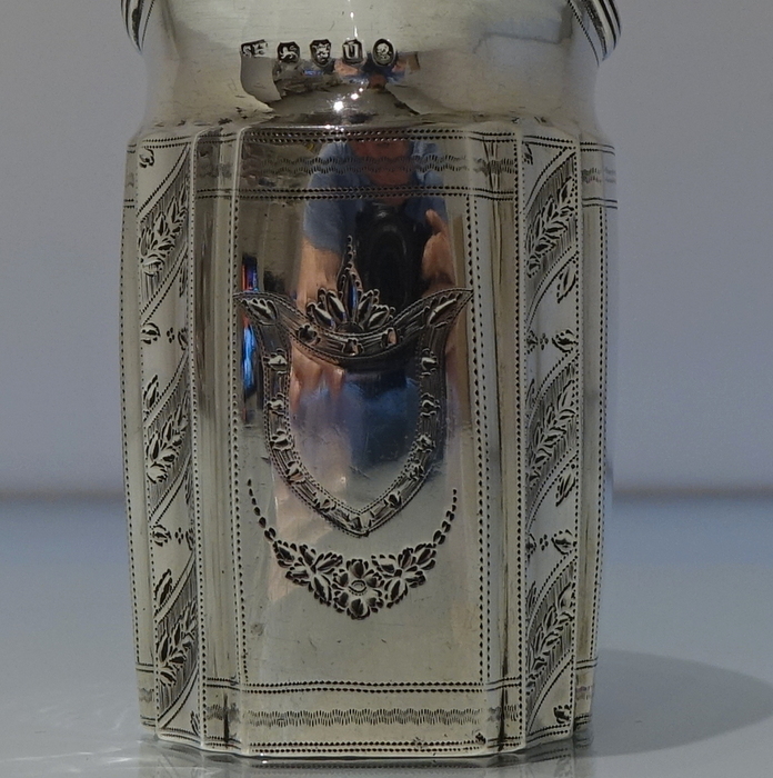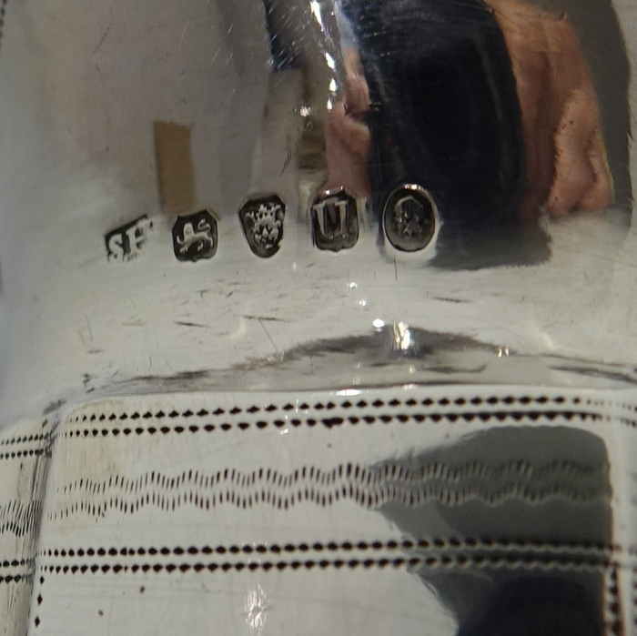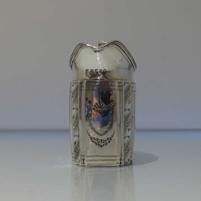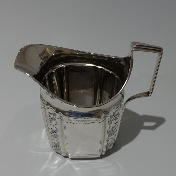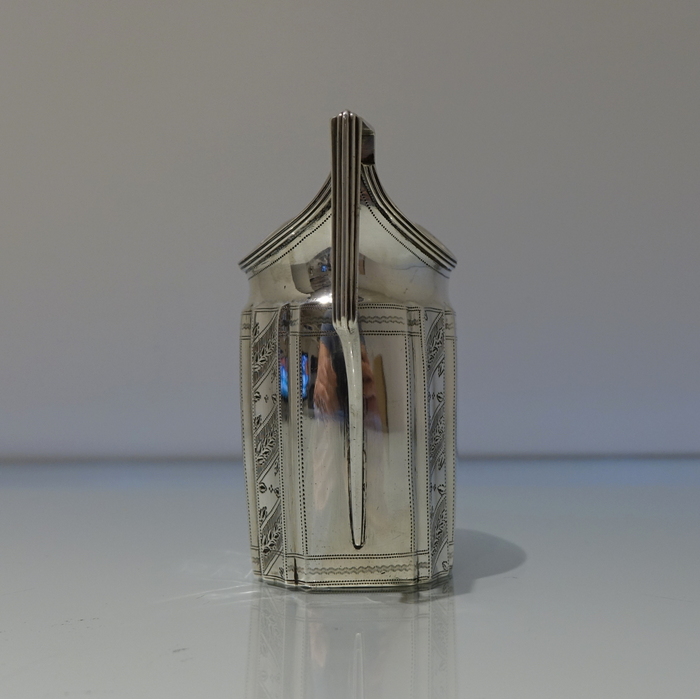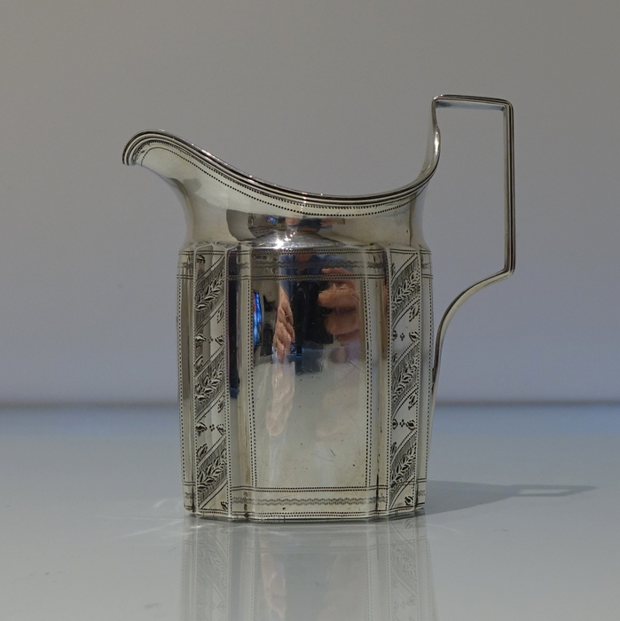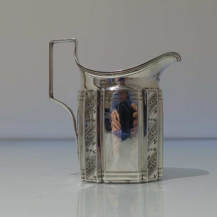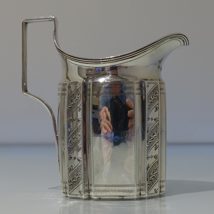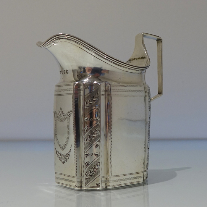 A charming 18th century bright cut engraved panelled cream jug. Â The jug has a stylish reed decorated handle which then flows into the spout for highlights. Â The panels alternate between plain form and engraved for a contrasting decorative effect.