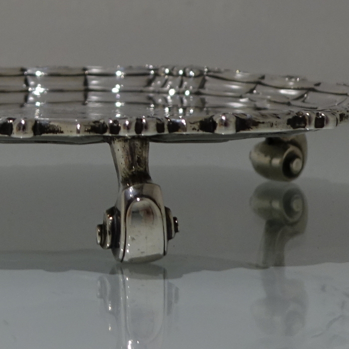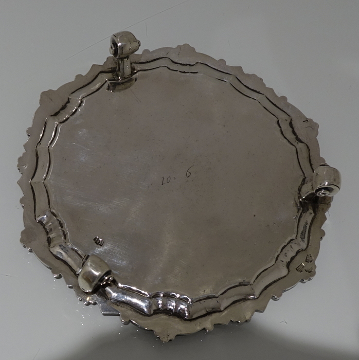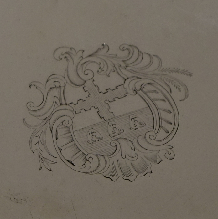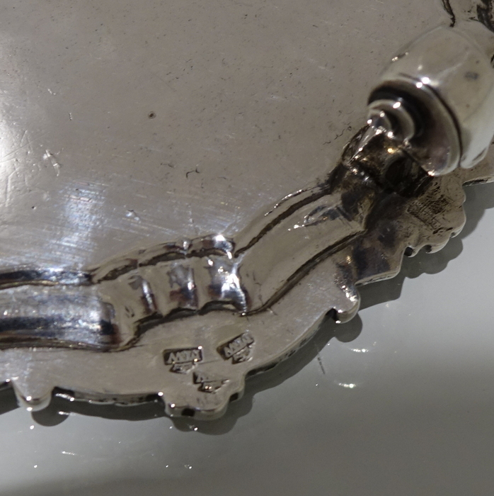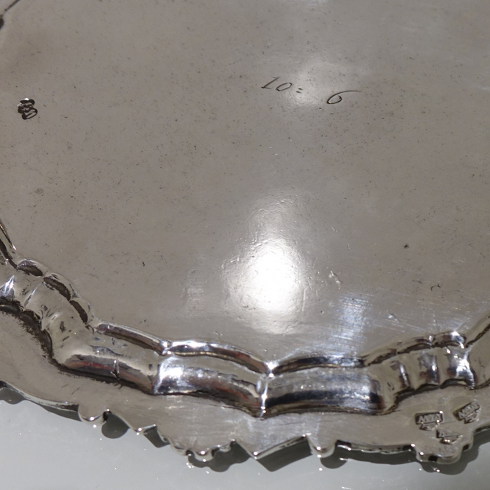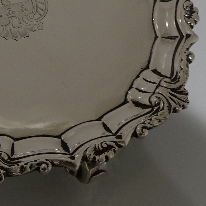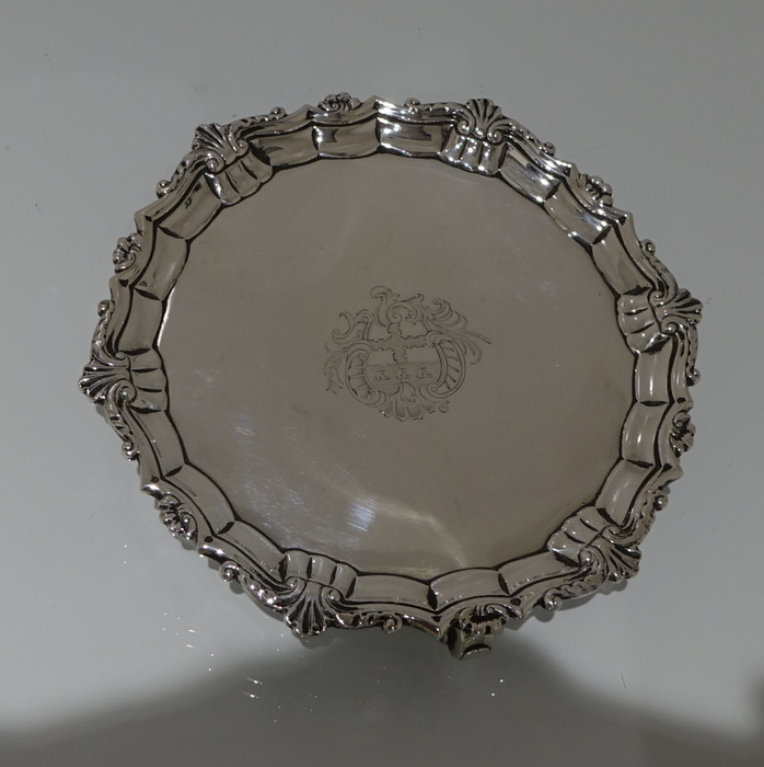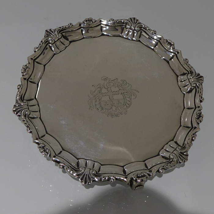 A highly collectable 18th century makers mark only shaped shell border circular salver sitting on three elegant peg feet. Â The centre front of the salver has a beautiful contemporary bright cut engraved armorial and the makers mark is struck three times on the underside.
