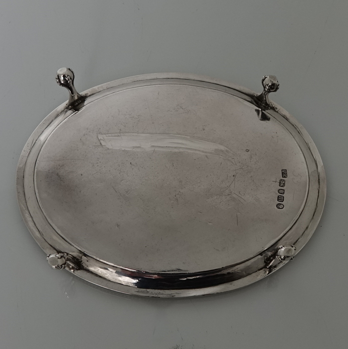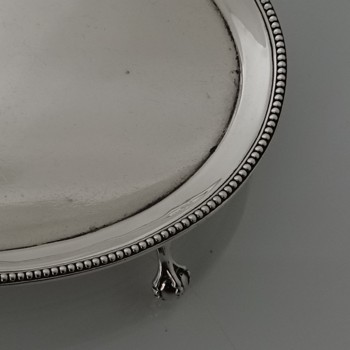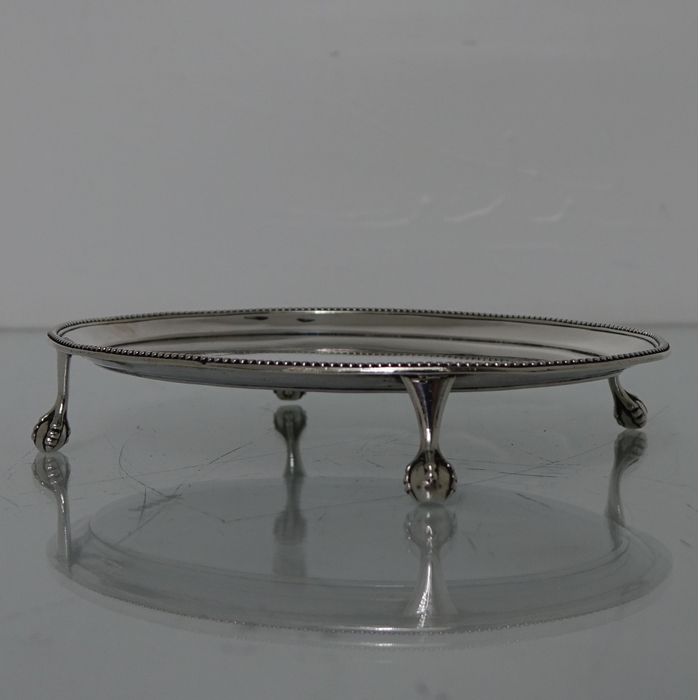 A very collectable Hester Bateman oval teapot stand with an applied bead border for decorative highlights. Â The teapot stand sits on four elegant ball and claw feet.