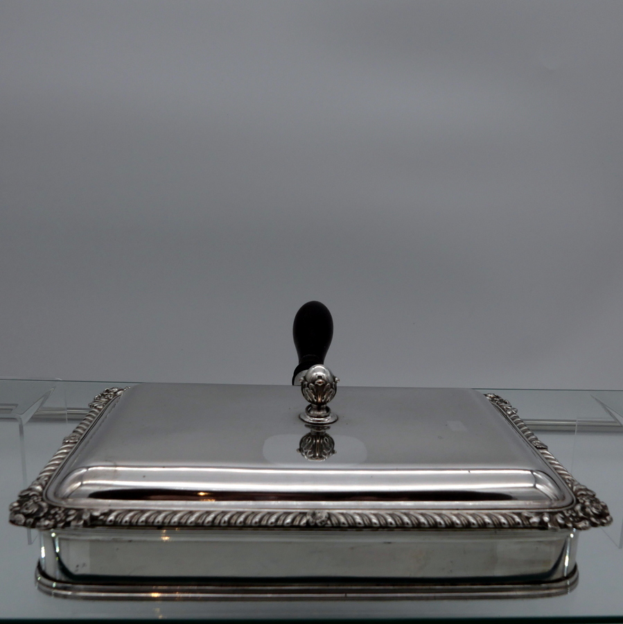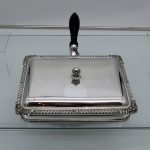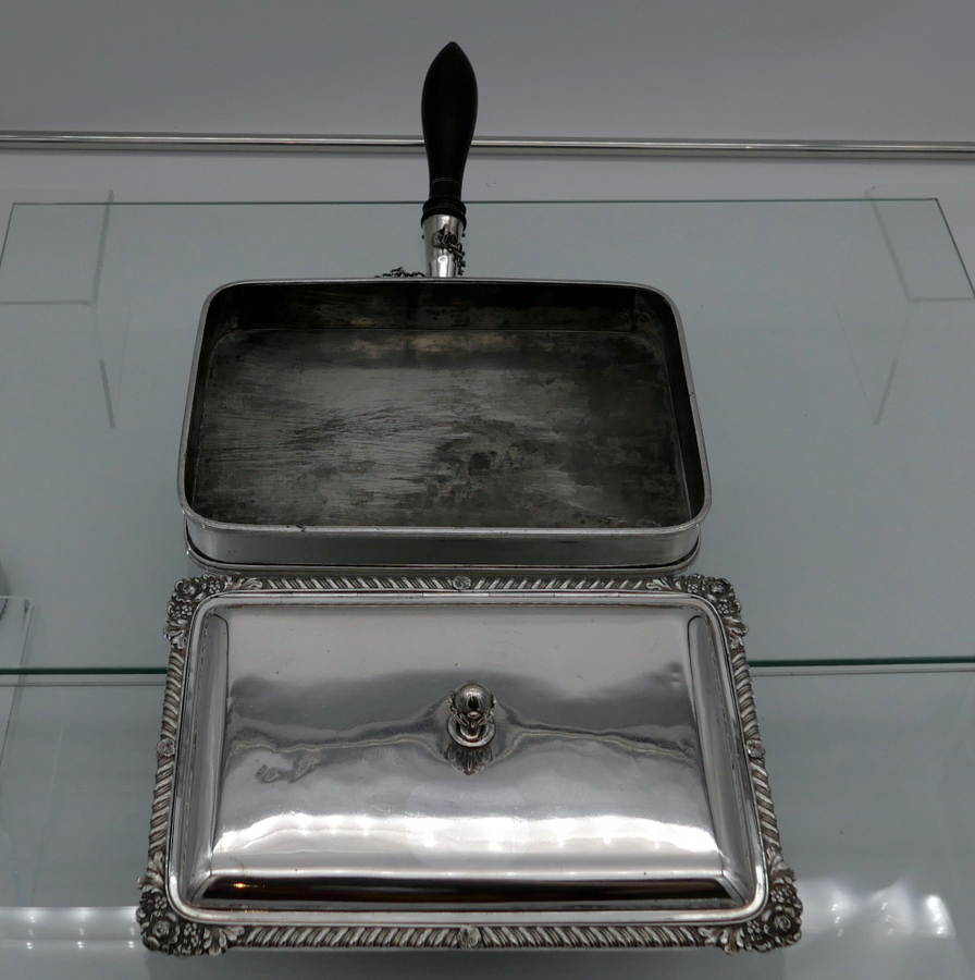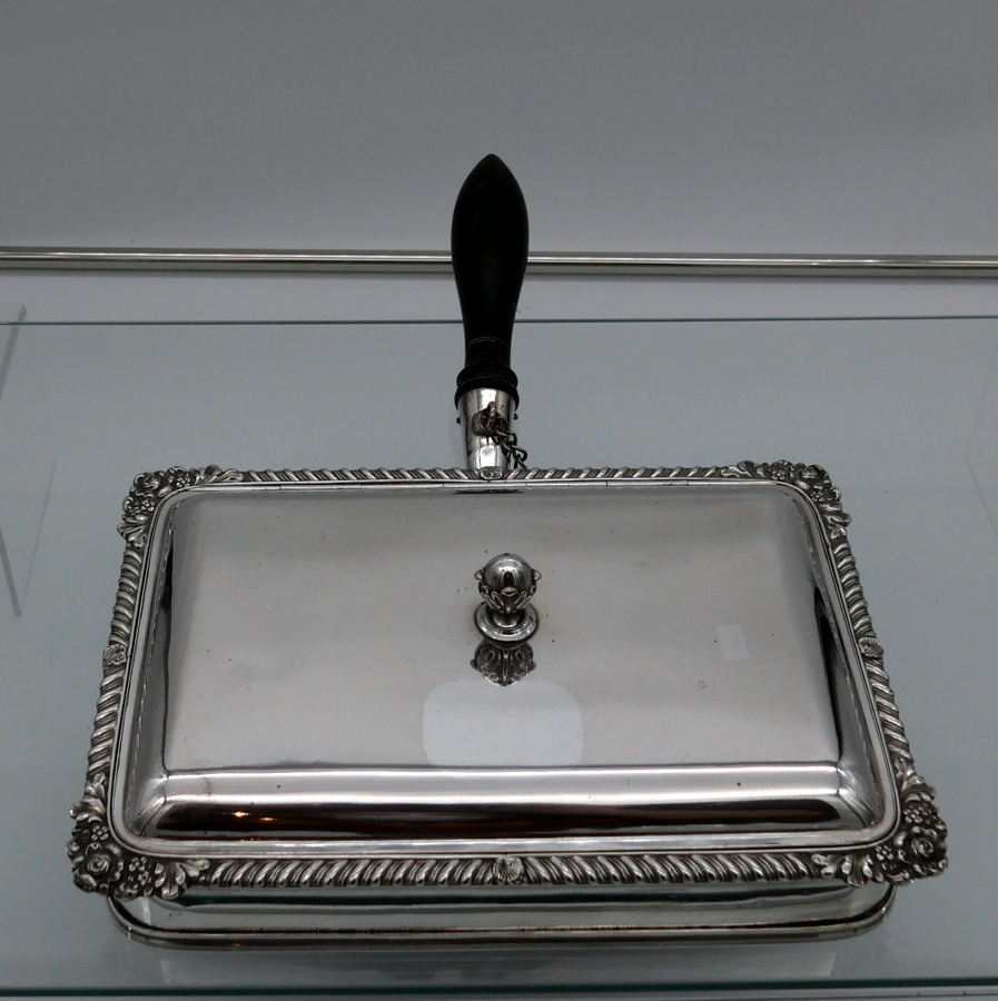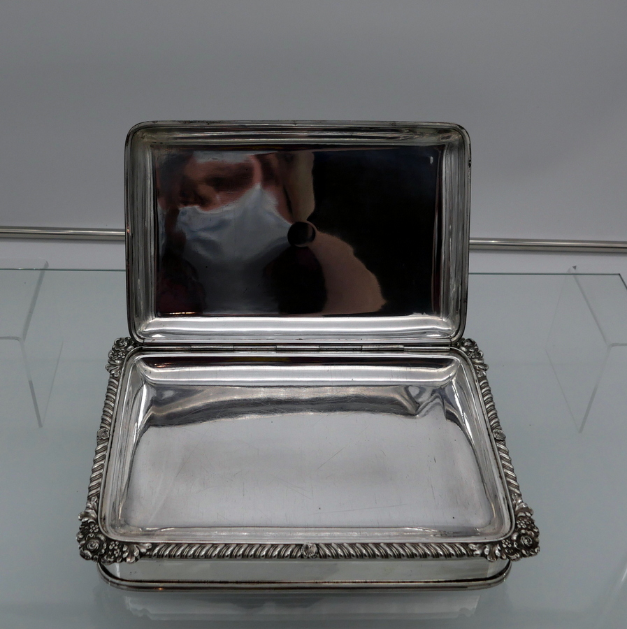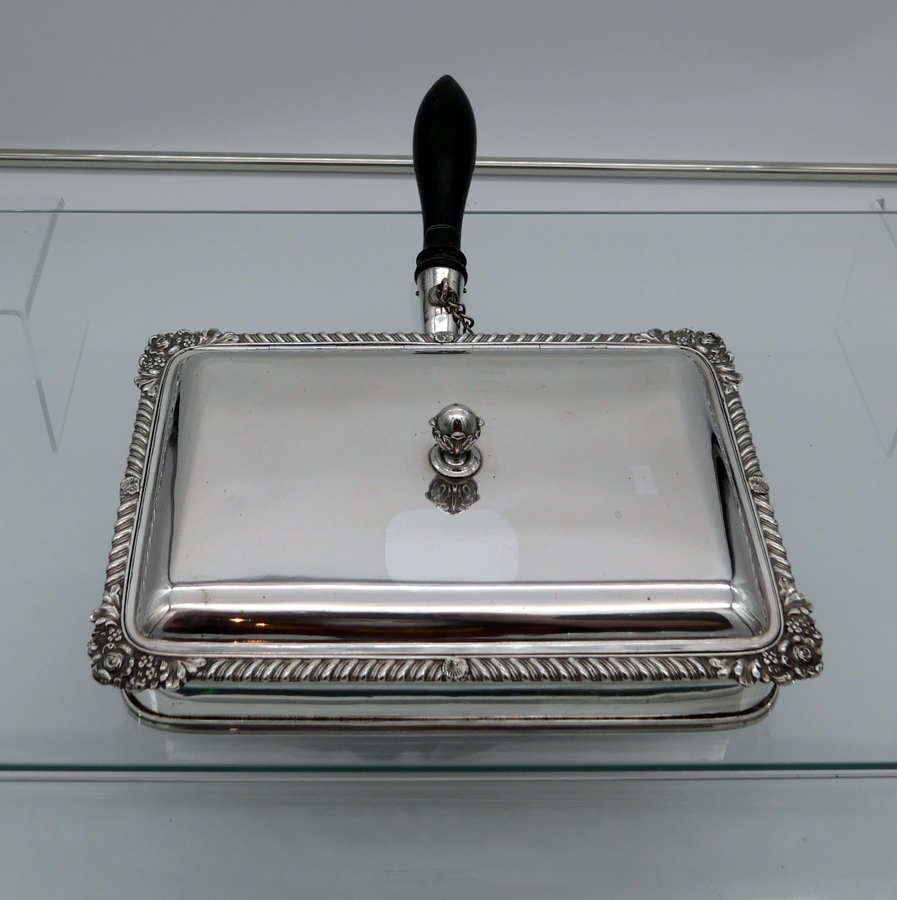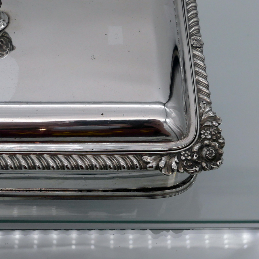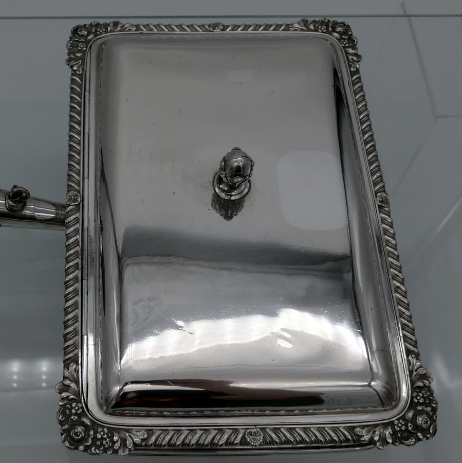 A wonderful early 19th century Old Sheffield plate rectangular cheese dish decorated with a delightful gadroon and floral applied border. Â The silver shielded lid is hinged and the under serving dish has elegant tinning.