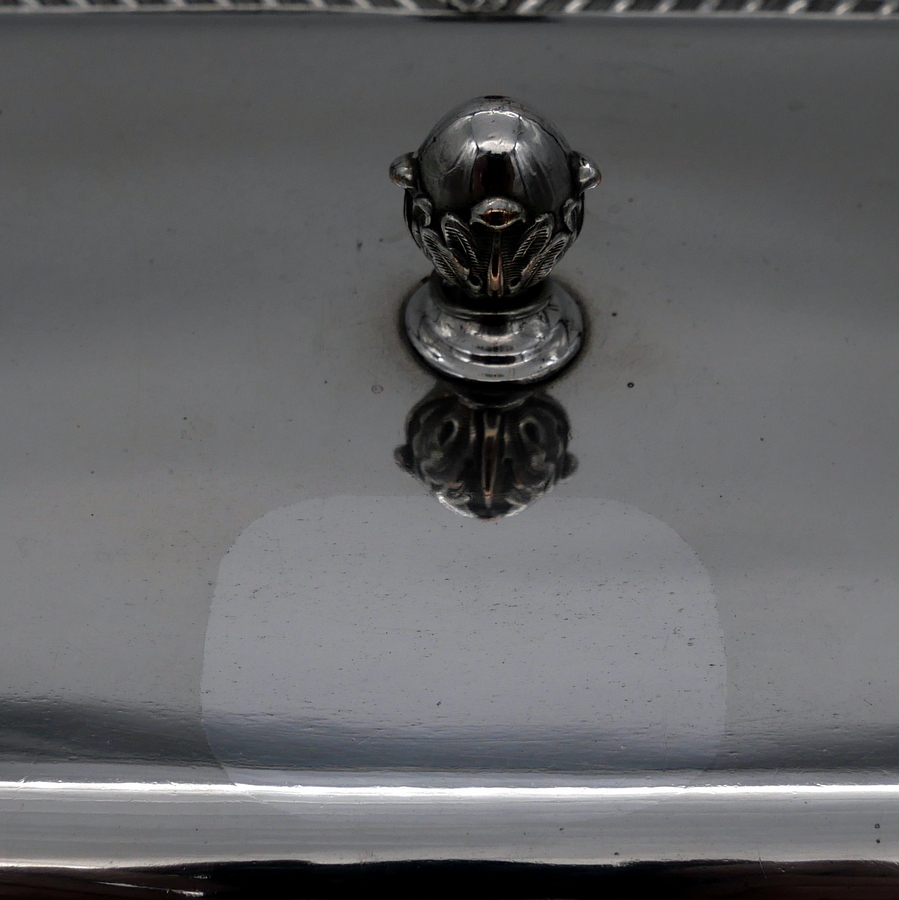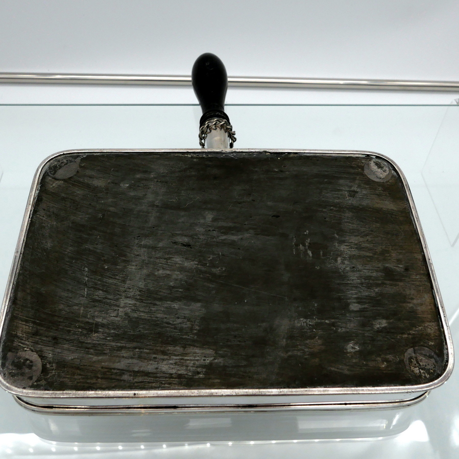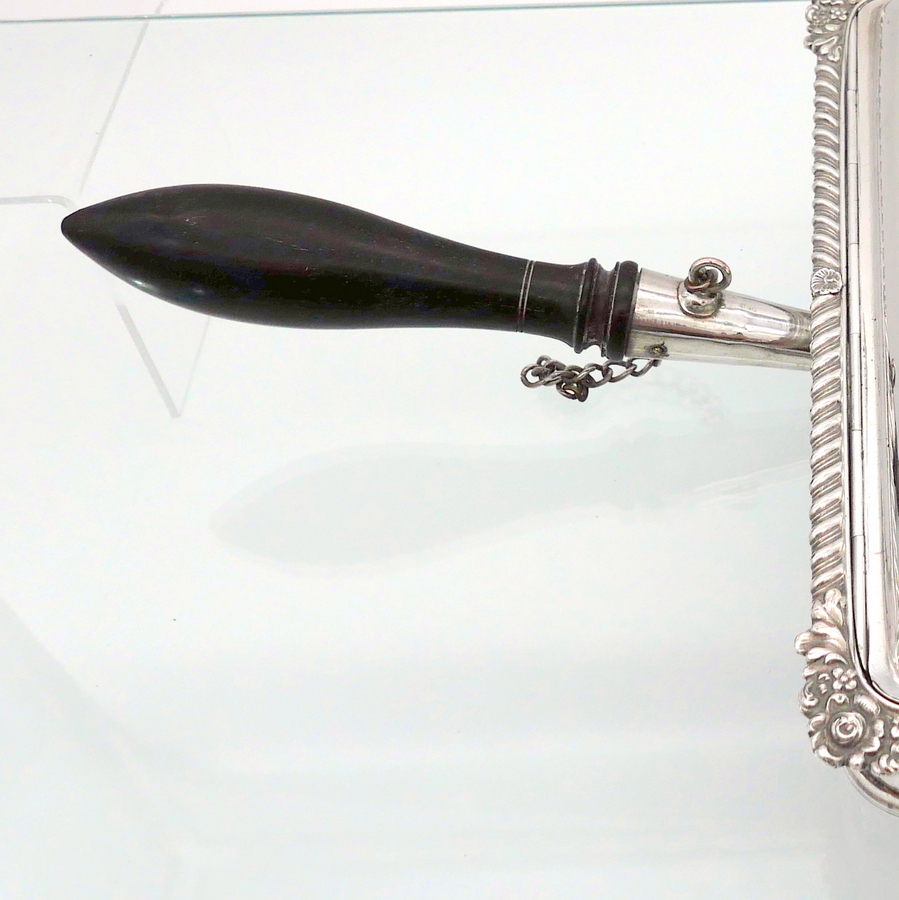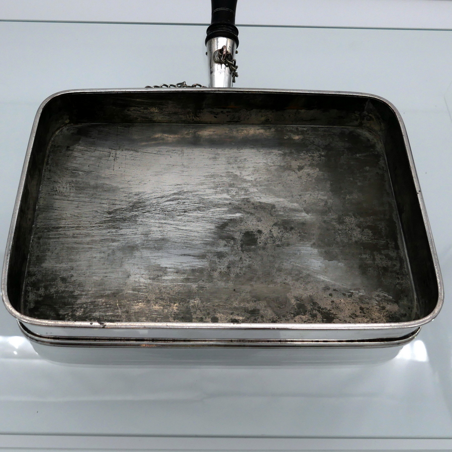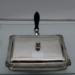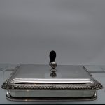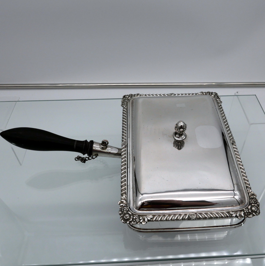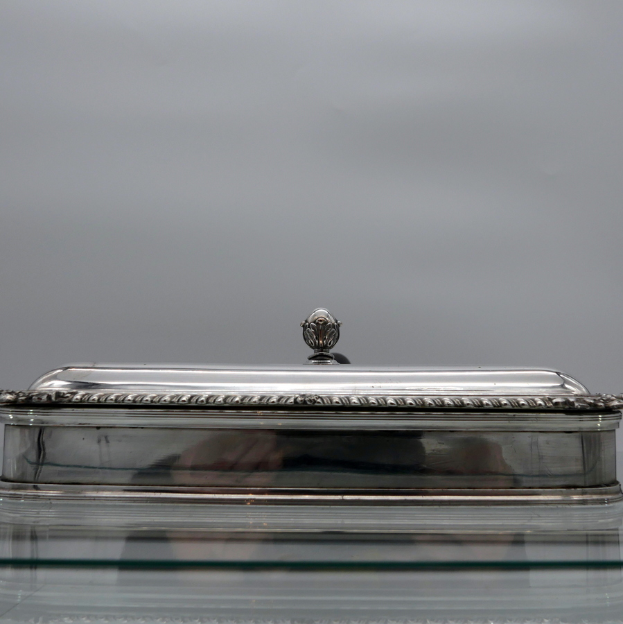 A wonderful early 19th century Old Sheffield plate rectangular cheese dish decorated with a delightful gadroon and floral applied border. Â The silver shielded lid is hinged and the under serving dish has elegant tinning.