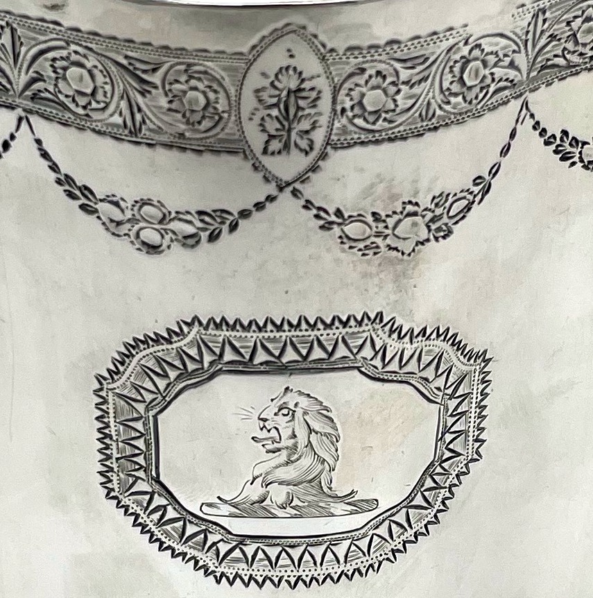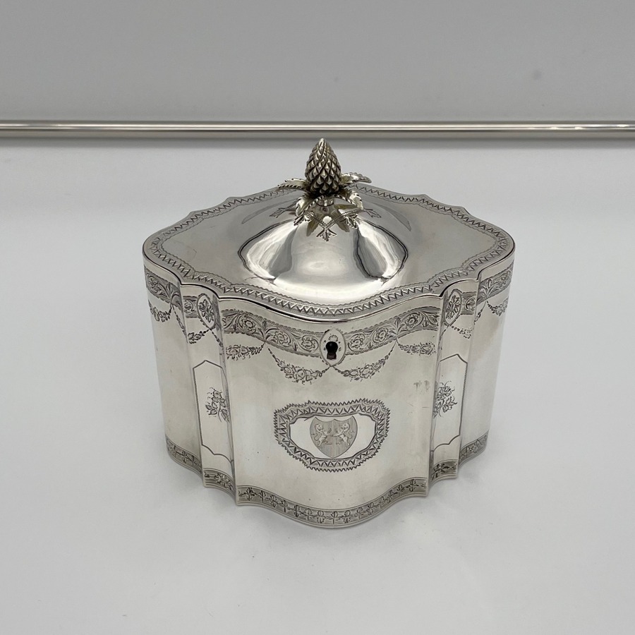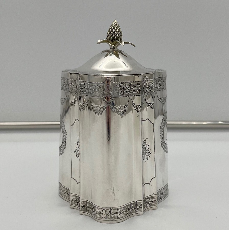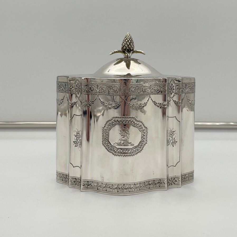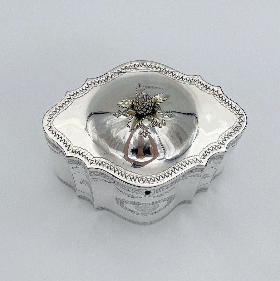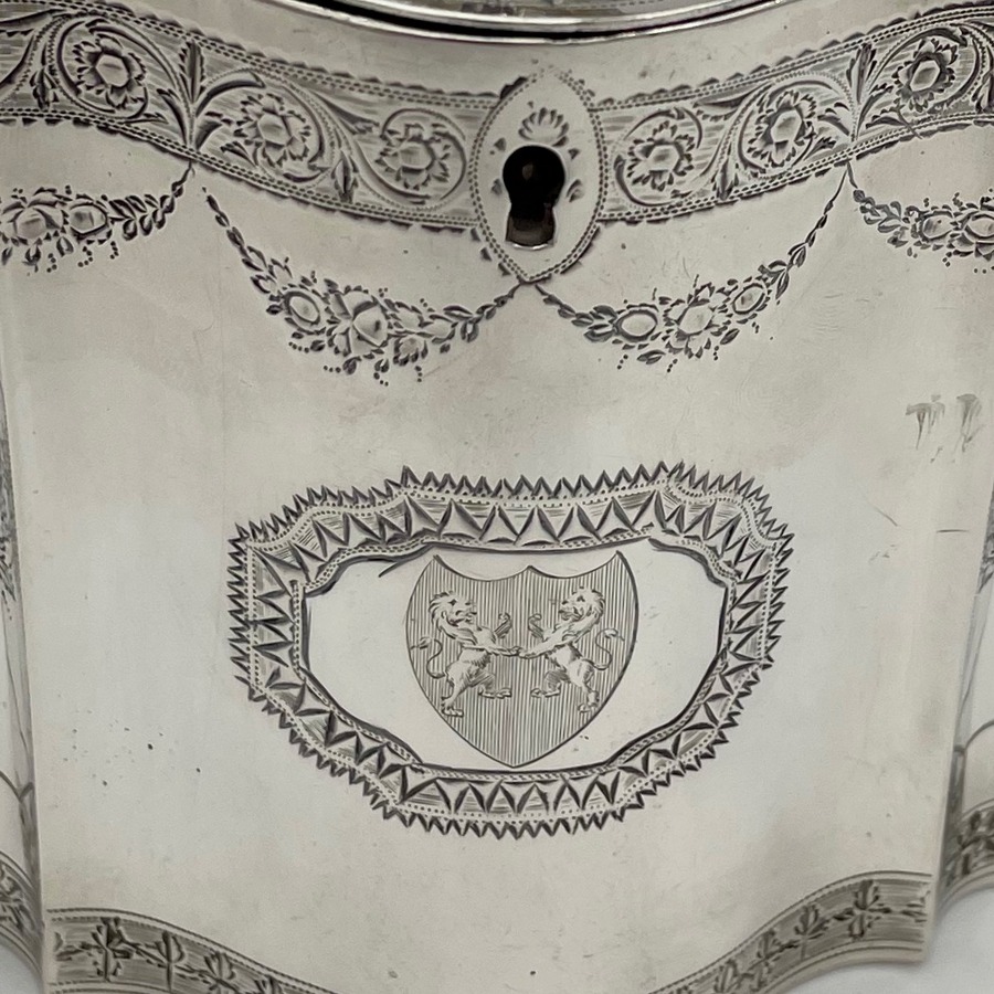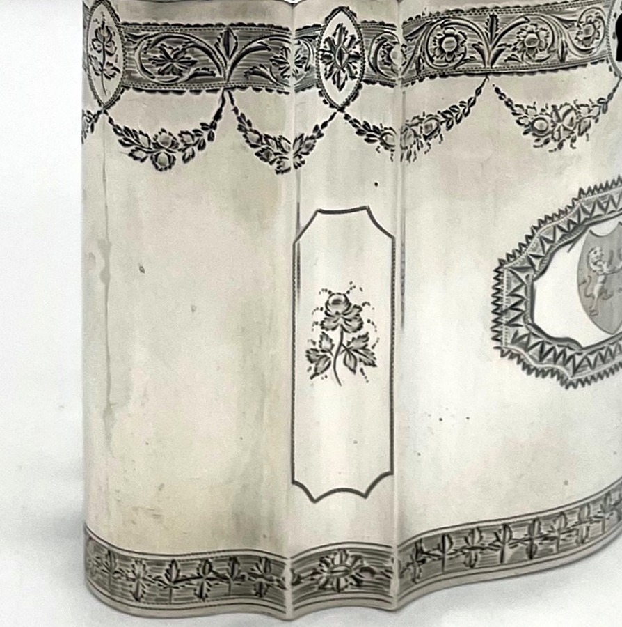 A stunning shaped oval flush hinged Georgian silver tea caddy designed with beautiful curvaceous panels and intricate bright cut engraved borders. There are elegant contemporary hand engraved crest and armorial for importance.