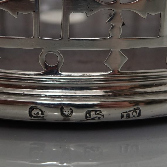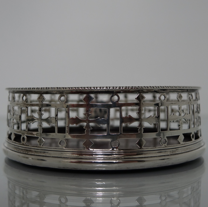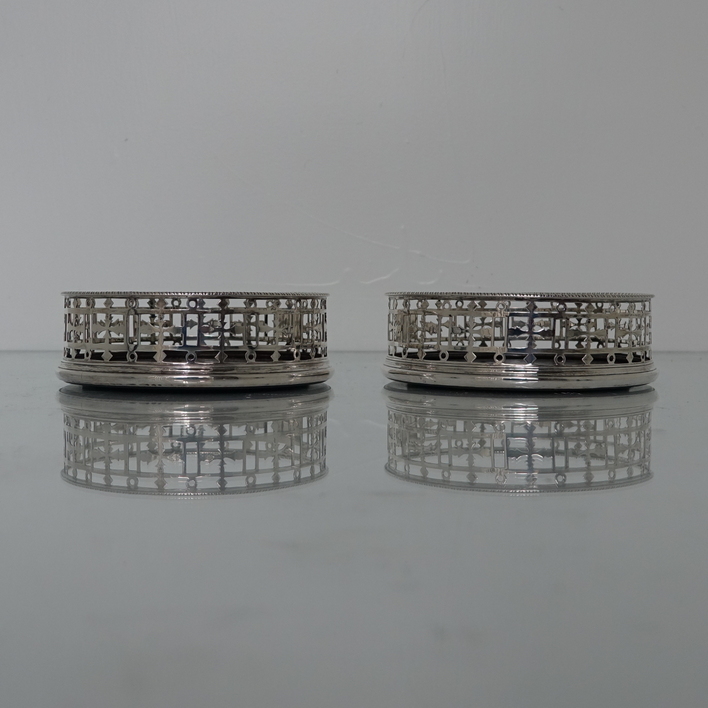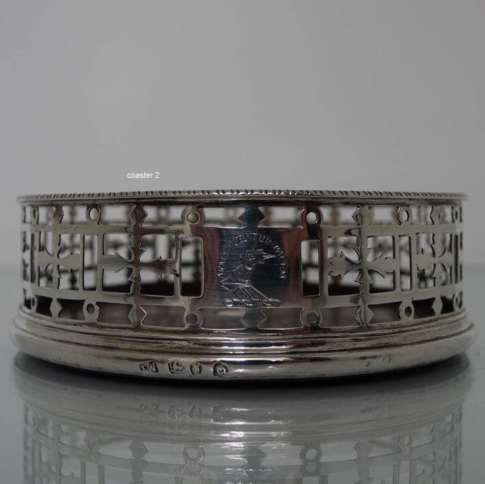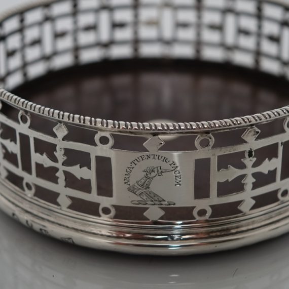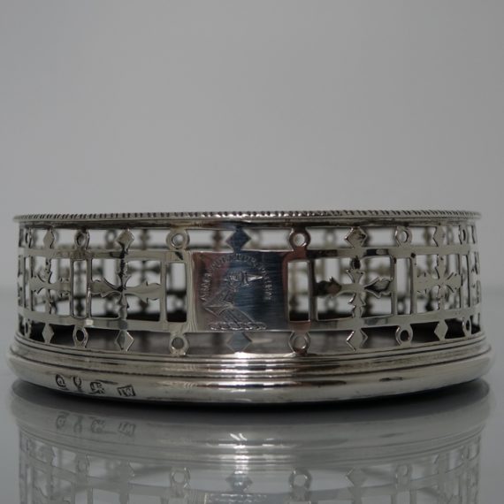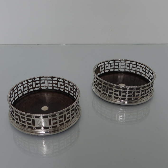 A very stylish pair of wine coasters circular in design. The coasters have been beautifully hand pierced with a gadrooned rim for added decoration and has a contemporary crest. The bases of the coasters are ebony. A very good example of late 18th century craftsmanship.