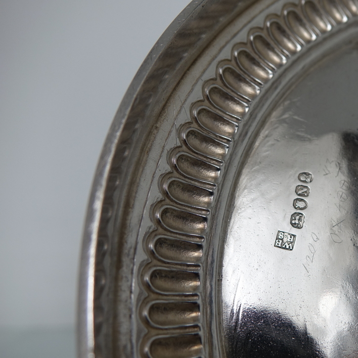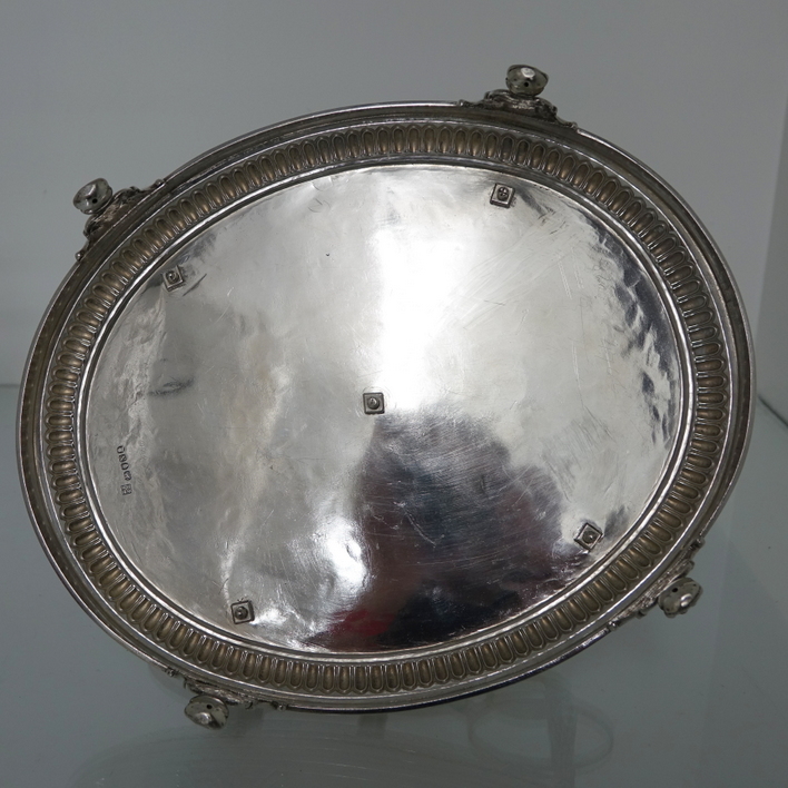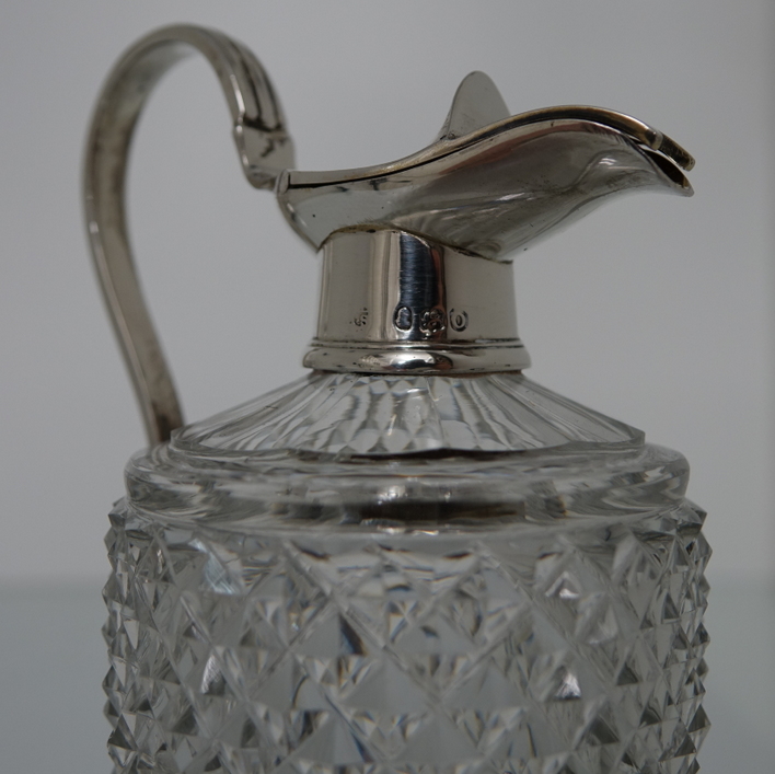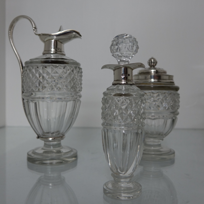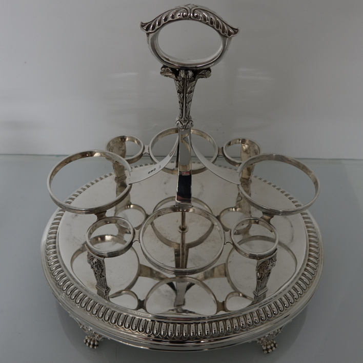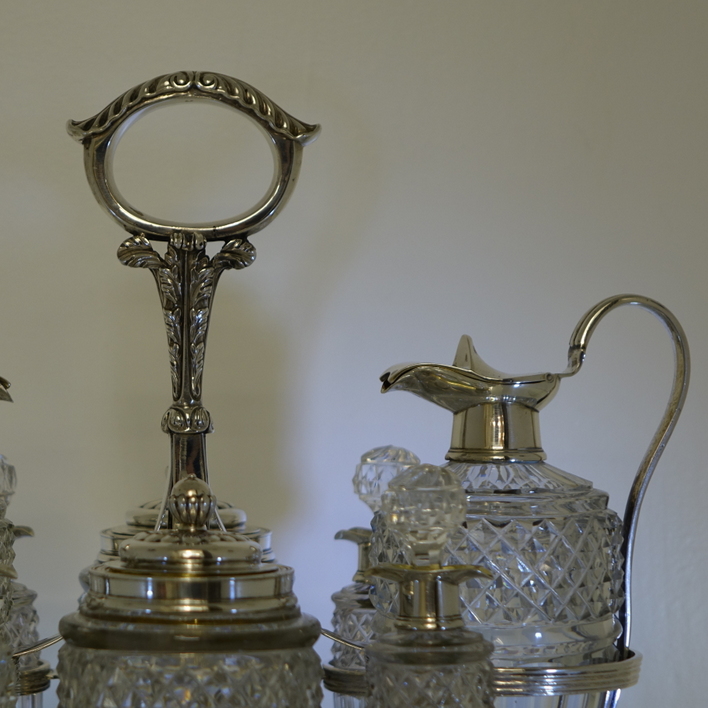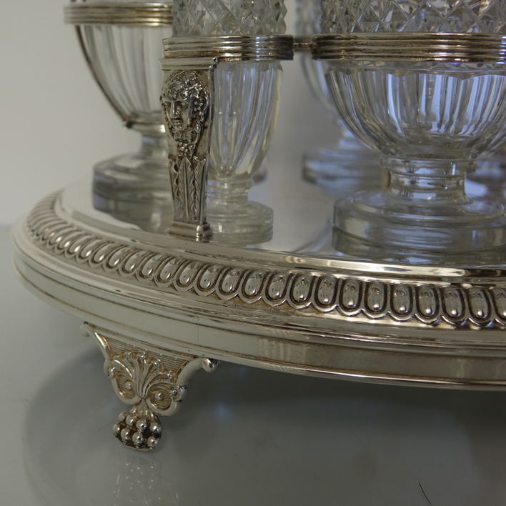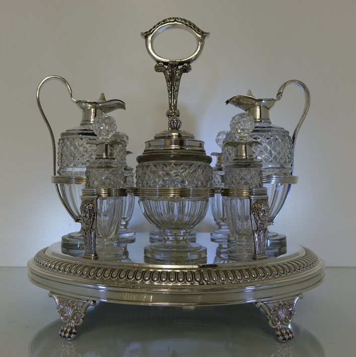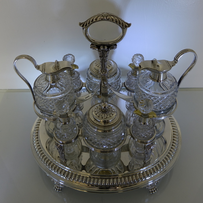 A very large and important looking silver eight bottle oval Georgian cruet. The cruet is very grand in size with a tongue border, cherubs and reeded decoration. The cruet has decorative claw feet and acanthus leaf handle. The glass bottles are hand cut with half fluting and hobnail decoration.