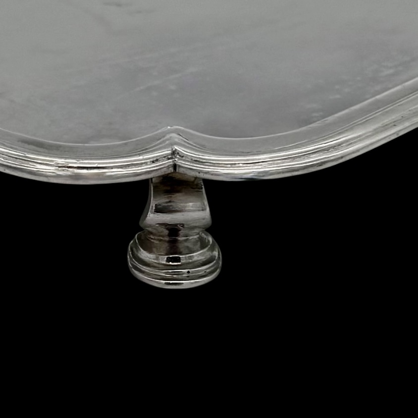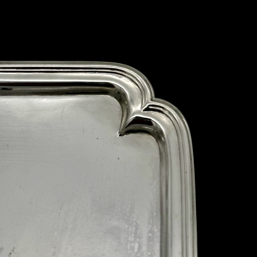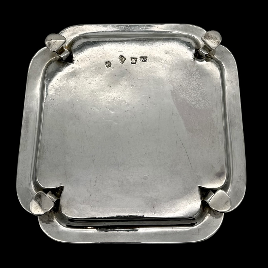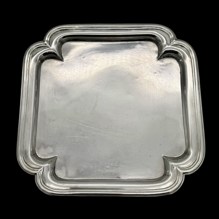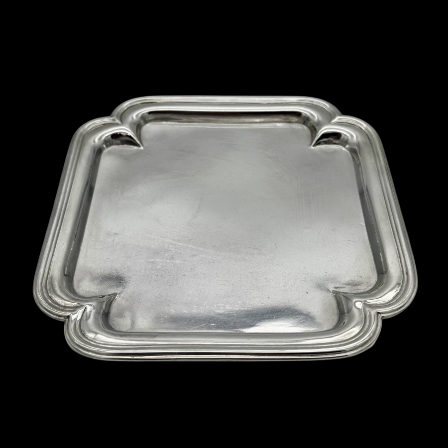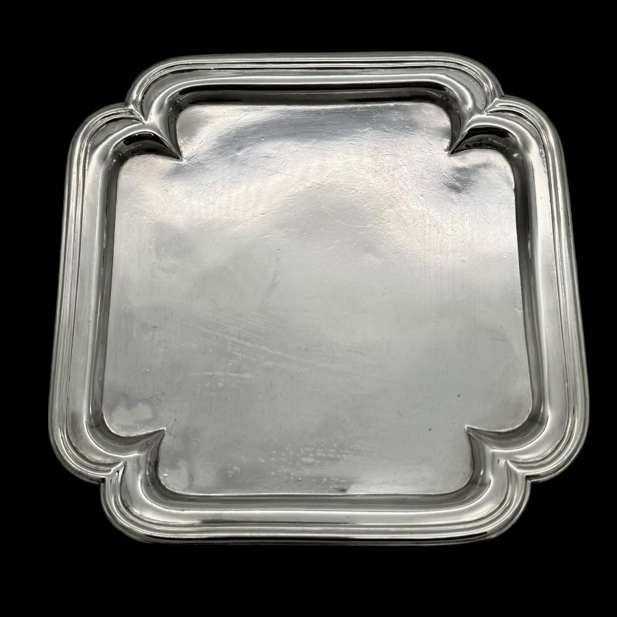 Highly collectable plain formed shaped square silver waiter designed with four elebrate ribs which highlights the outer curvaceous effeminate applied border. Hence the lady silversmith designer.