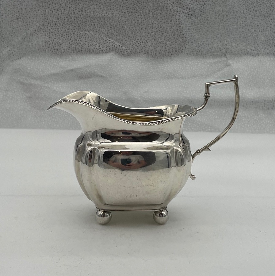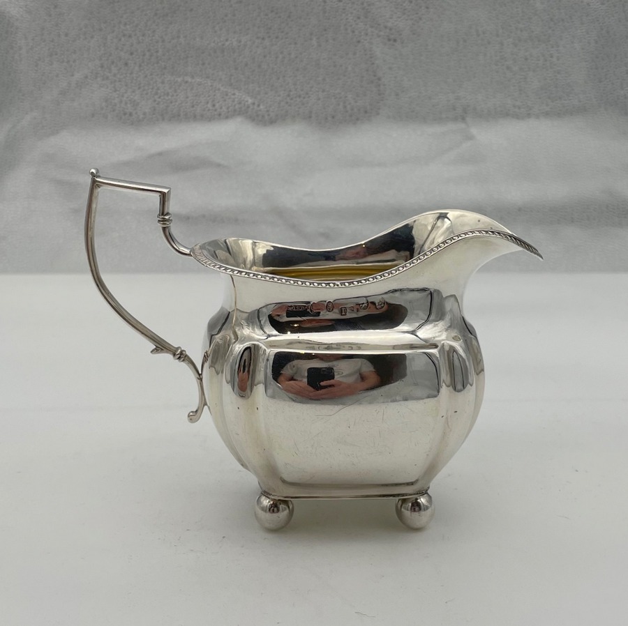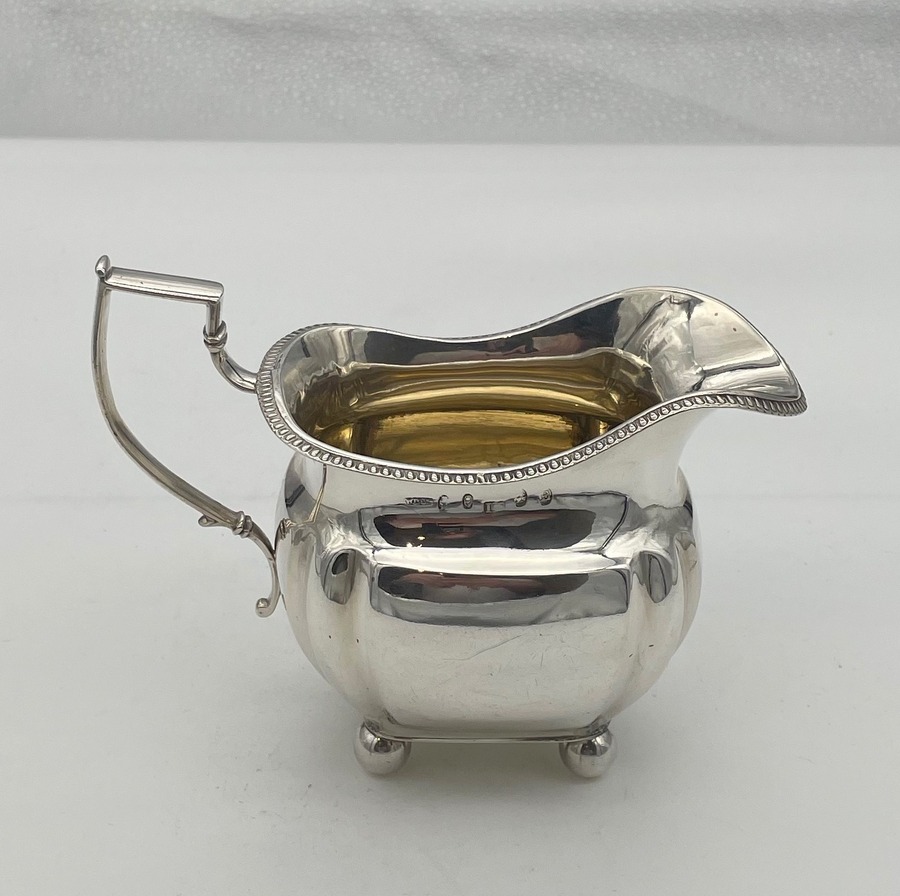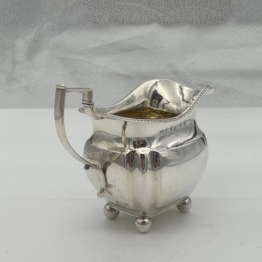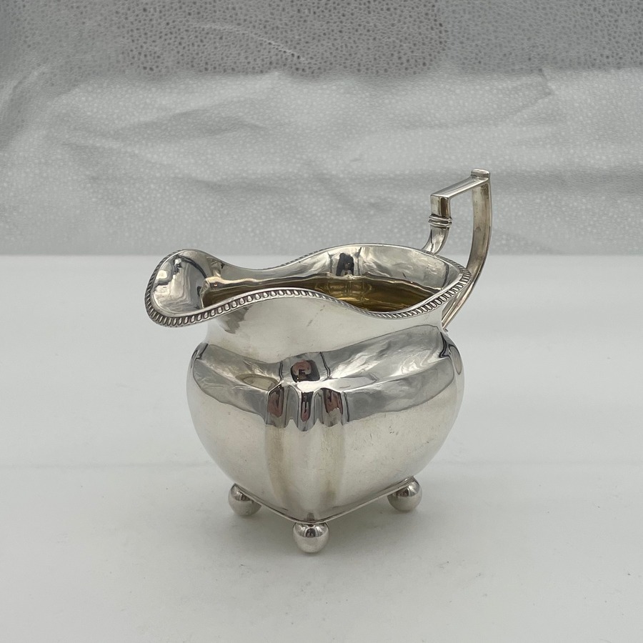 An extremely collectable silver Georgian era Irish shaped oblong cream jug decorated with a beautiful bead border around the lip and sitting on four elegant ball feet.