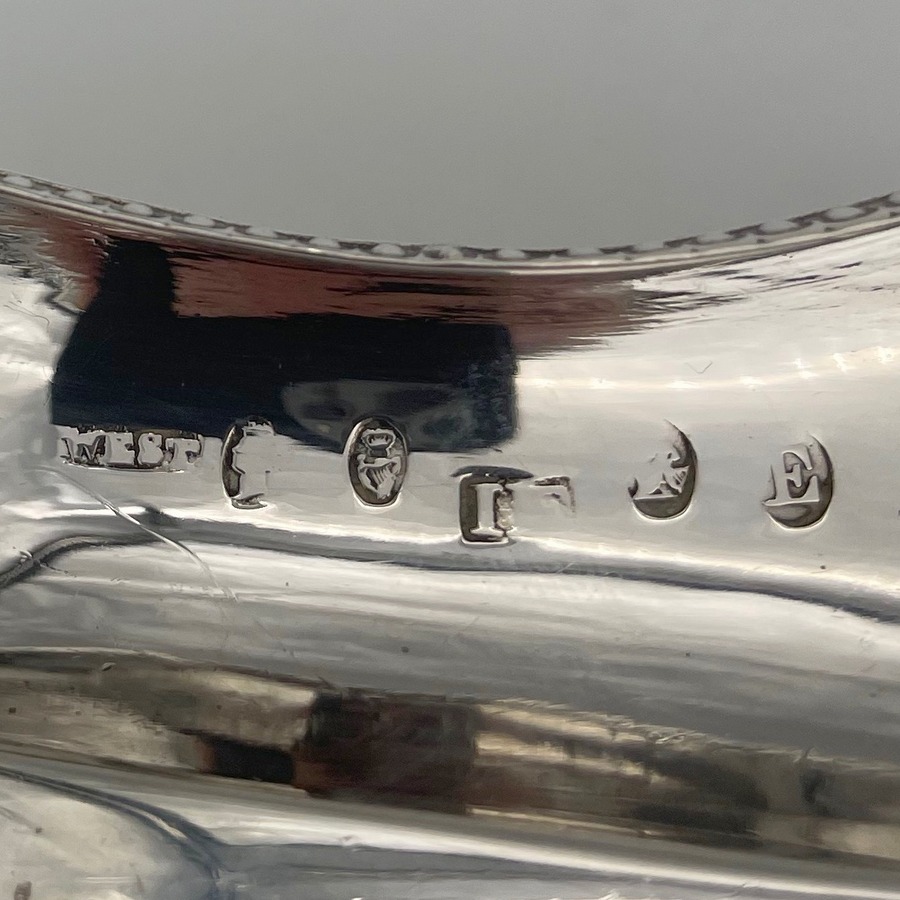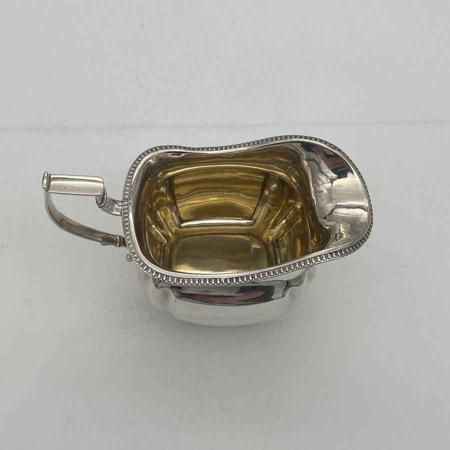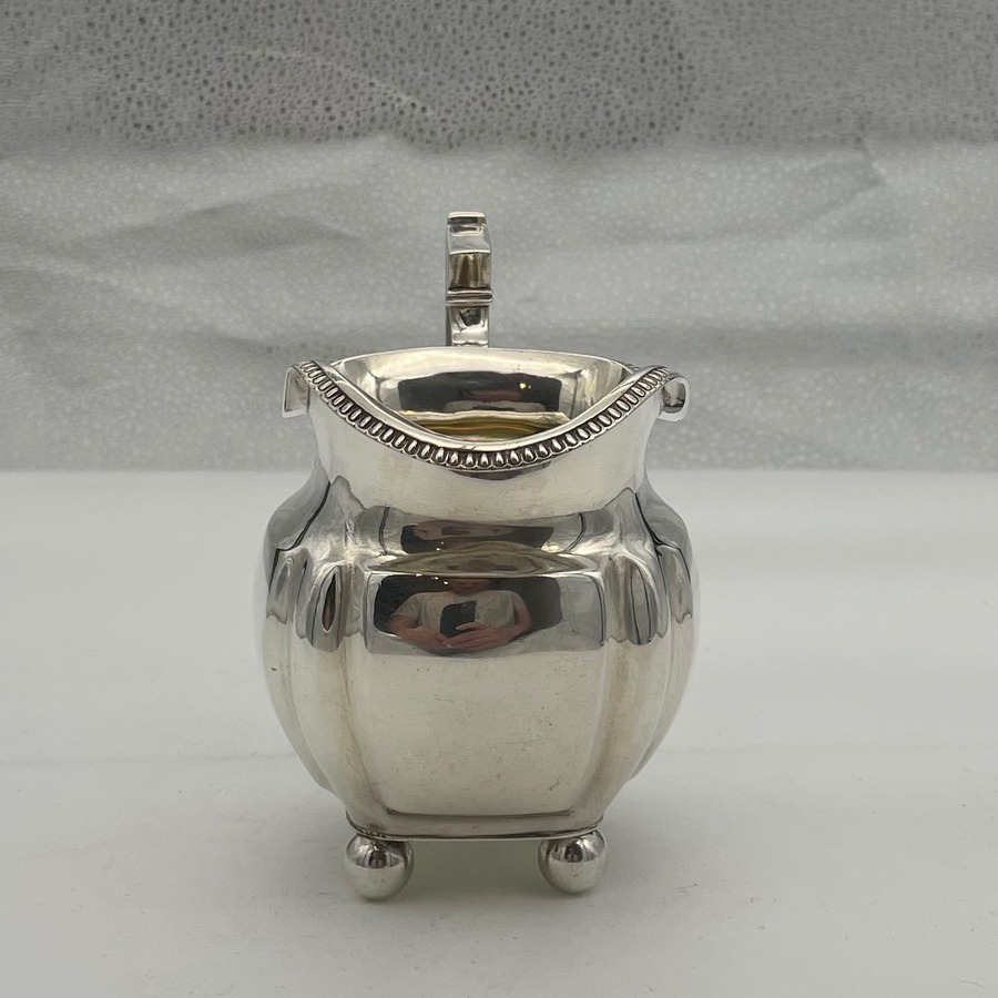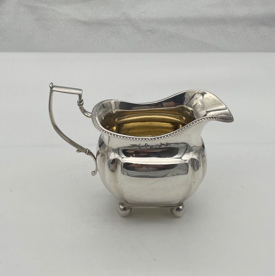 An extremely collectable silver Georgian era Irish shaped oblong cream jug decorated with a beautiful bead border around the lip and sitting on four elegant ball feet.
