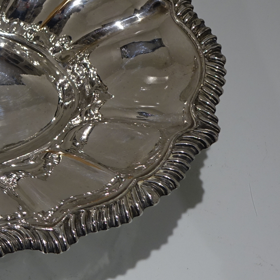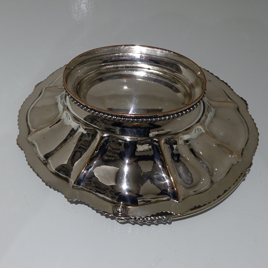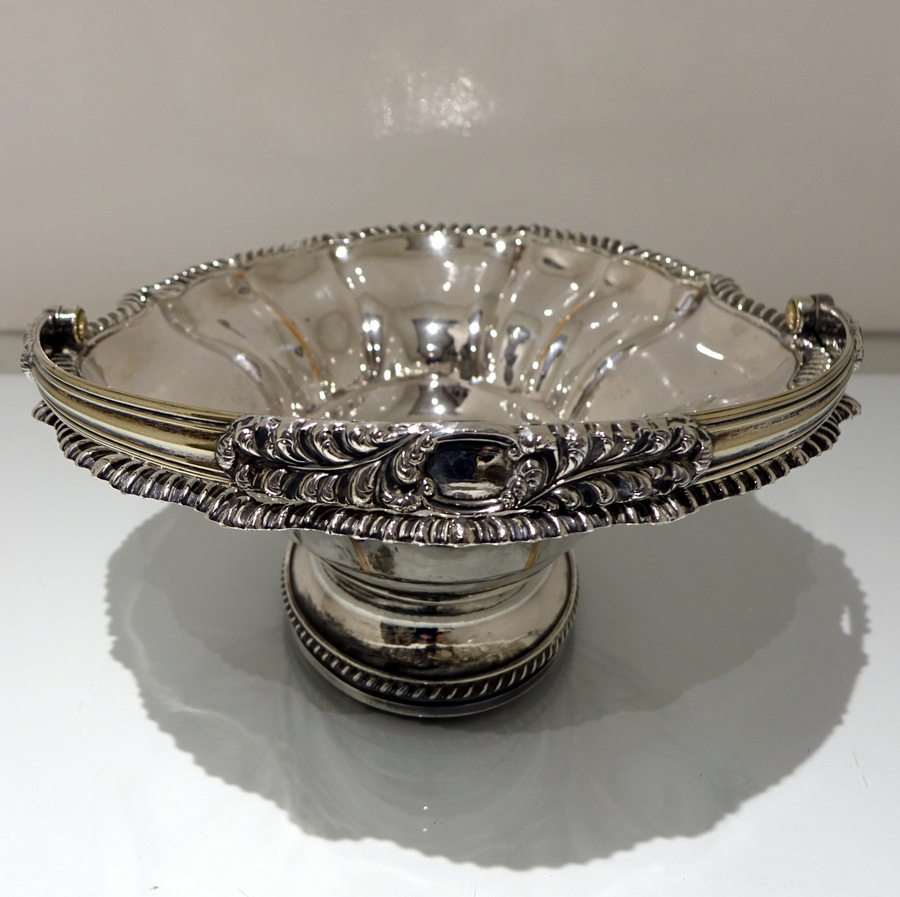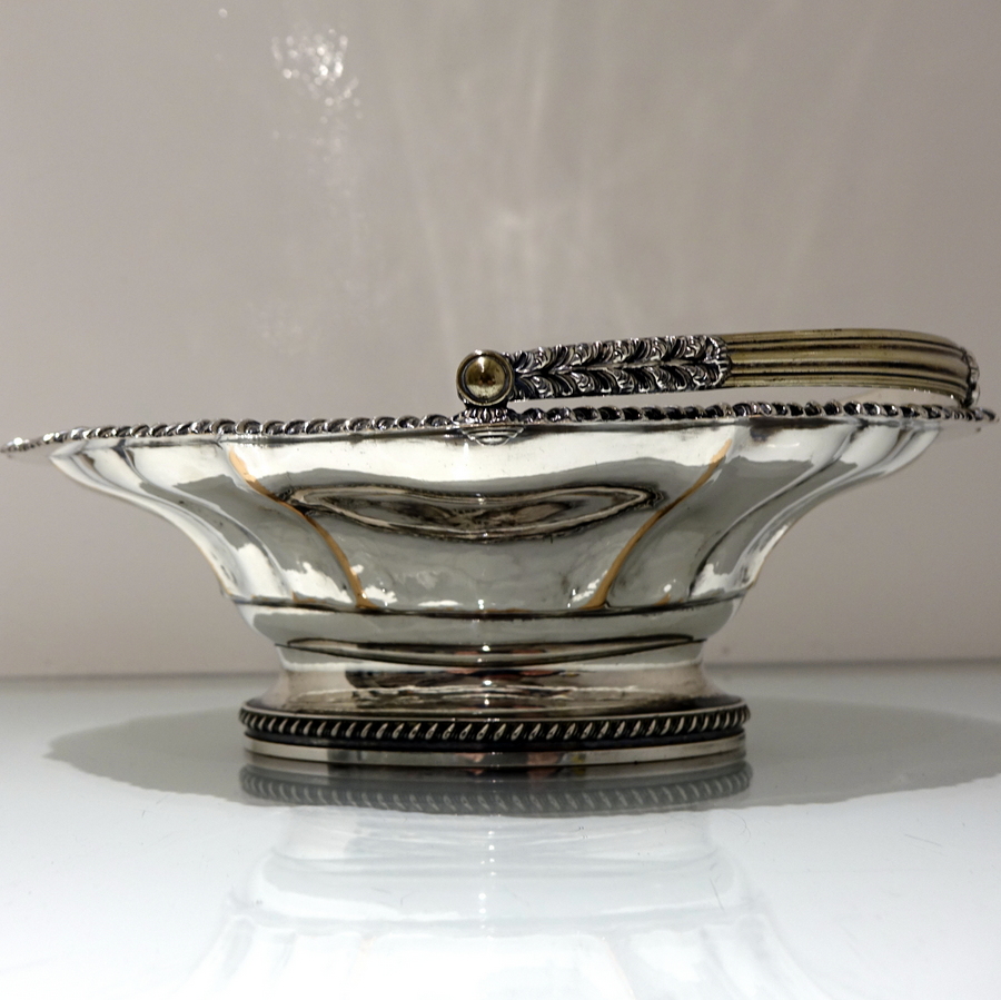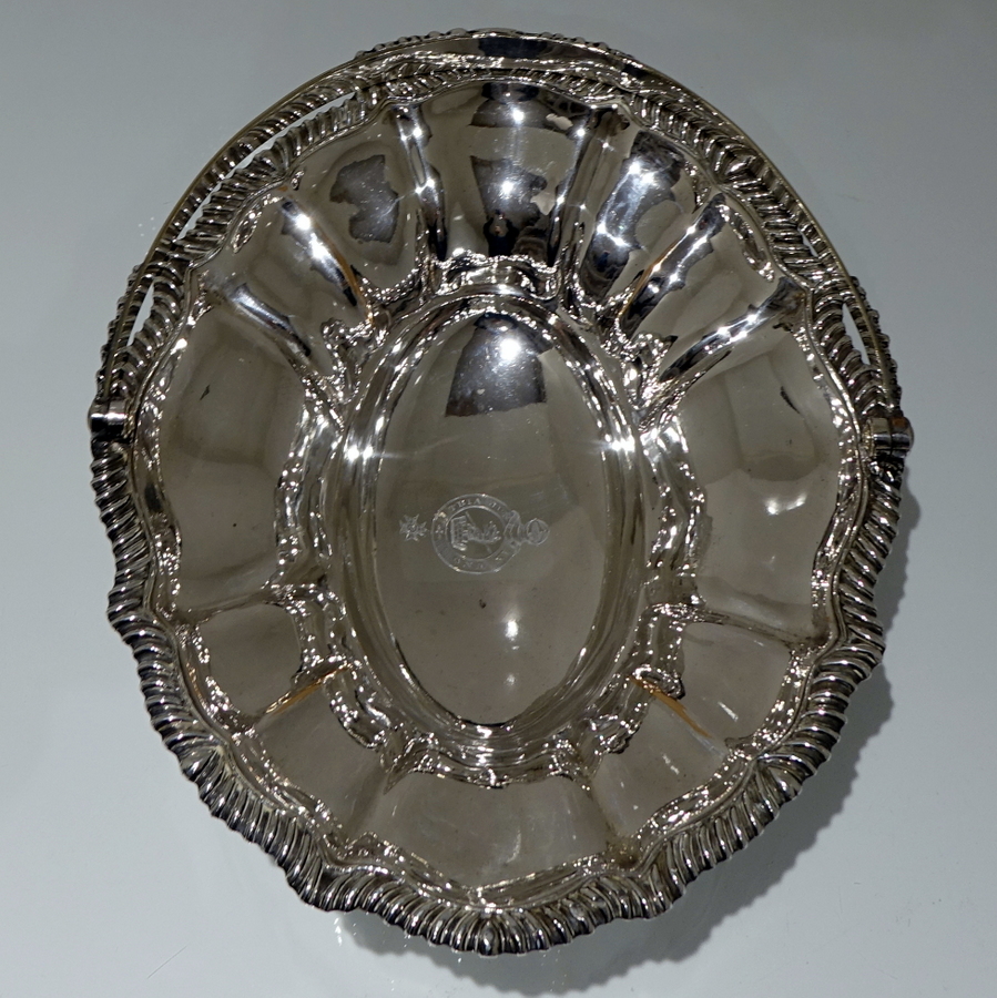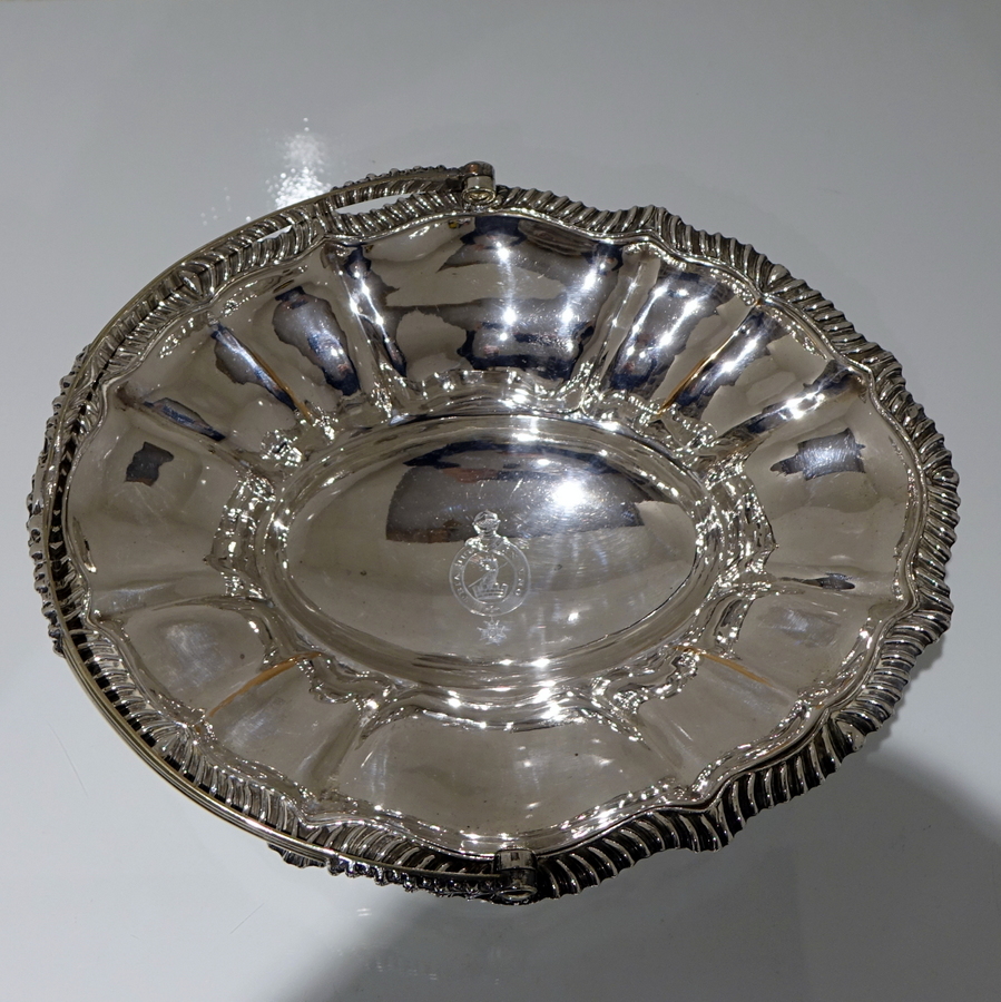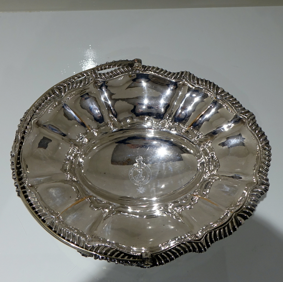 A splendid shaped oval gadroon border swing handled cake basket. Â The basket has an incorporated silver shield in which sits a contemporary regimental crest.