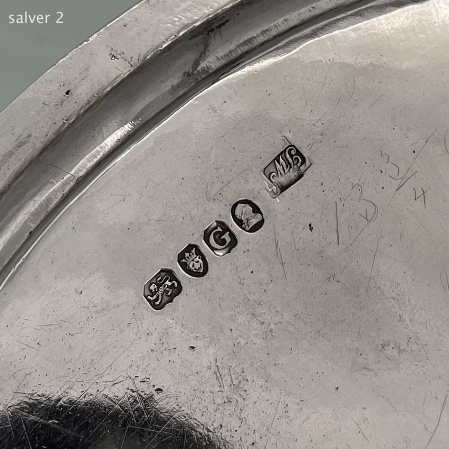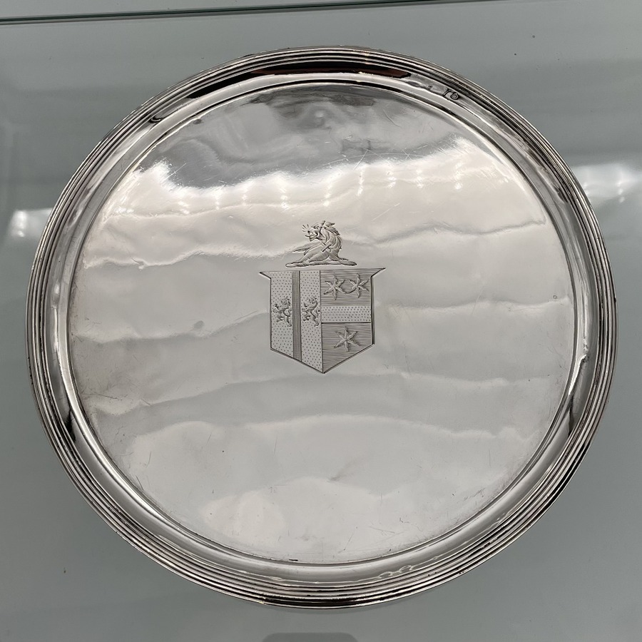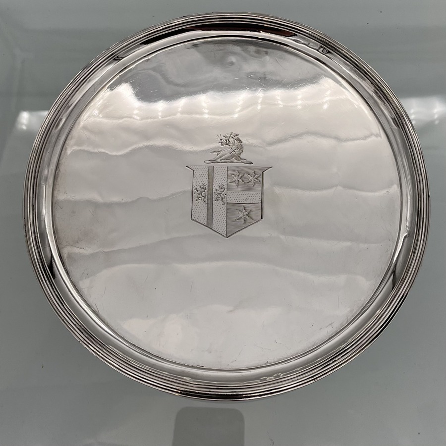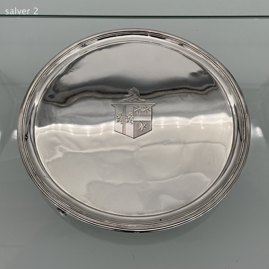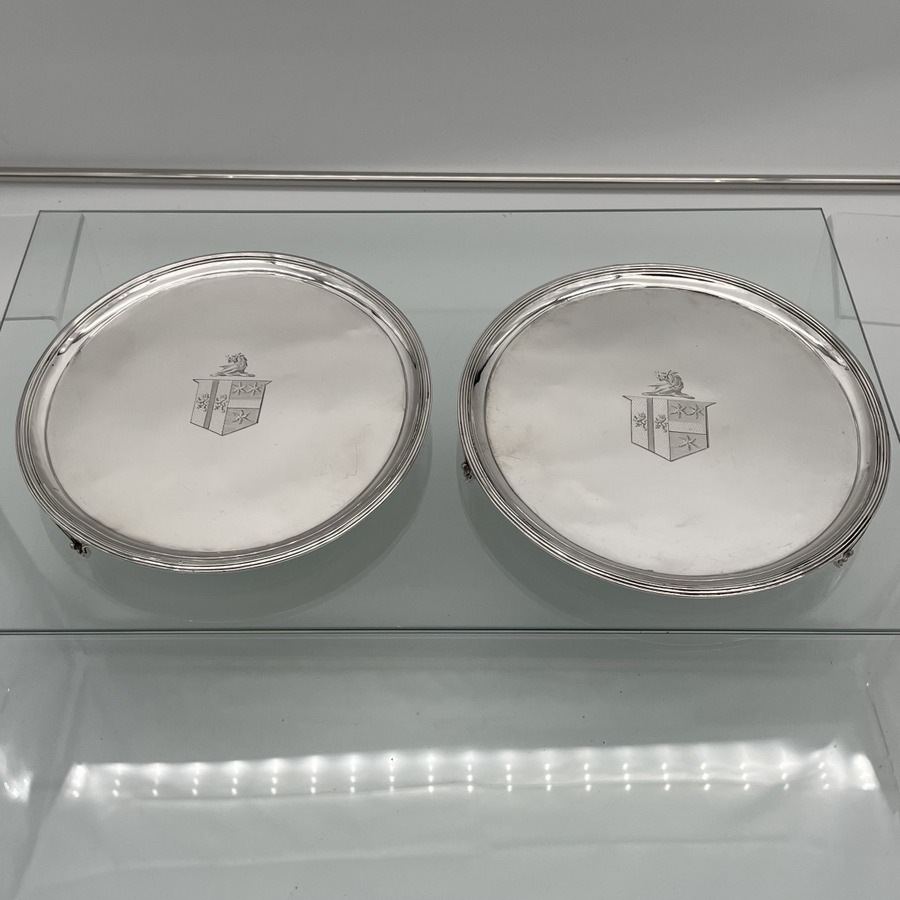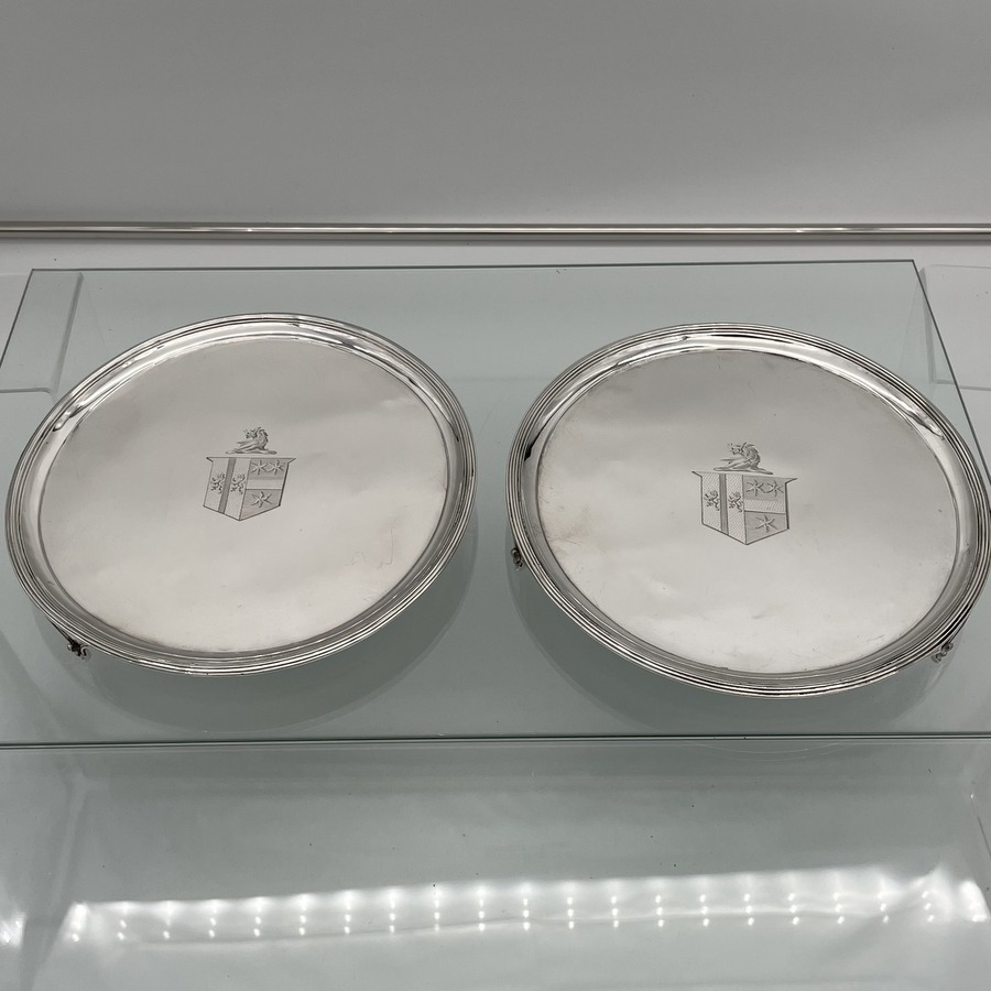 A fine pair of circular silver Georgian salvers elegantly plain formed in design and sitting on three tapering scroll toed feet. Â The centre fronts have beautiful contemporary hand engraved armorials (Naylor/Naylour arms impaled with those of Thwaites) for importance.
