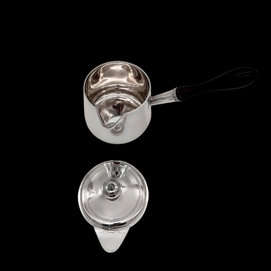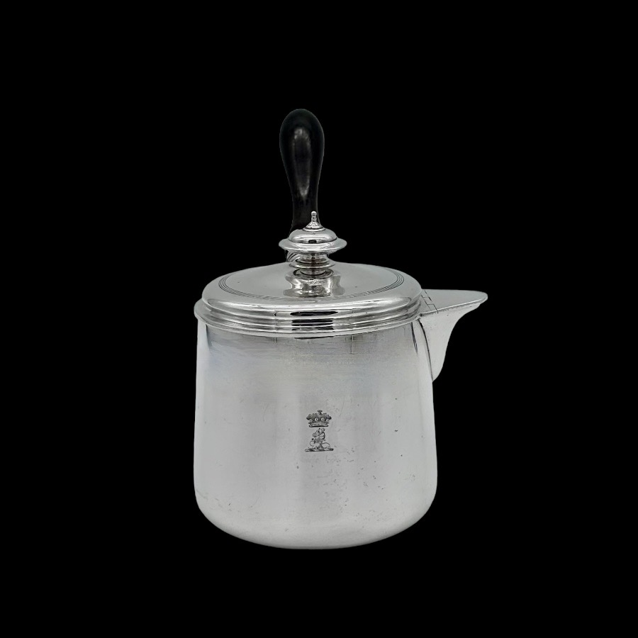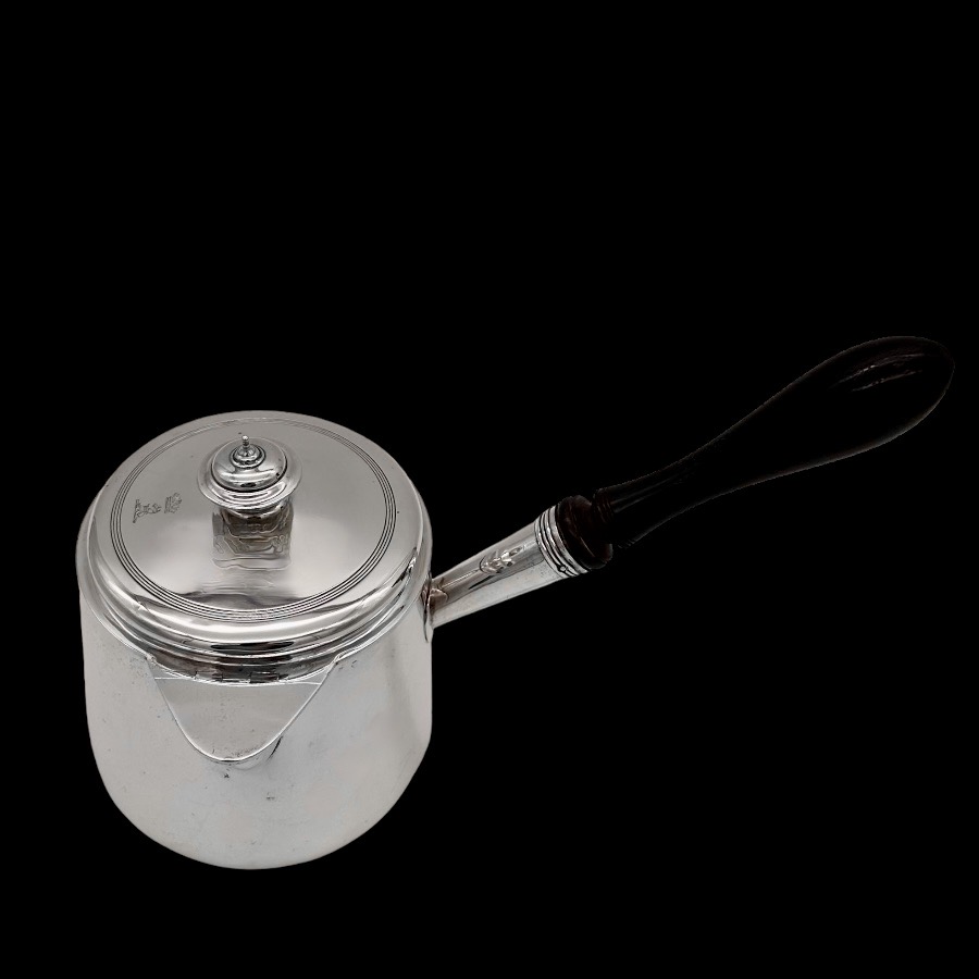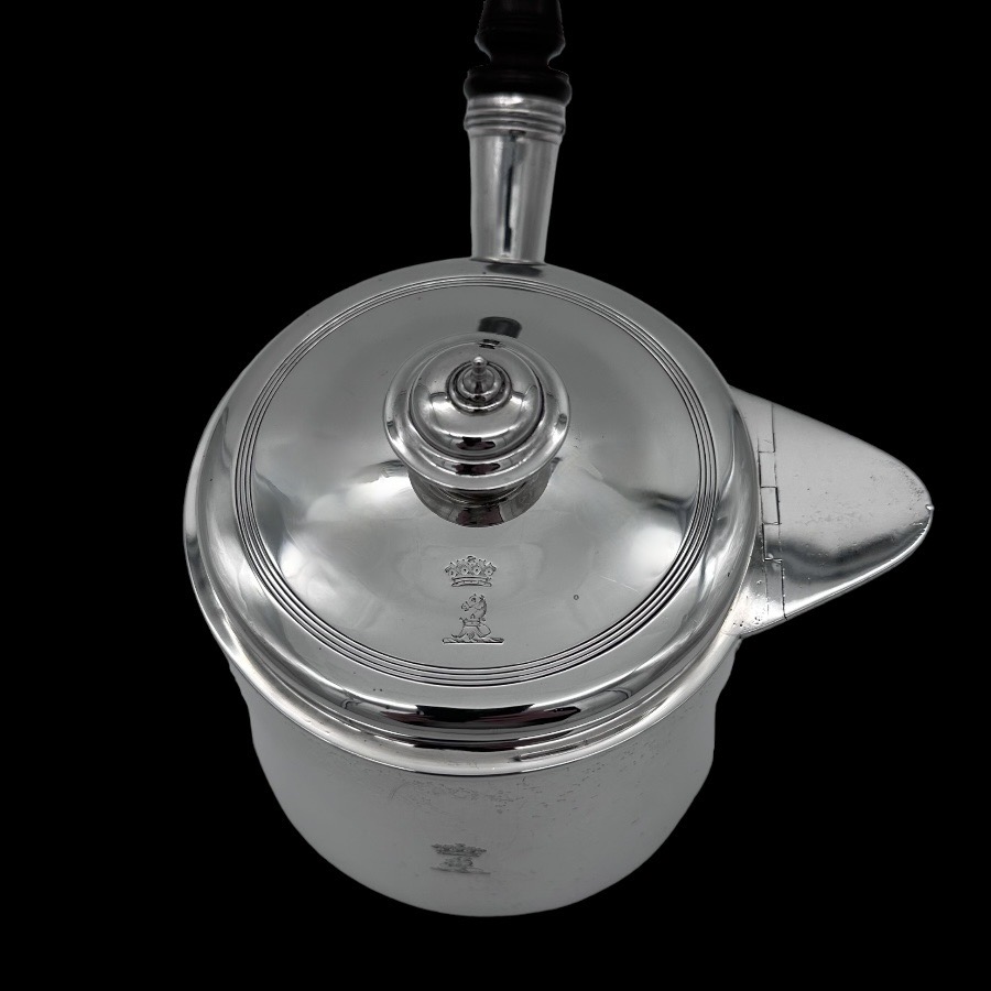 Stunningly beautiful large plain formed George III sterling silver brandy pan designed with straight tapering walls.  The detachable lid has elegant turnings for higlights and the spout is elegantly hinged. There is original matching hand engraved crests for importance.