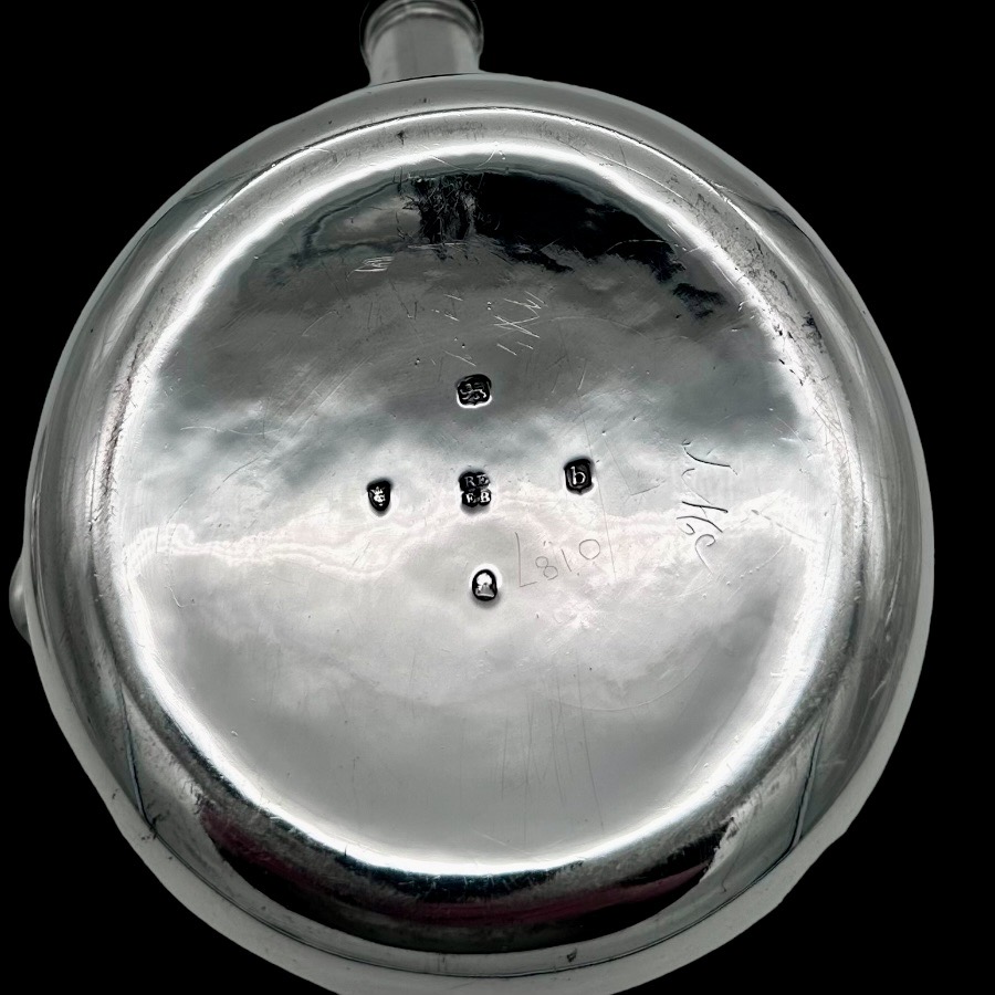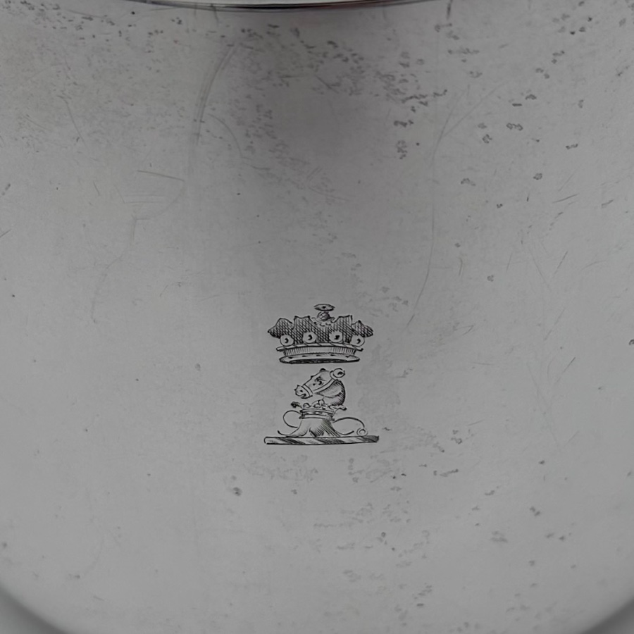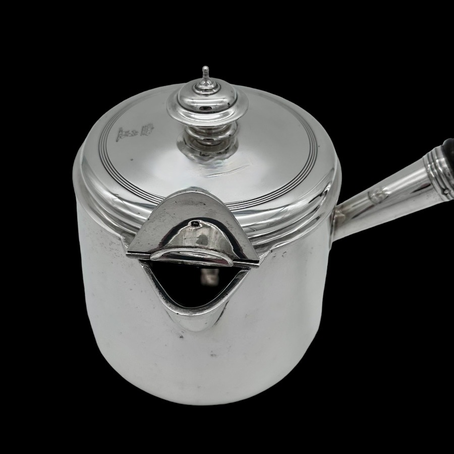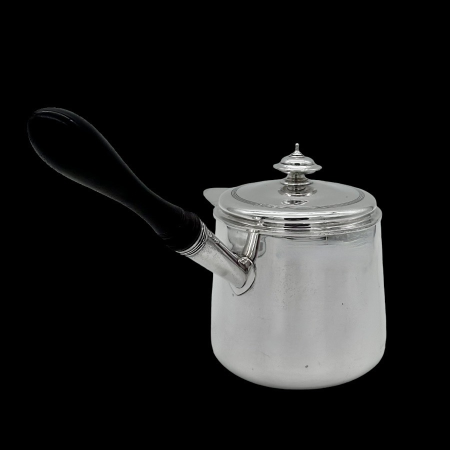 Stunningly beautiful large plain formed George III sterling silver brandy pan designed with straight tapering walls.  The detachable lid has elegant turnings for higlights and the spout is elegantly hinged. There is original matching hand engraved crests for importance.