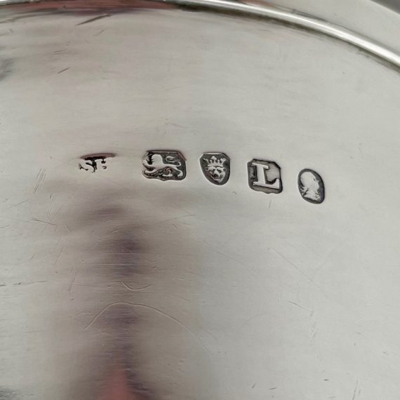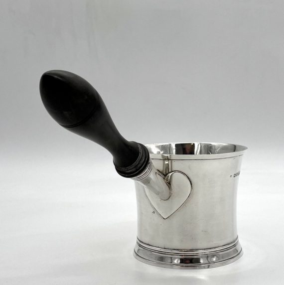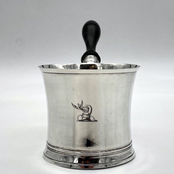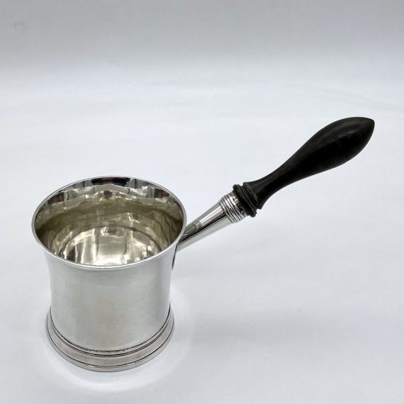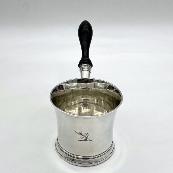 Truly beautiful Georgian silver brandy pan designed with an elegant tapering bowl and a stylishly shaped fruitwood handle. The centre front of the bowl has a beautiful contemporary hand engraved crest for importance.