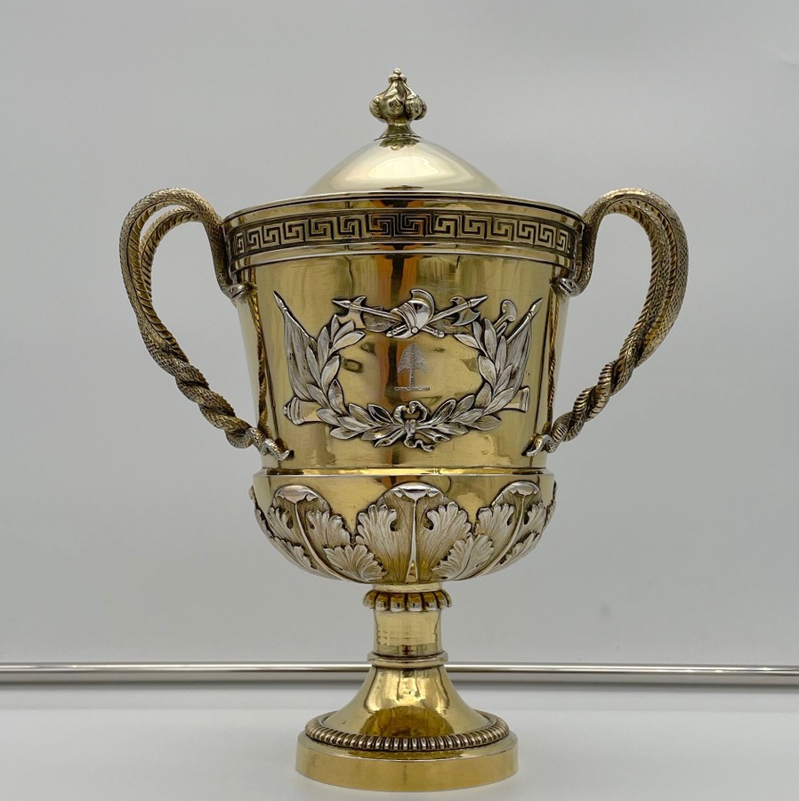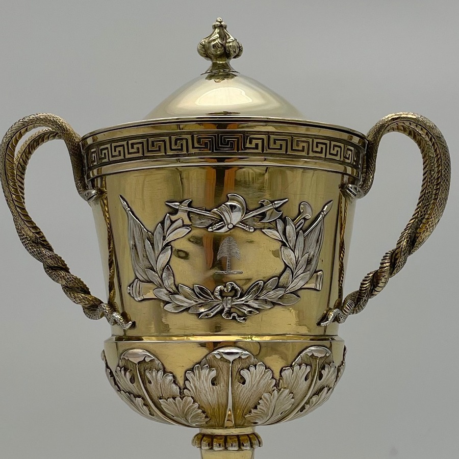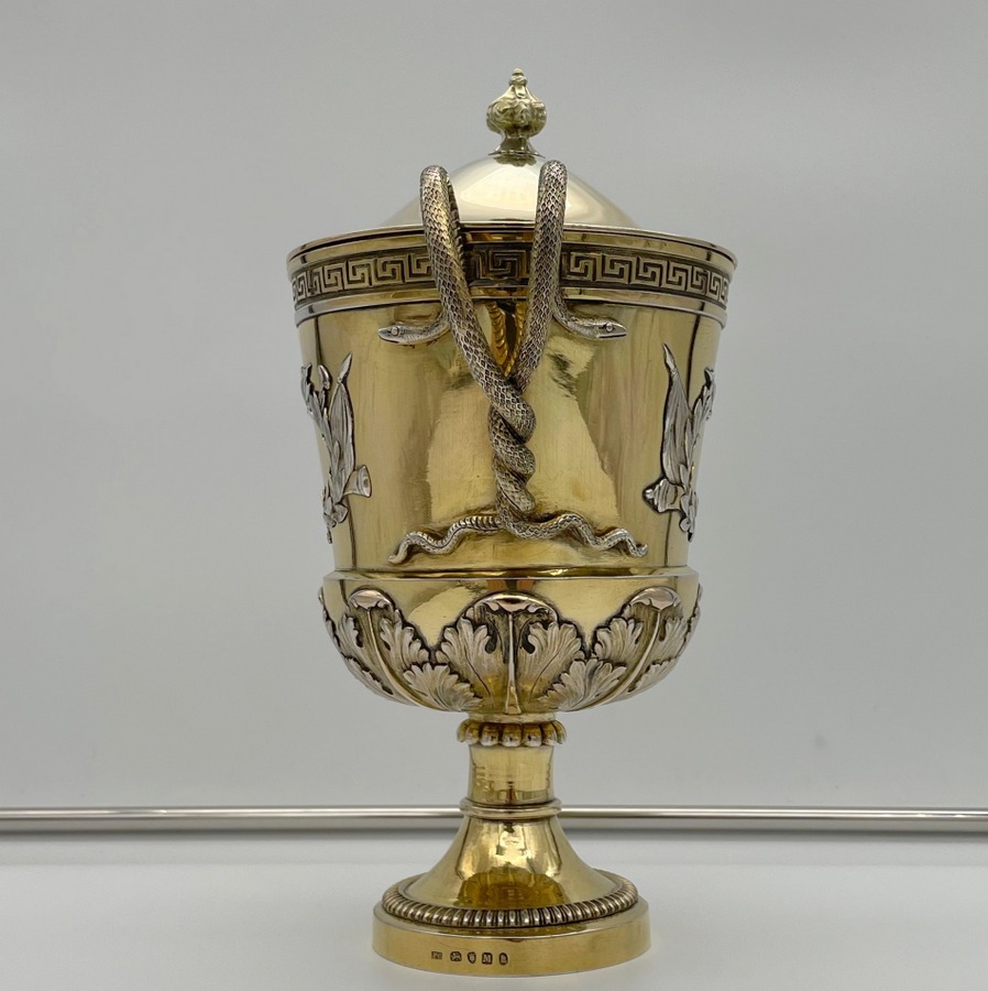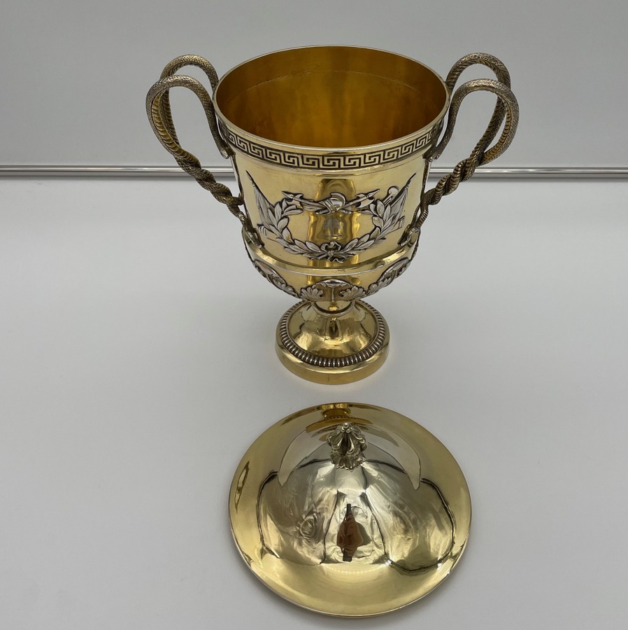 Truly stunning silver gilt Georgian cup and cover decorated with stunning applied floral wreath cartouches crowned with impressive battle regalia. There is a beautiful eye catching upper Greek key border and wonderful lower cast acanthus leaf style base. The cup has delightful entwined serpent scroll handles and sweet hand engraved contemporary crests for importance.