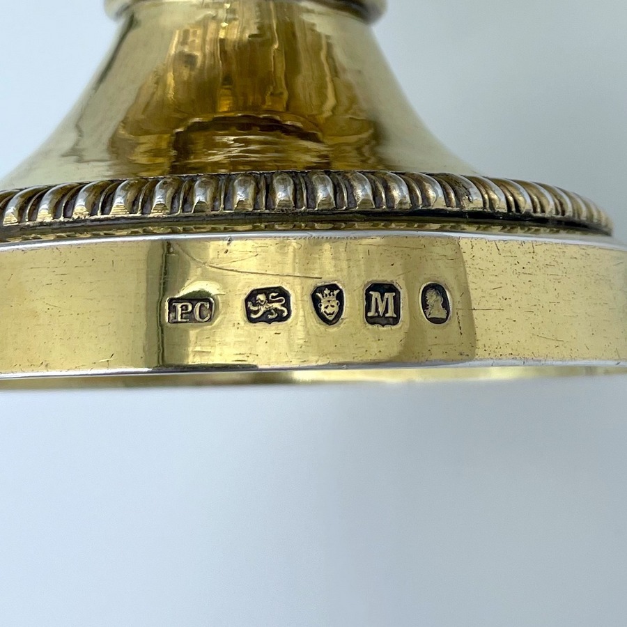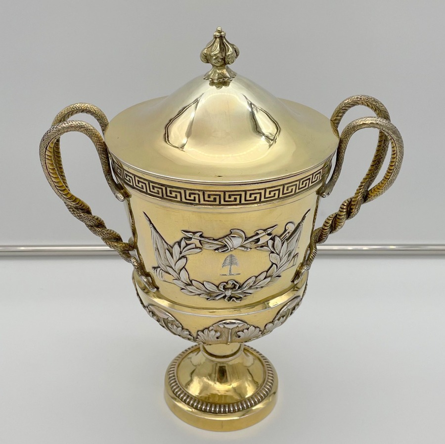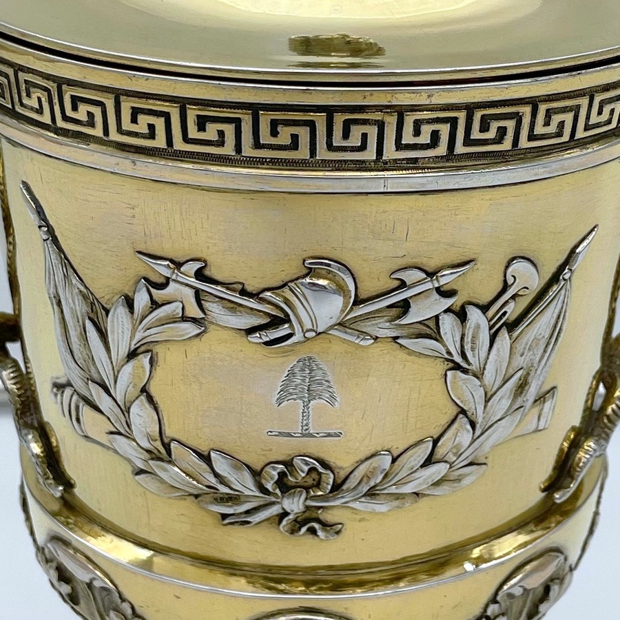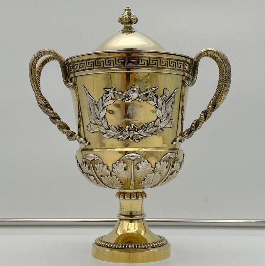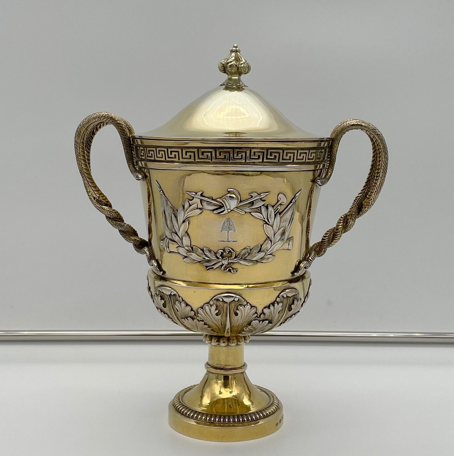 Truly stunning silver gilt Georgian cup and cover decorated with stunning applied floral wreath cartouches crowned with impressive battle regalia. There is a beautiful eye catching upper Greek key border and wonderful lower cast acanthus leaf style base. The cup has delightful entwined serpent scroll handles and sweet hand engraved contemporary crests for importance.