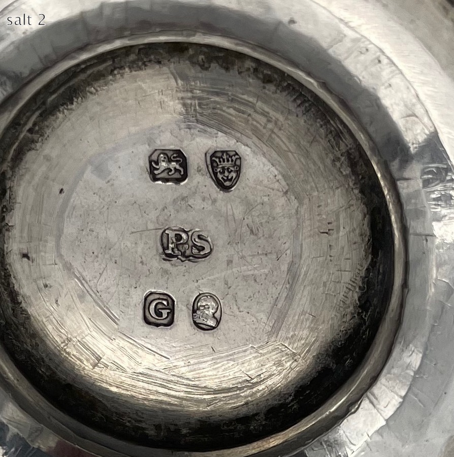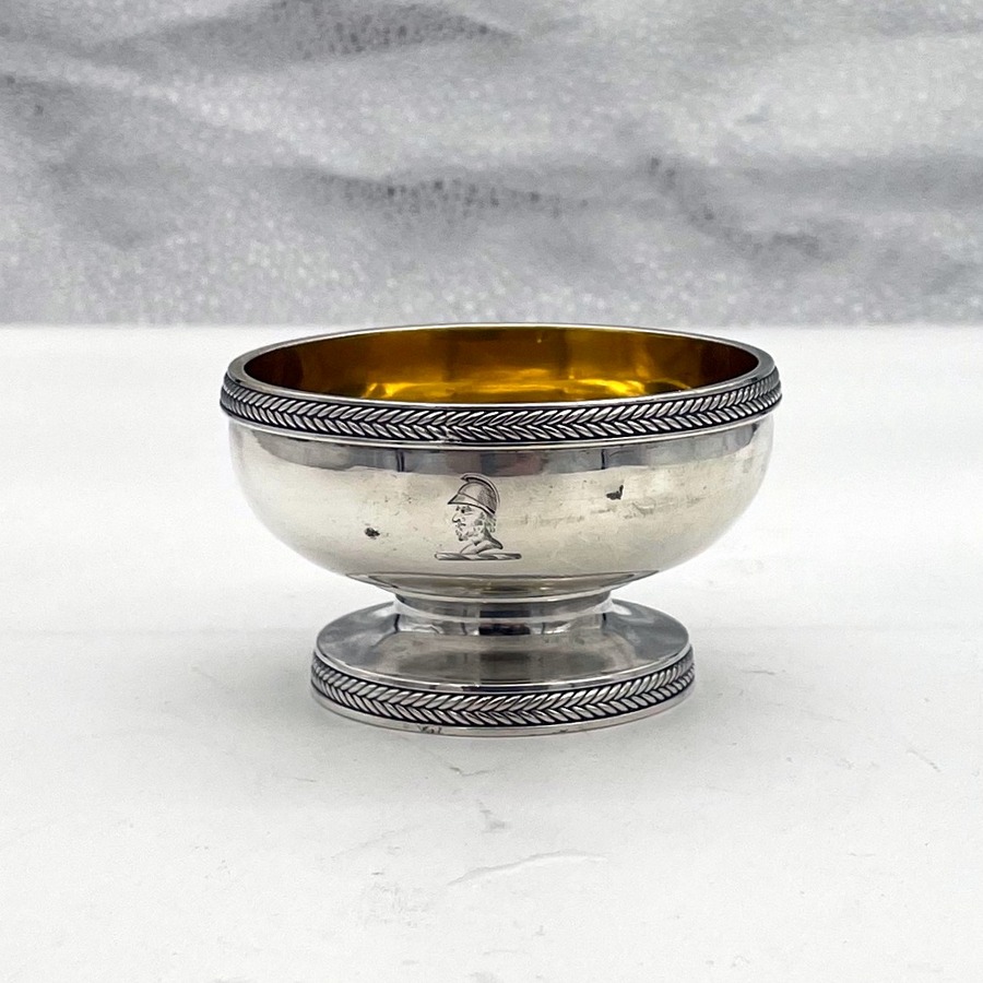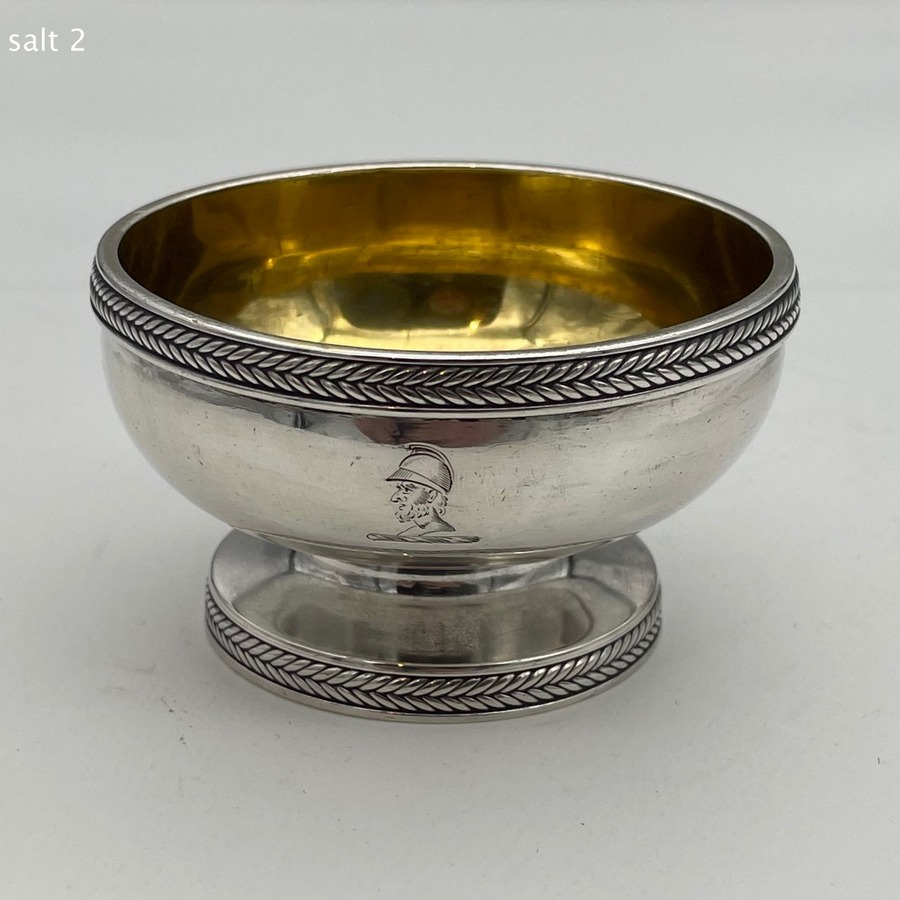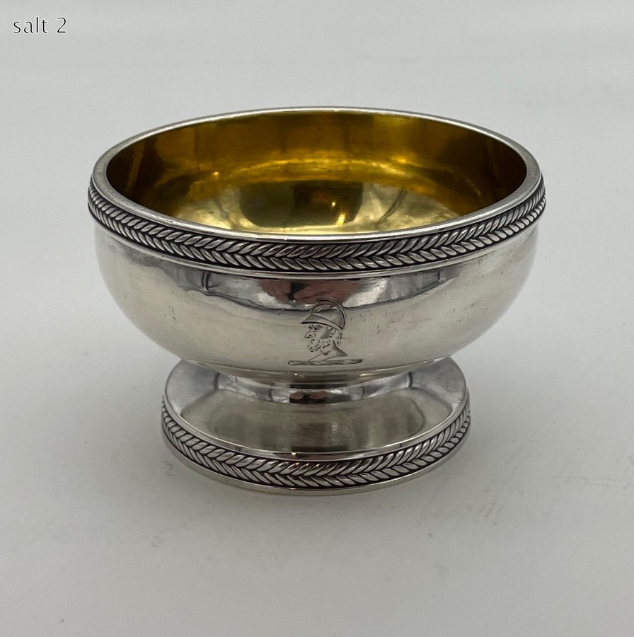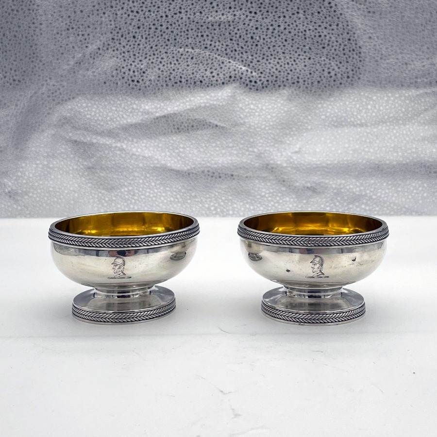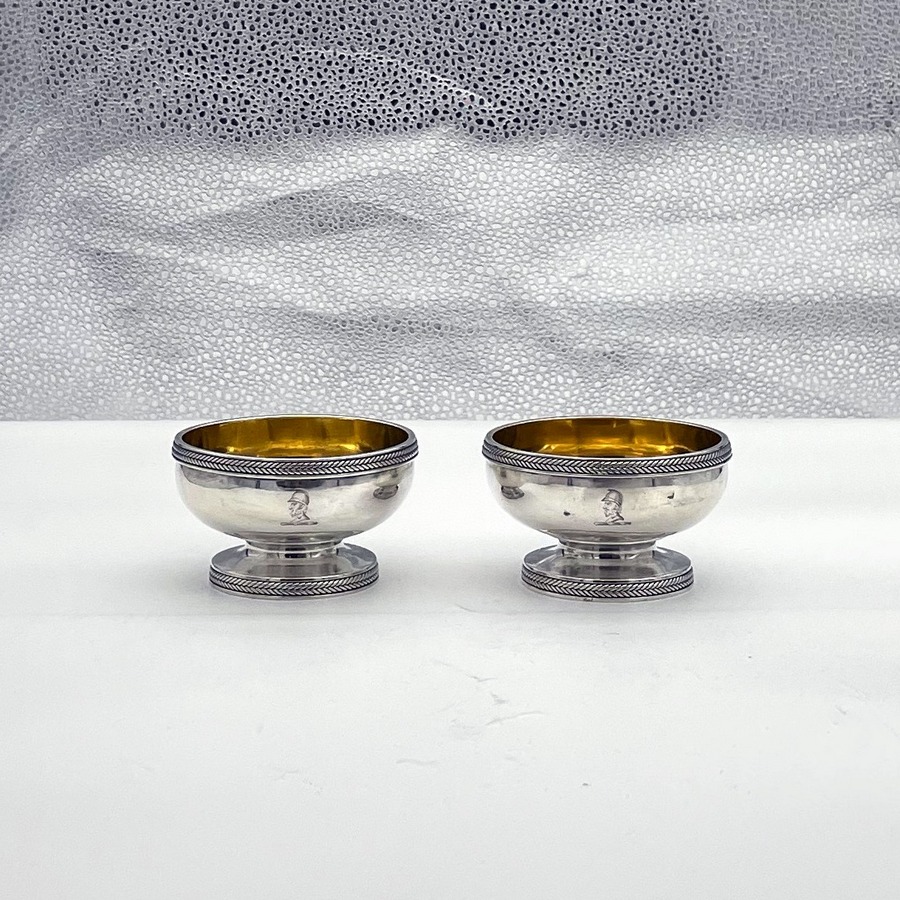 A rare and highly collectable pair of Georgian circular salt cellars made by the famous silversmith Paul Storr. Â The salts are decorated with strikingly beautiful upper and lower applied borders and central hand engraved contemporary crests for importance.