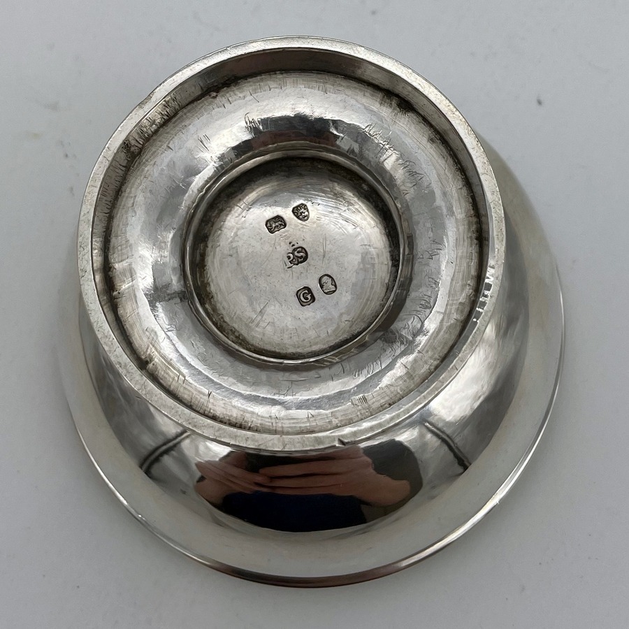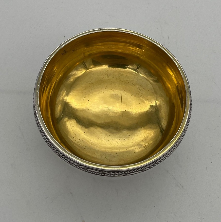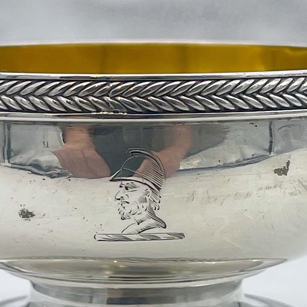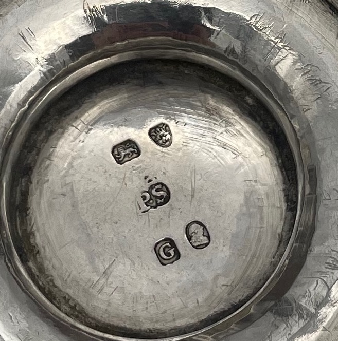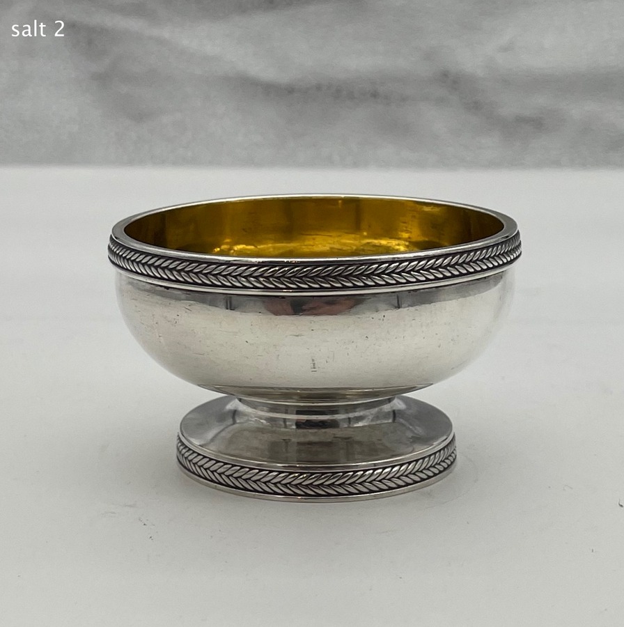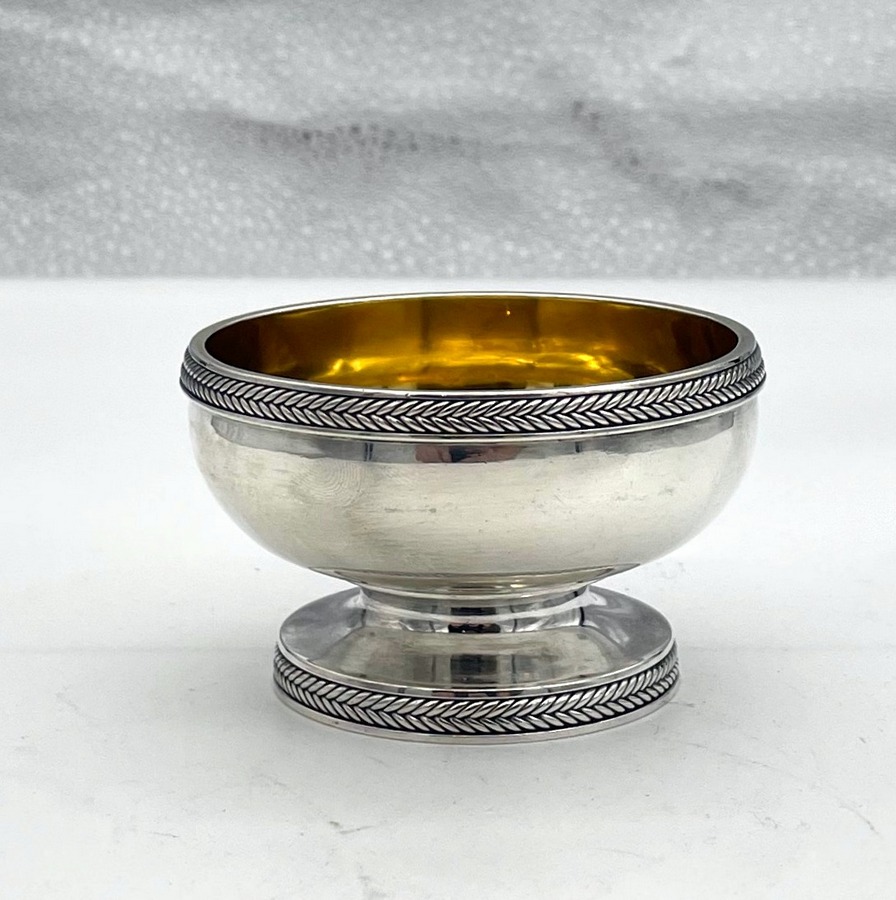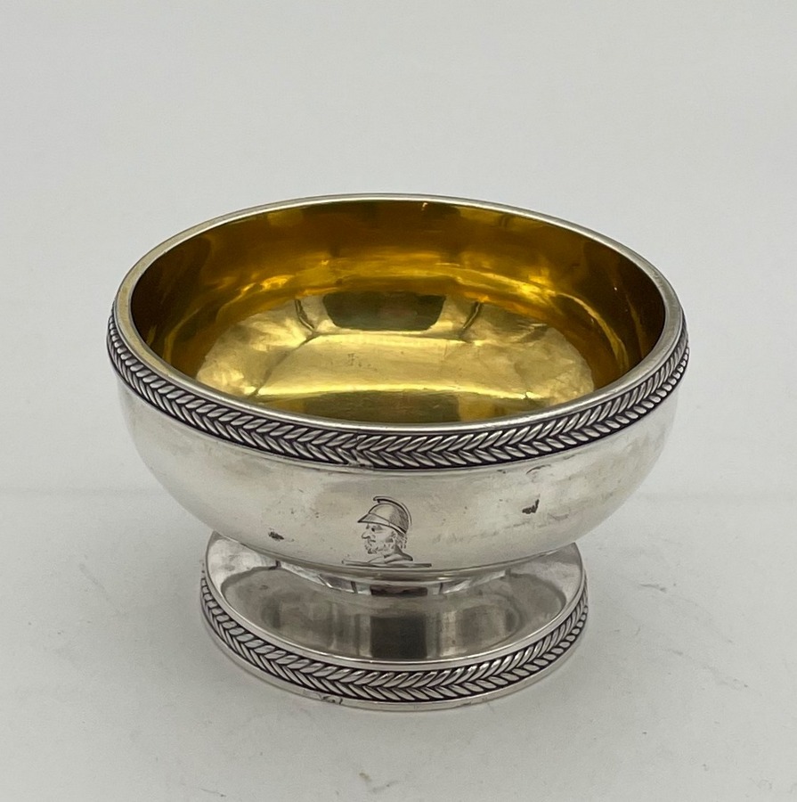A rare and highly collectable pair of Georgian circular salt cellars made by the famous silversmith Paul Storr. Â The salts are decorated with strikingly beautiful upper and lower applied borders and central hand engraved contemporary crests for importance.