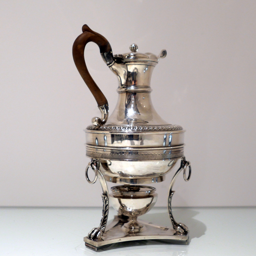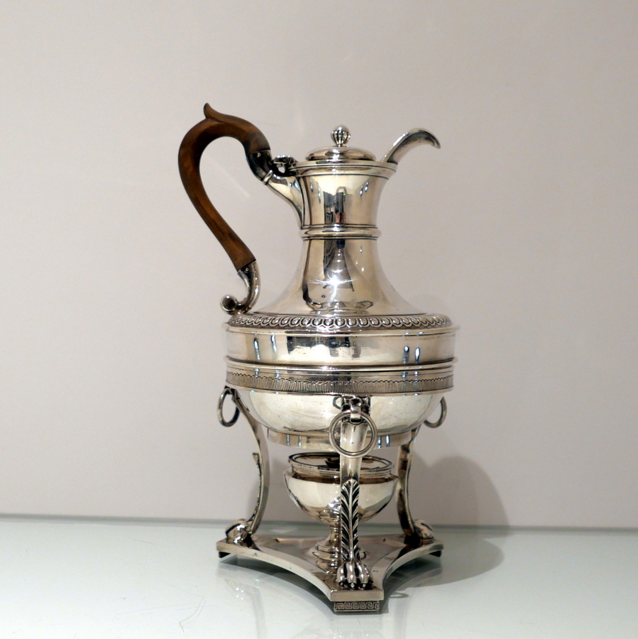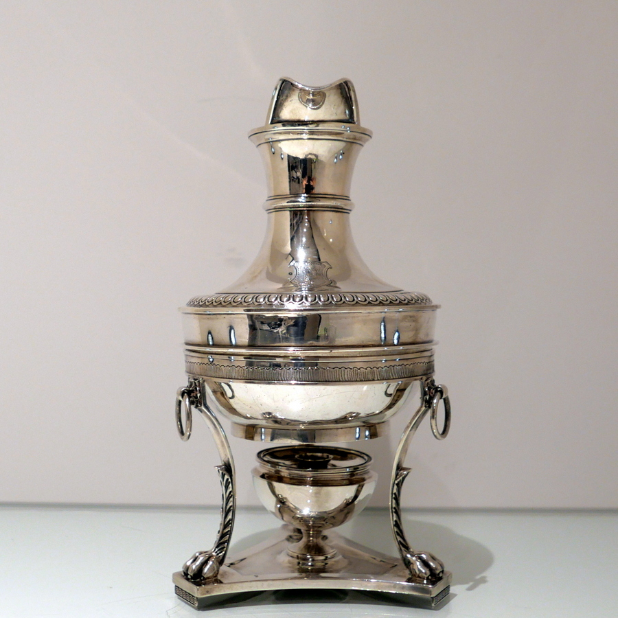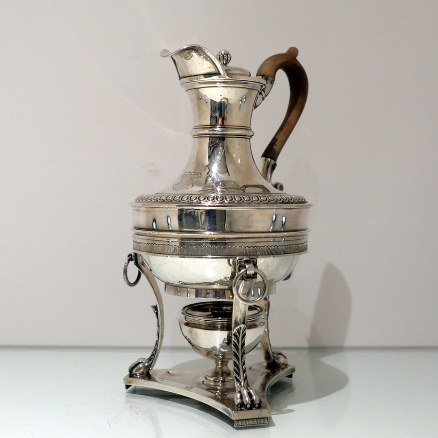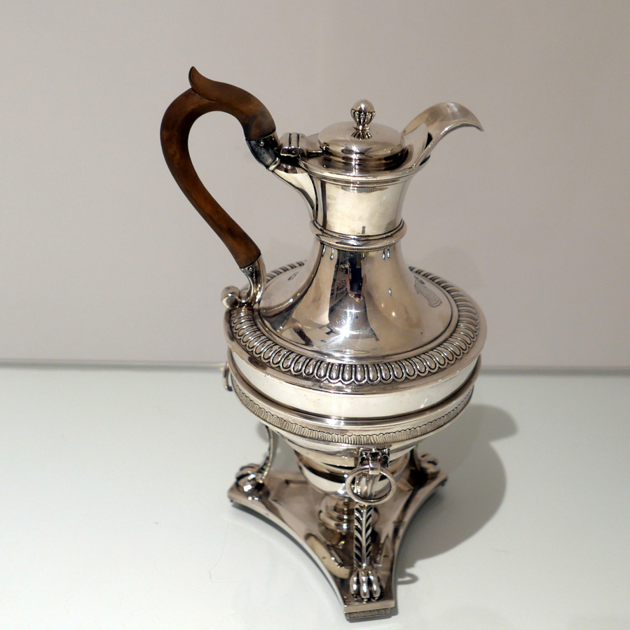 An elegant Georgian silver coffee pot on lampstand thoughtfully designed with ancient Egyptian influences. Â The jug has a stylish ‘tongue’ style border and a sumptuous ‘narrow’ tapering neck. Â The lampstand burner has an etched upper decorative wire and traditional drop ring handles. Â There is a contemporary armorial and crest for importance.