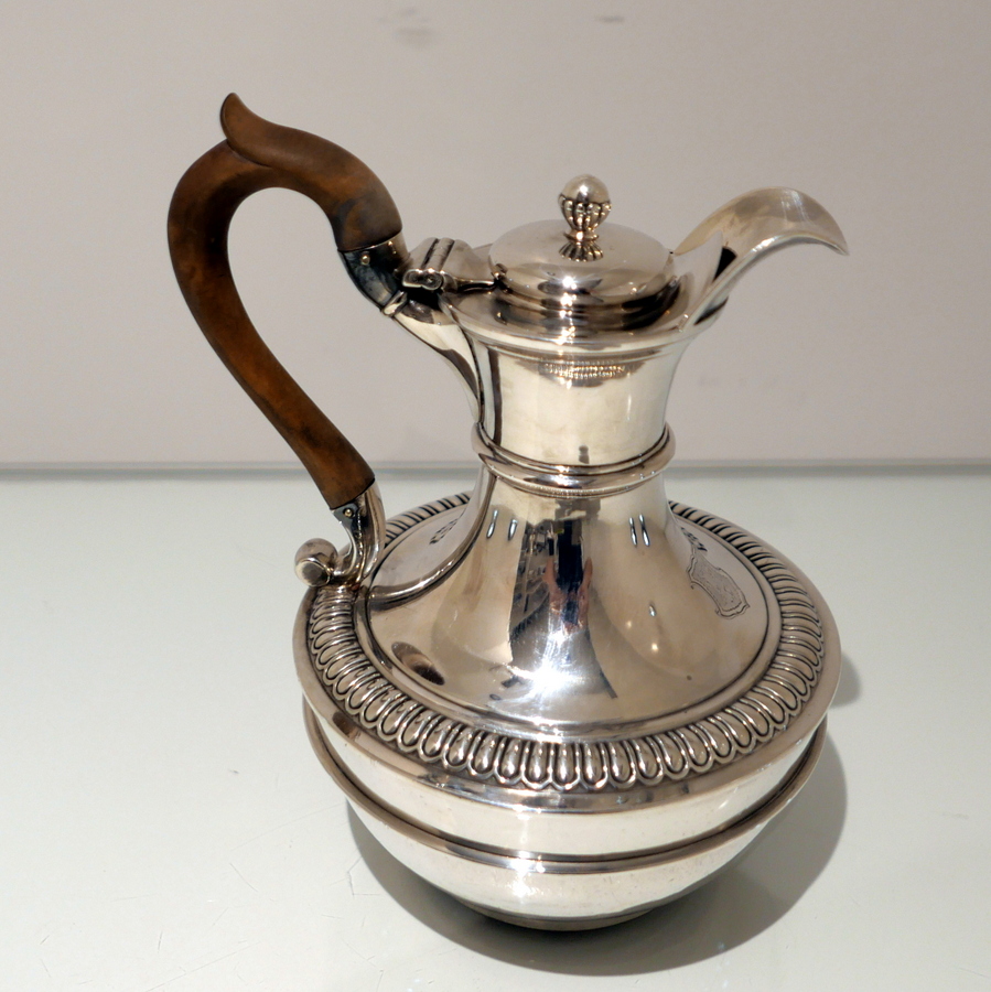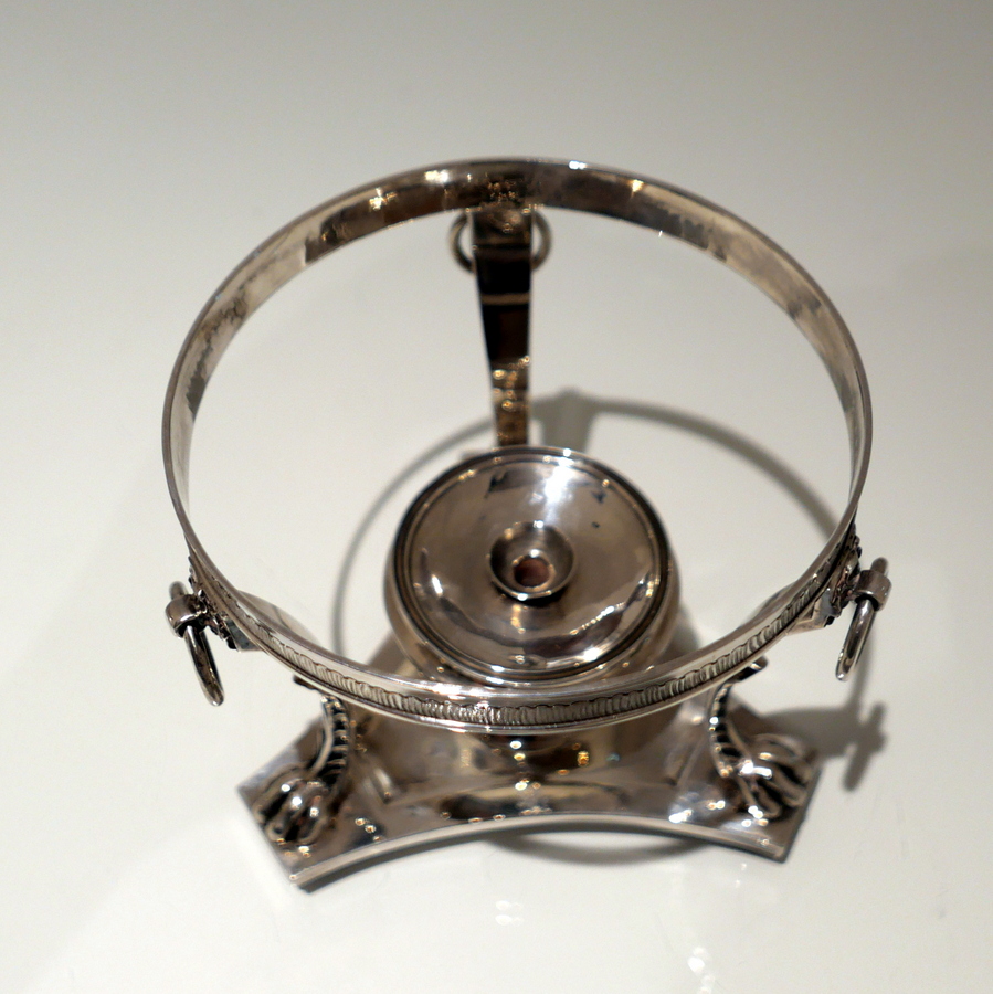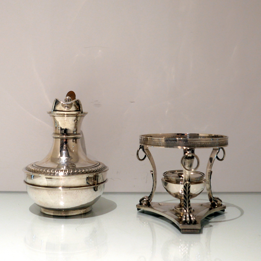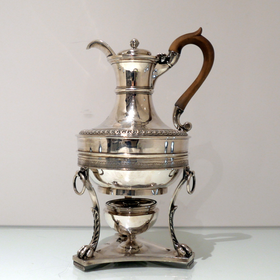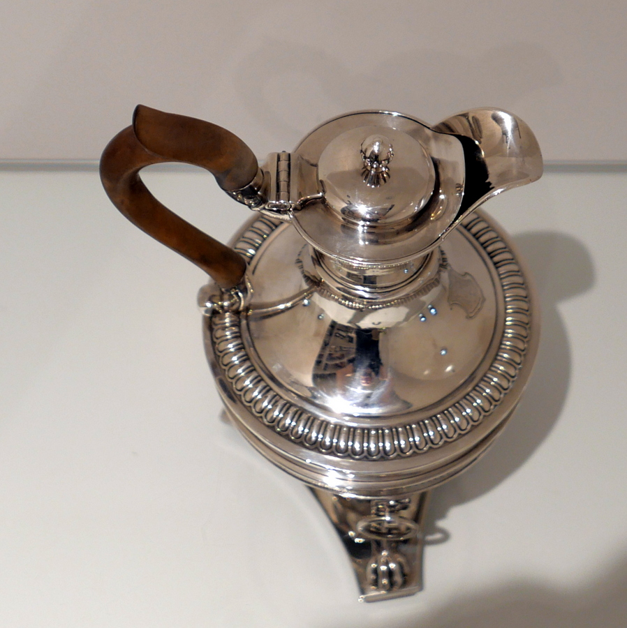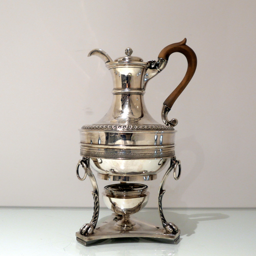 An elegant Georgian silver coffee pot on lampstand thoughtfully designed with ancient Egyptian influences. Â The jug has a stylish ‘tongue’ style border and a sumptuous ‘narrow’ tapering neck. Â The lampstand burner has an etched upper decorative wire and traditional drop ring handles. Â There is a contemporary armorial and crest for importance.