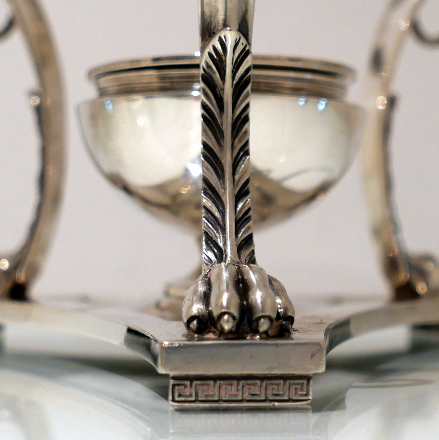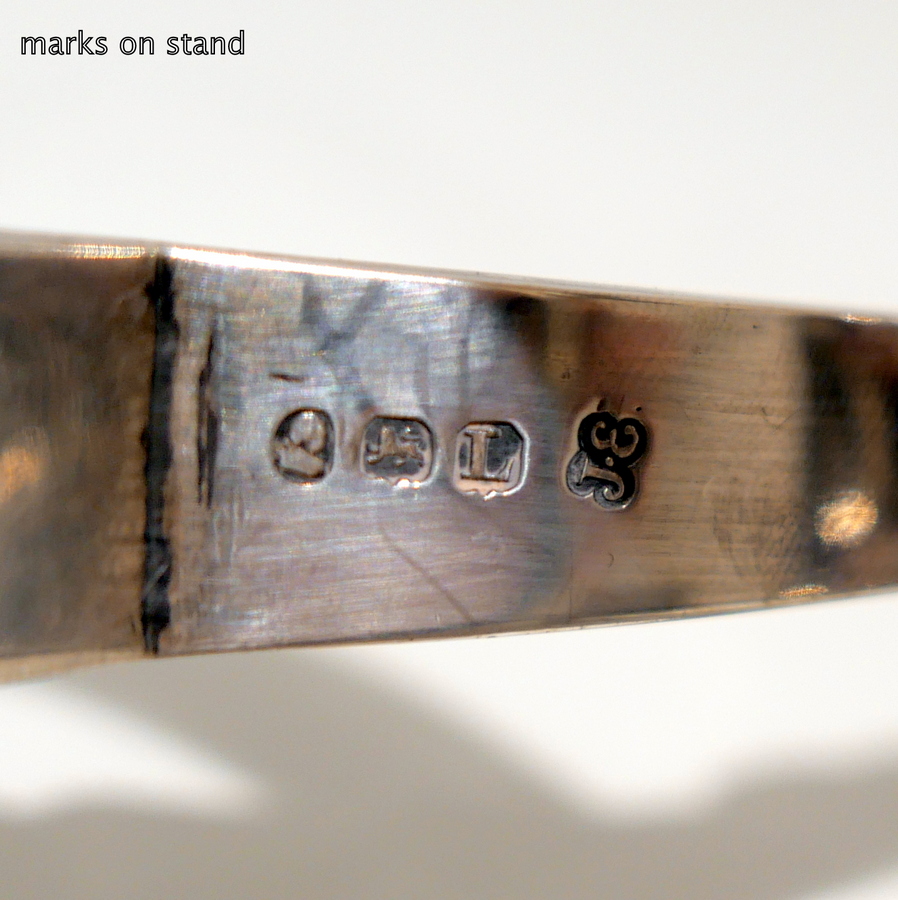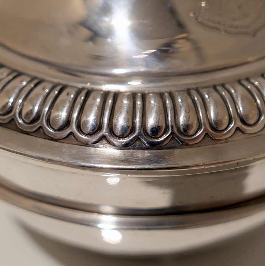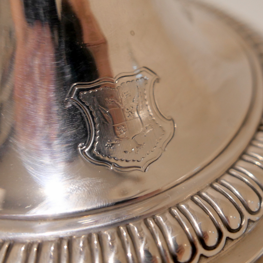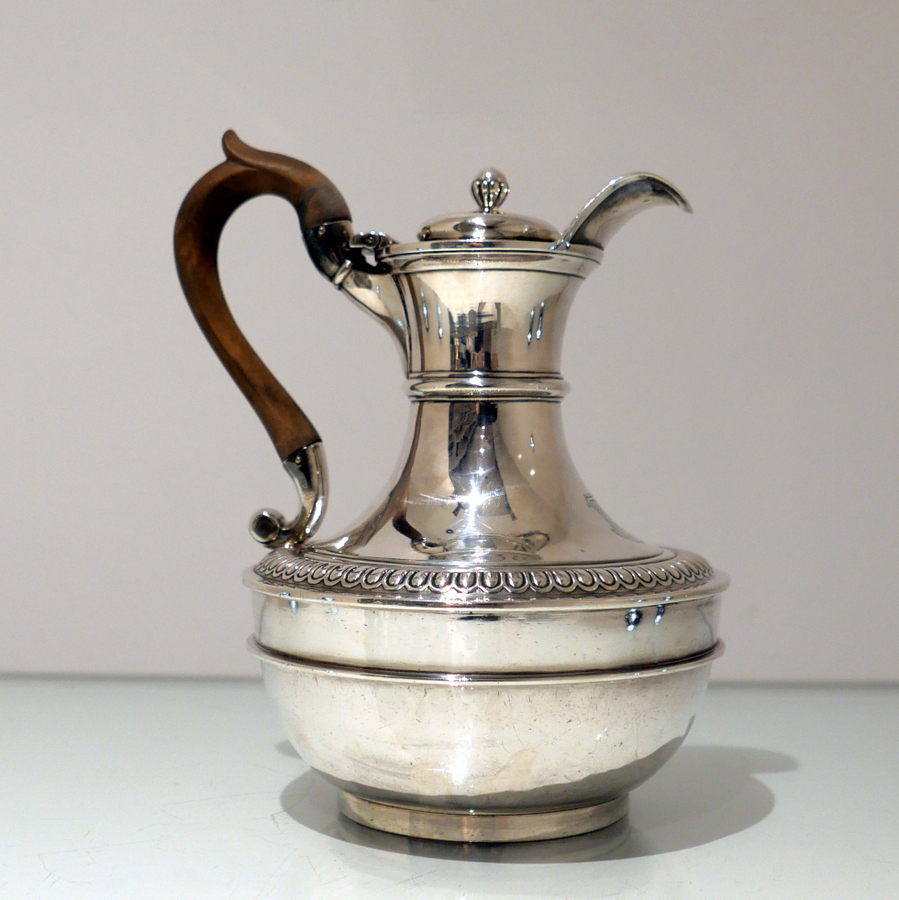 An elegant Georgian silver coffee pot on lampstand thoughtfully designed with ancient Egyptian influences. Â The jug has a stylish ‘tongue’ style border and a sumptuous ‘narrow’ tapering neck. Â The lampstand burner has an etched upper decorative wire and traditional drop ring handles. Â There is a contemporary armorial and crest for importance.