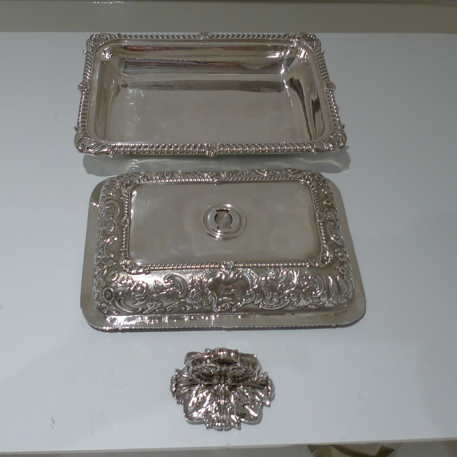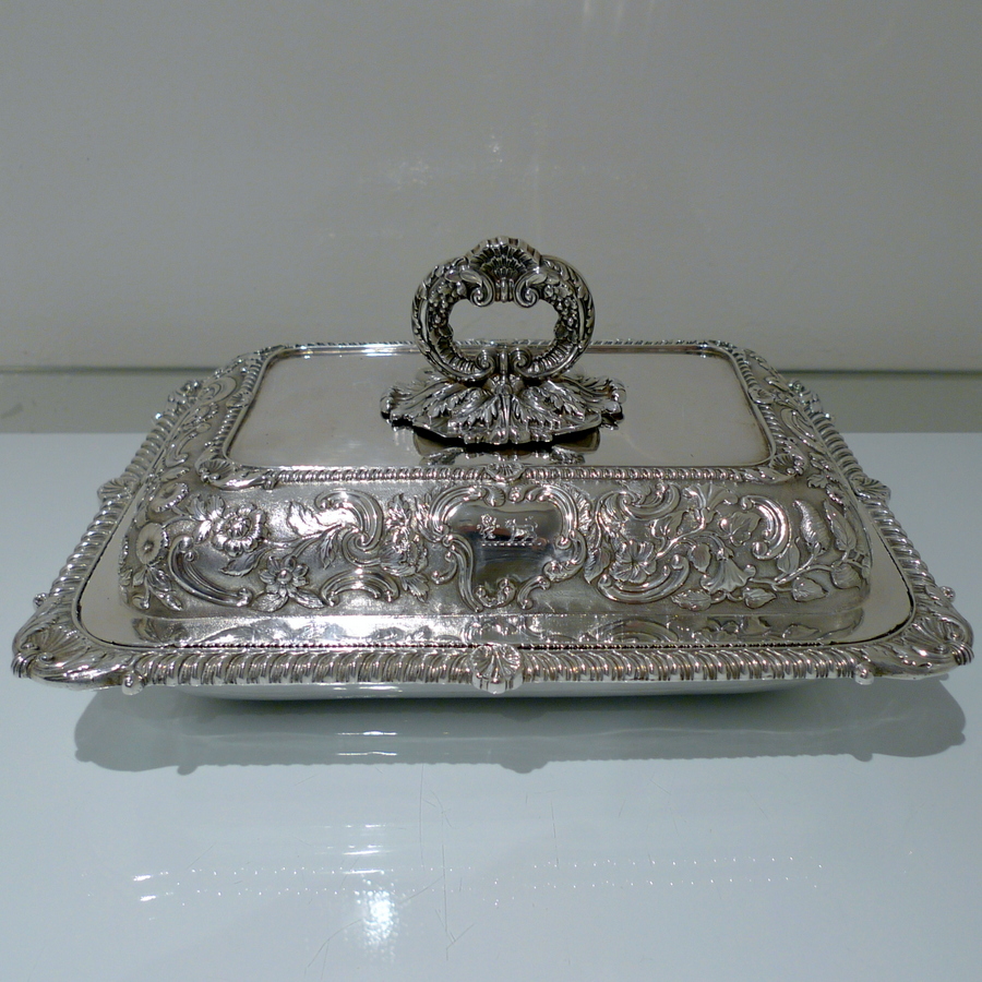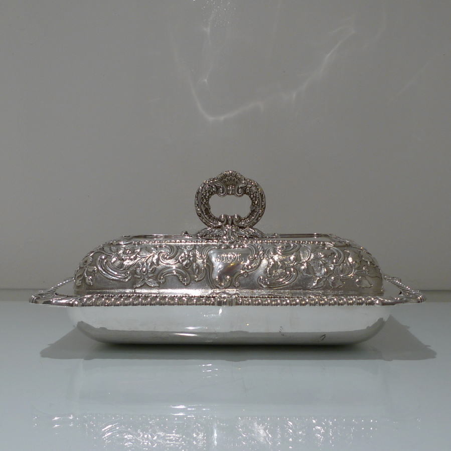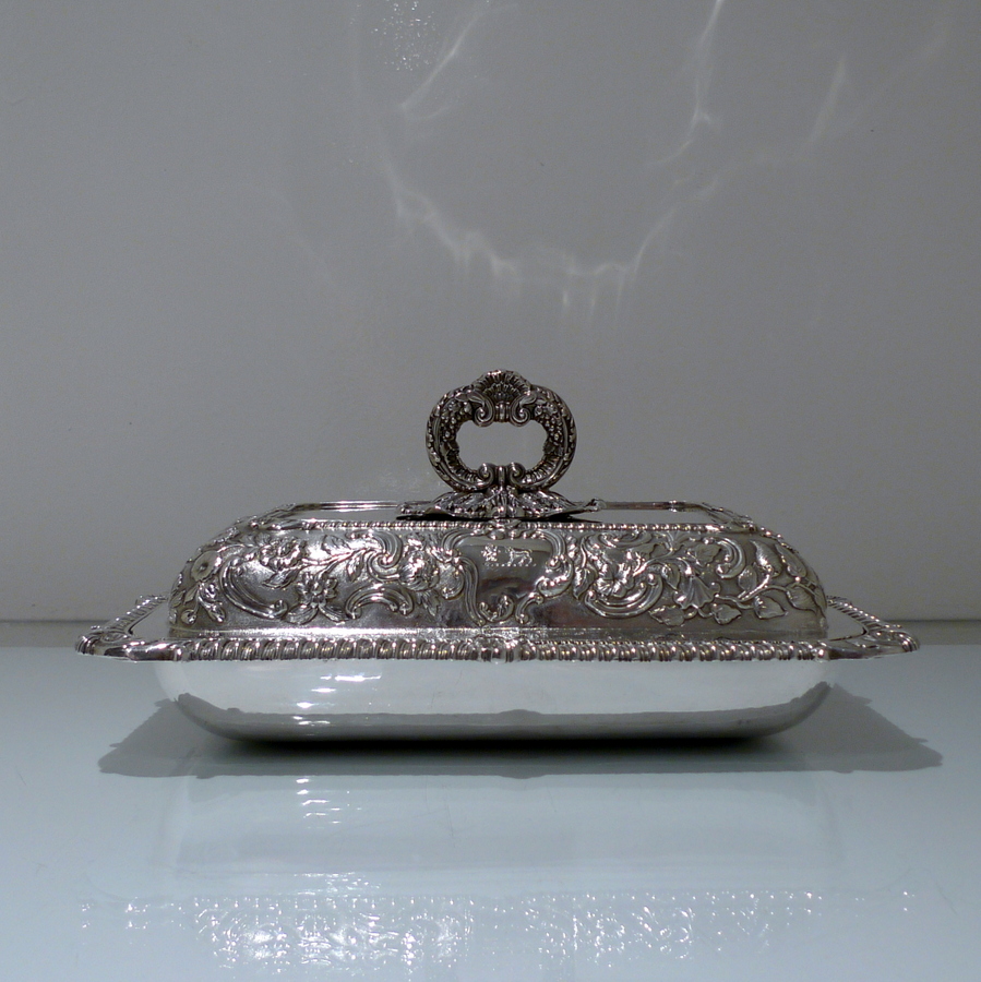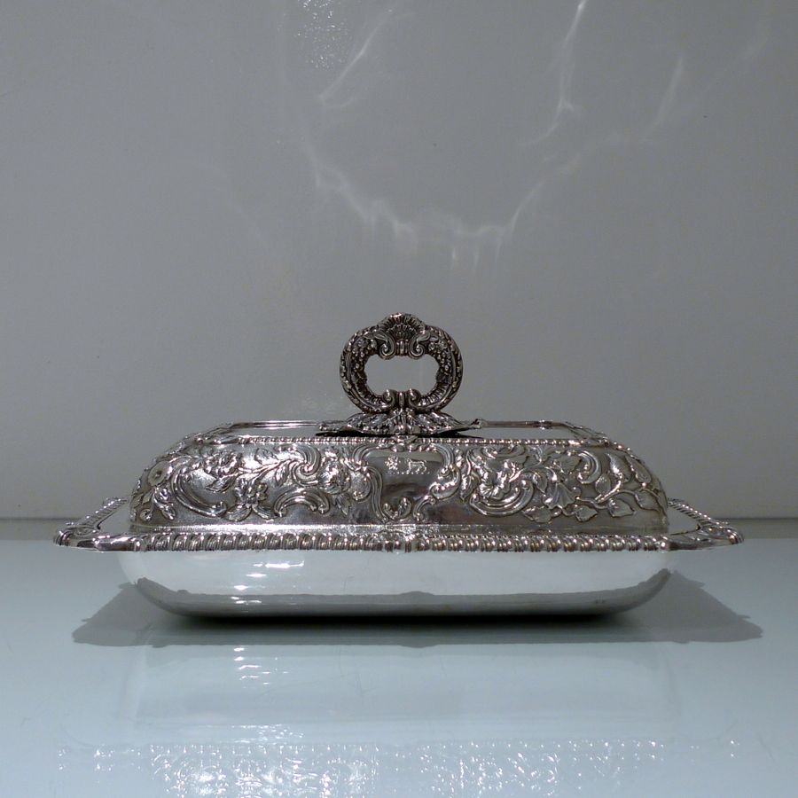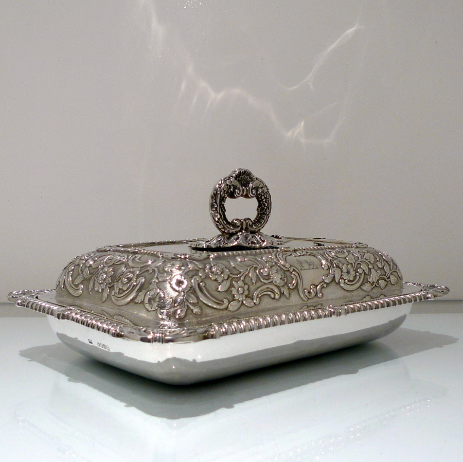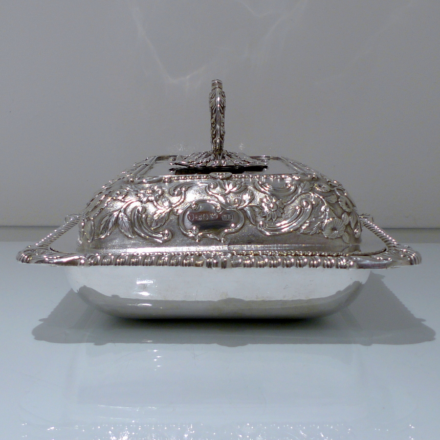 A very stylish original chased late Georgian oblong silver entree dish decorated with truly impressive floral embossing to the upper dish (cover) which is then set on a matt background for contrast. Â The lower dish (base) is plain formed in design to the body but has a shell and gadroon decorated applied rim. Â The contrast between chased upper dish and plain lower dish is incredibly unusual and shows supreme creative design (thinking) by the highly renowned Benjamin Smith dynasty!
