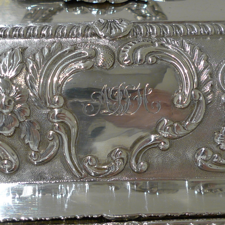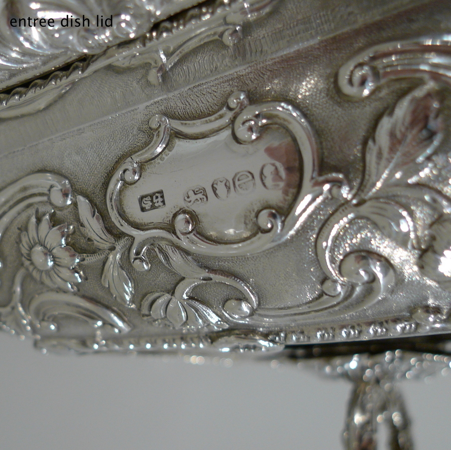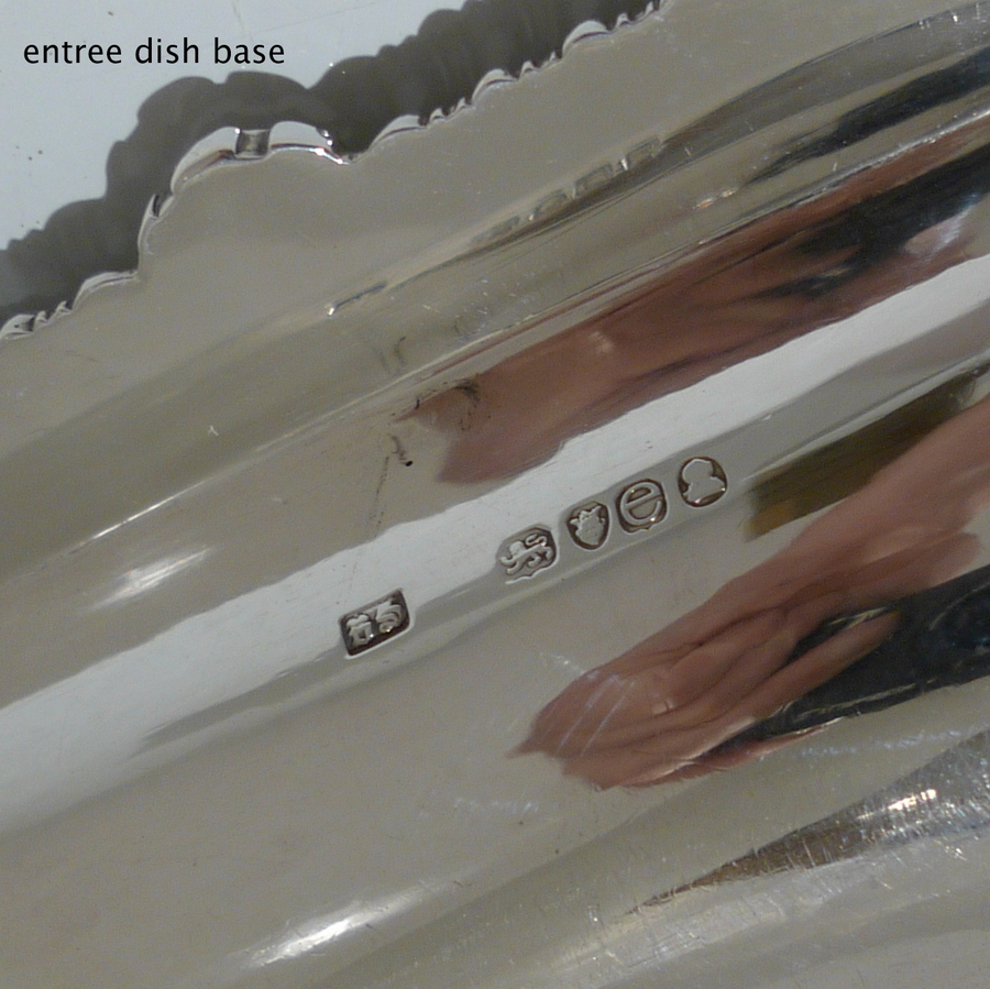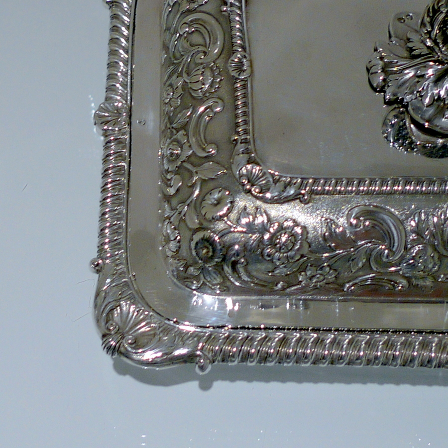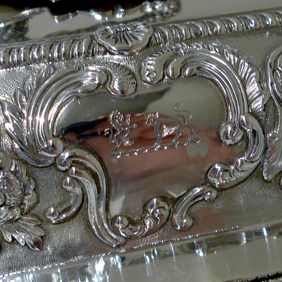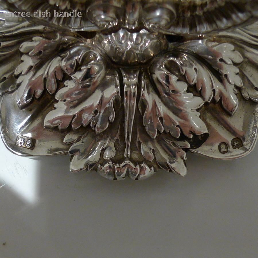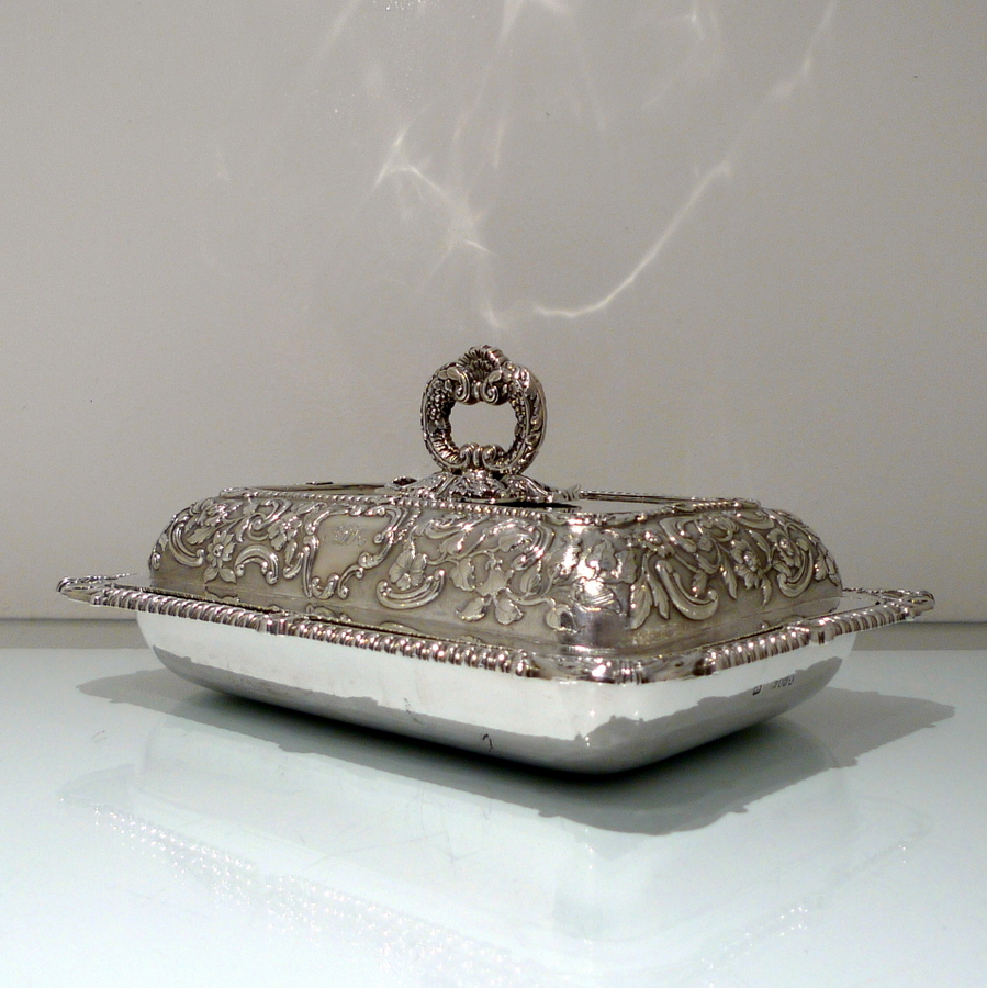 A very stylish original chased late Georgian oblong silver entree dish decorated with truly impressive floral embossing to the upper dish (cover) which is then set on a matt background for contrast. Â The lower dish (base) is plain formed in design to the body but has a shell and gadroon decorated applied rim. Â The contrast between chased upper dish and plain lower dish is incredibly unusual and shows supreme creative design (thinking) by the highly renowned Benjamin Smith dynasty!