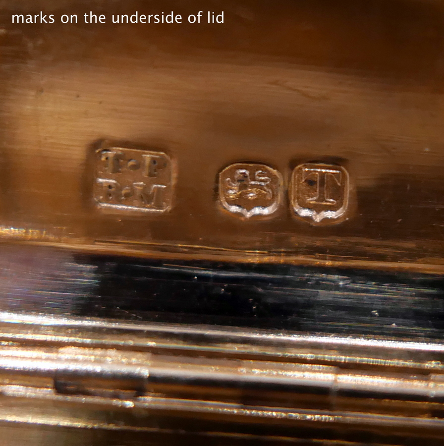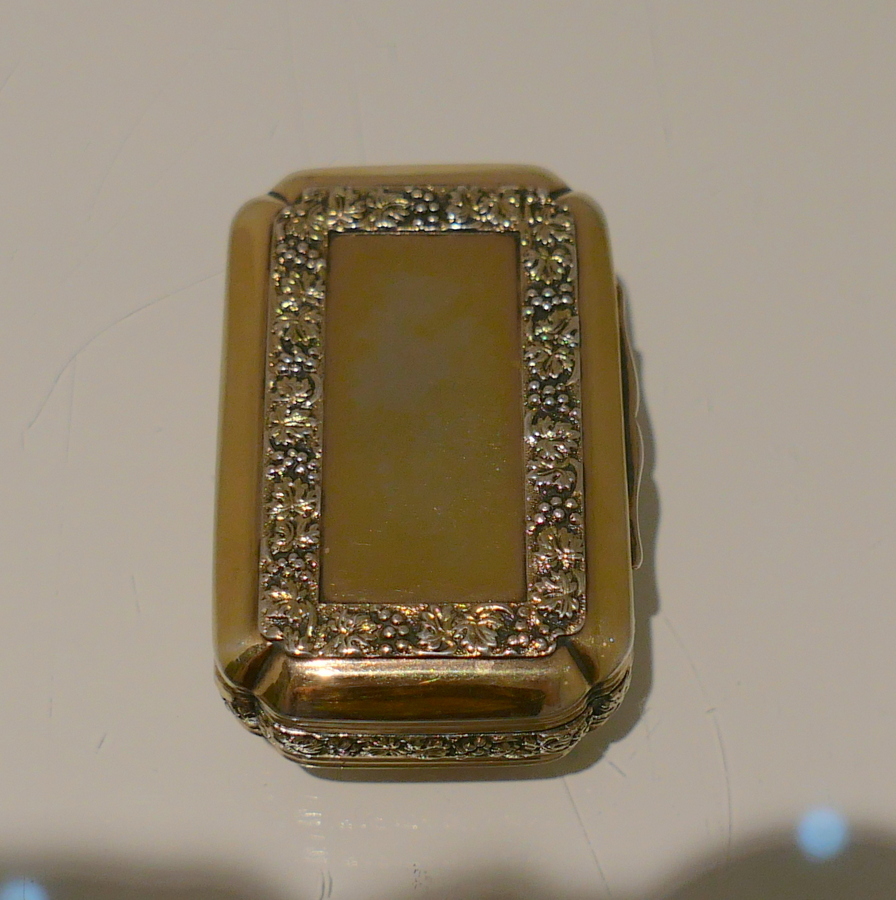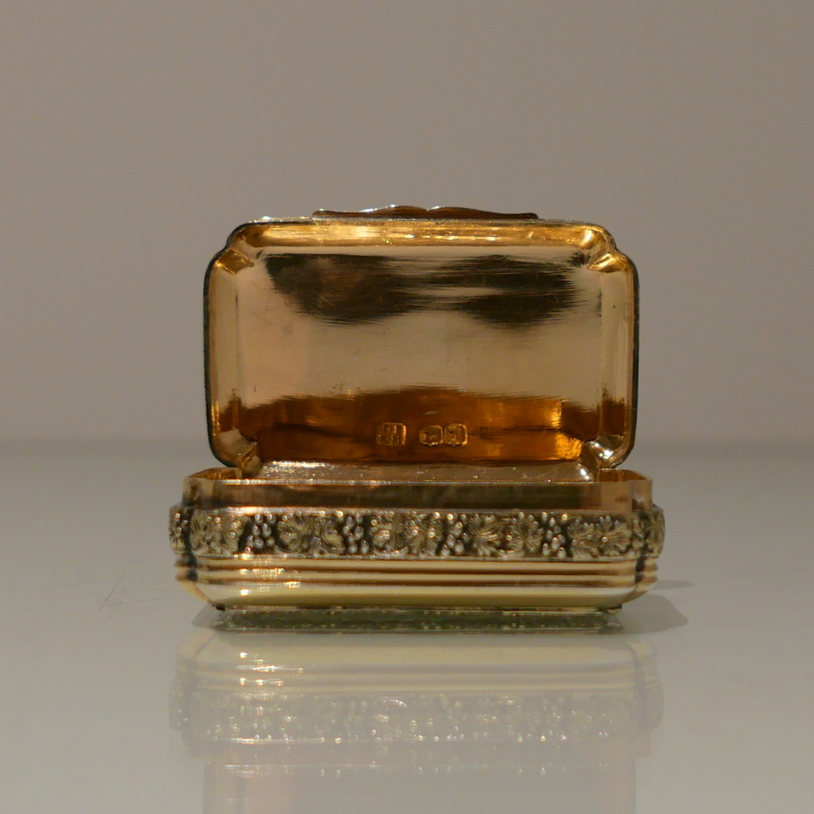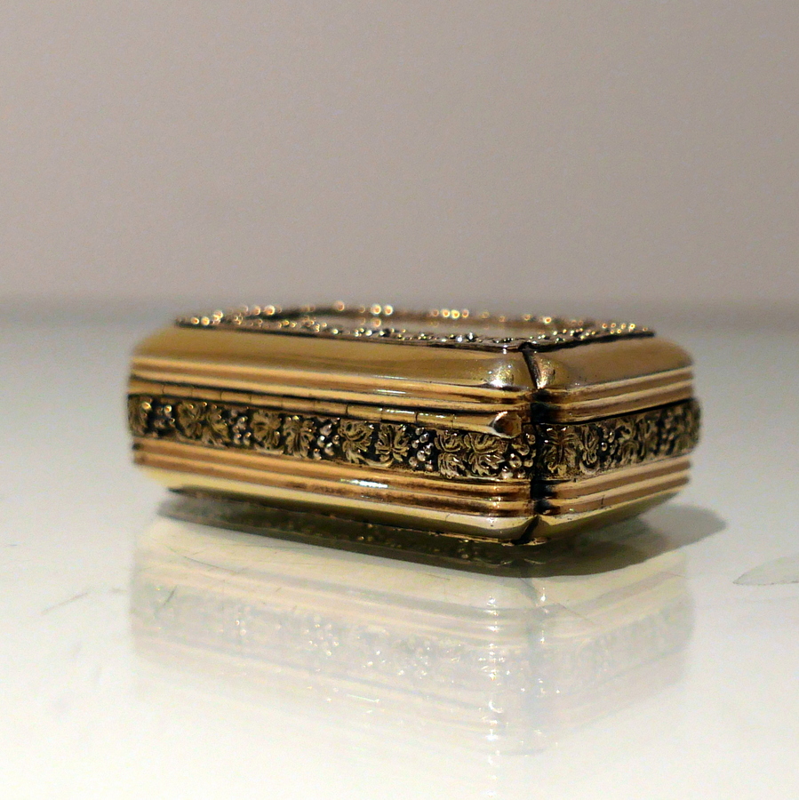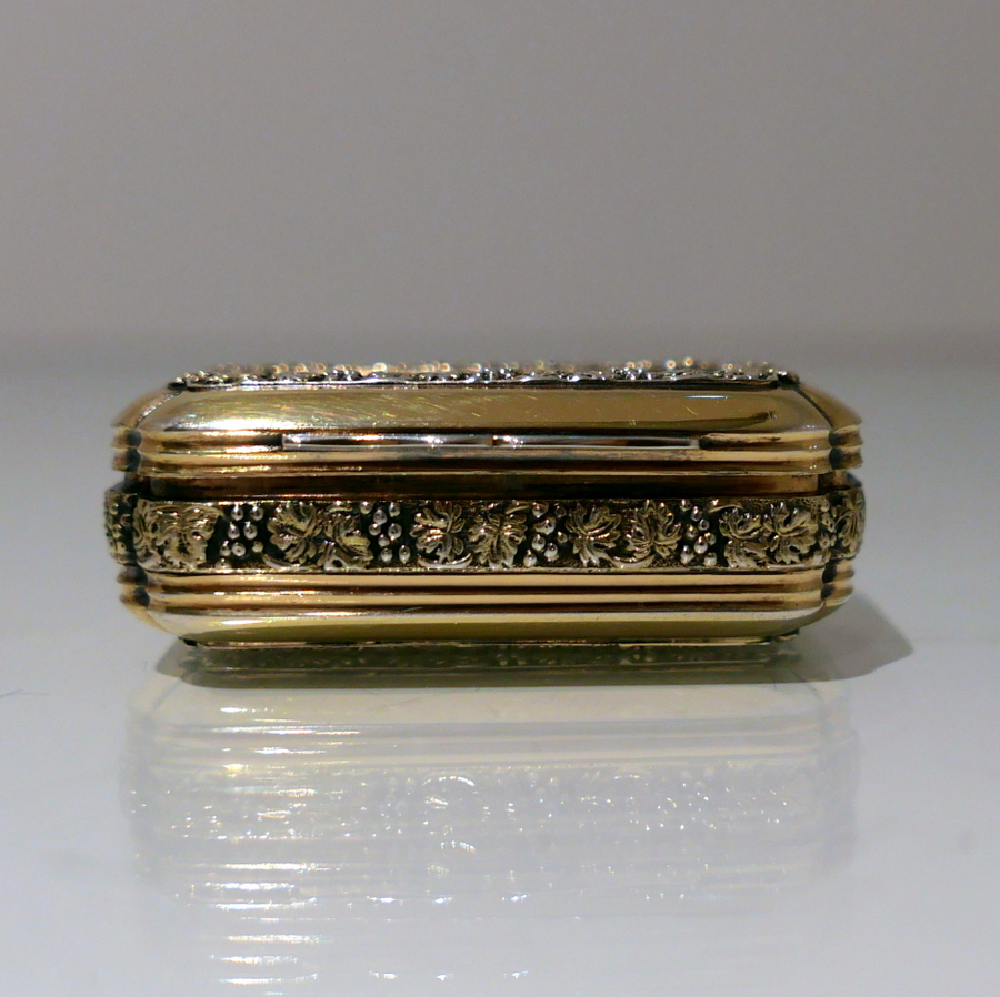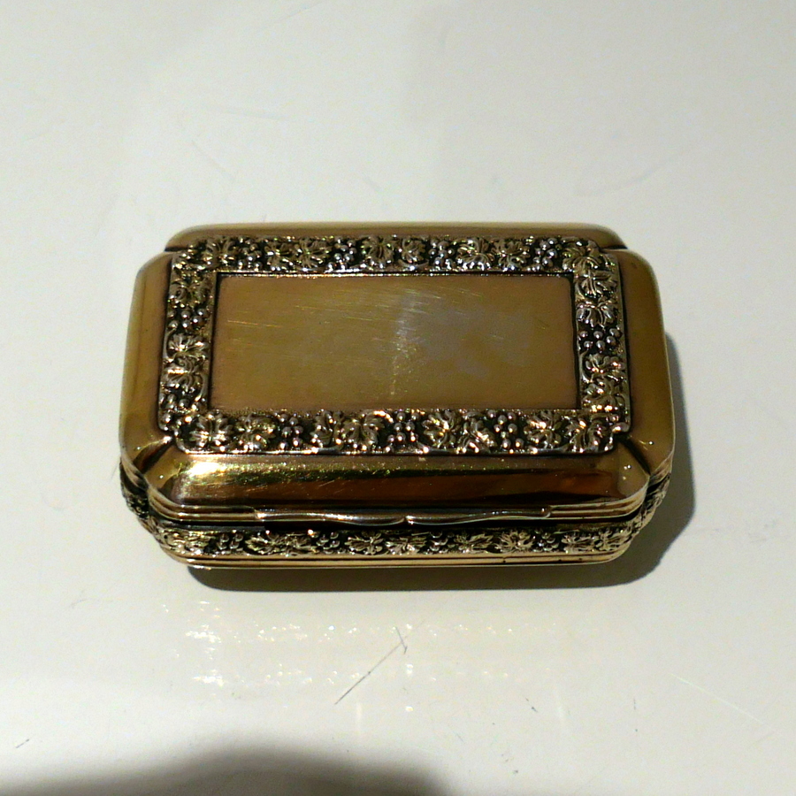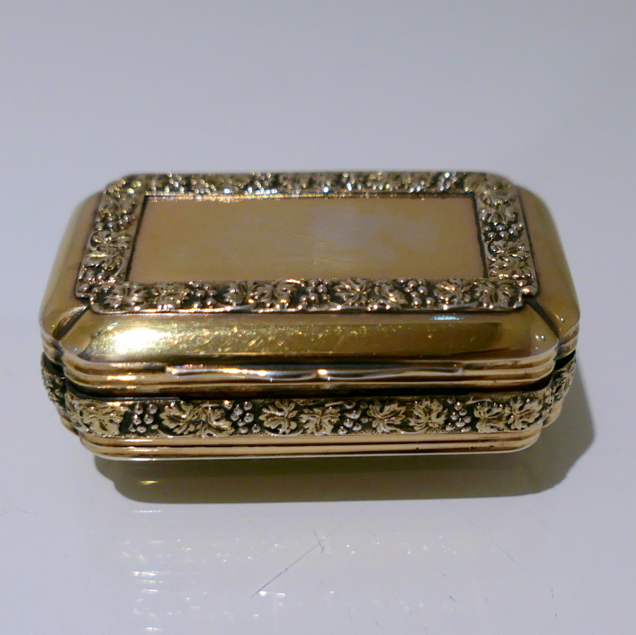 A sweet early 19th century Georgian silver gilt shaped cornered rectangular snuff box design with a hinged lid and decorative grape and vine applied borders.
