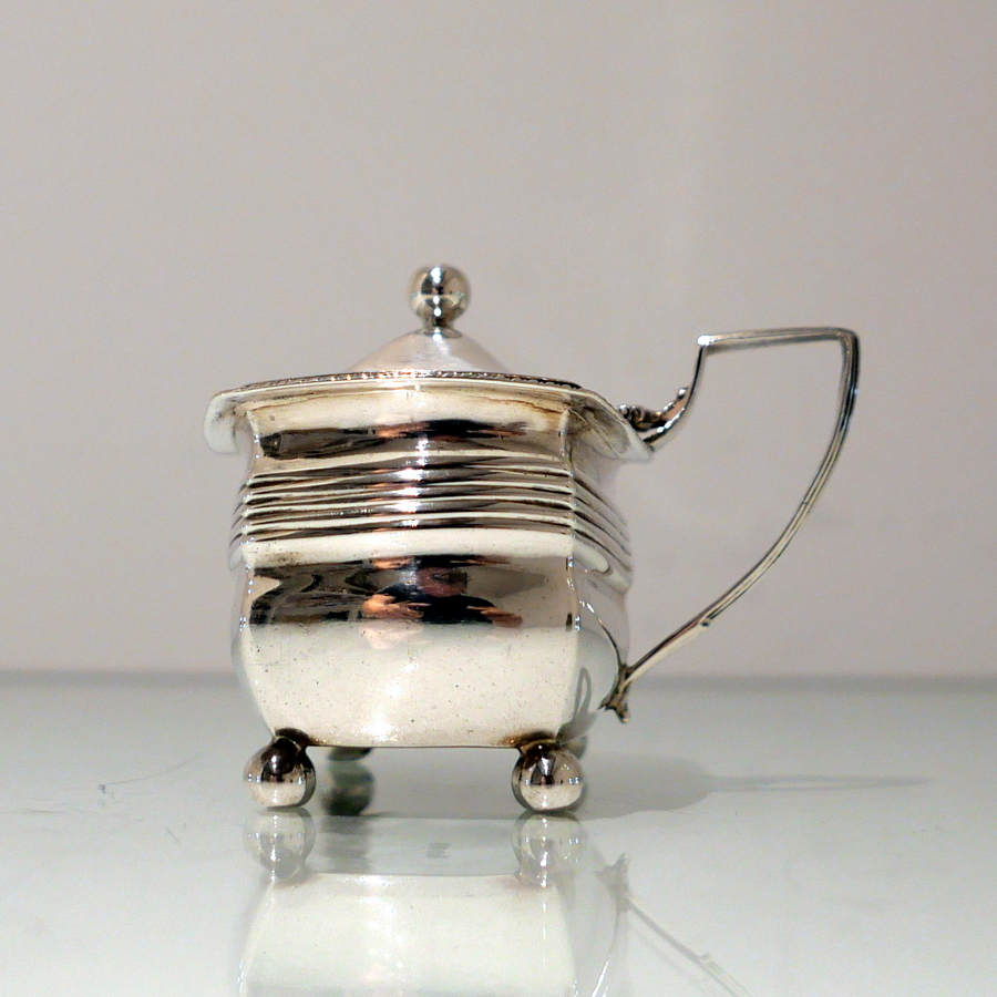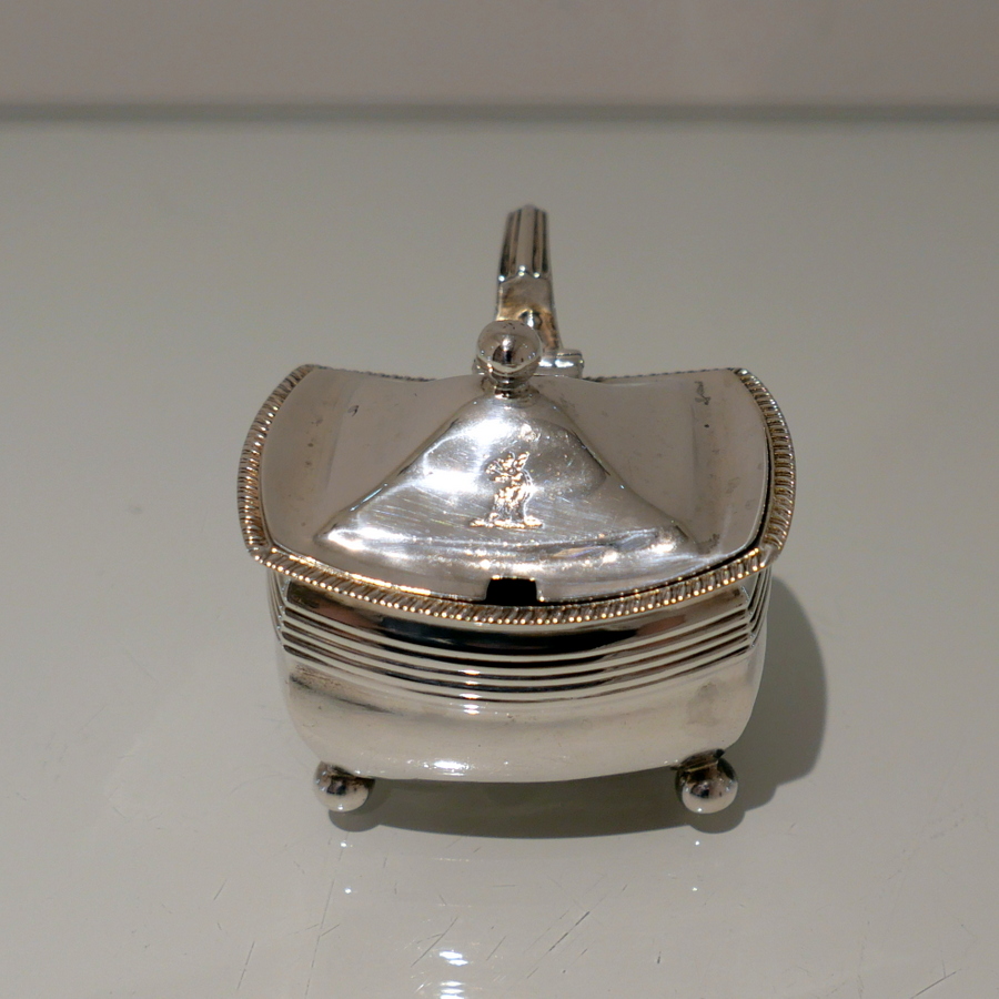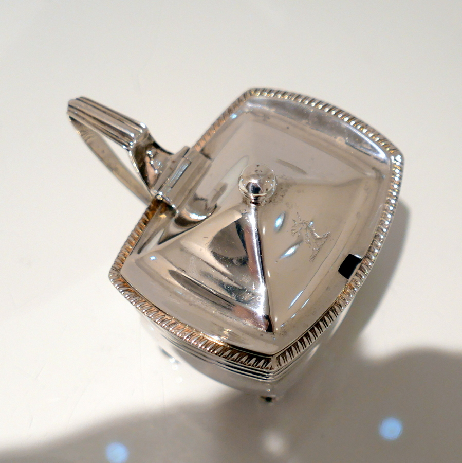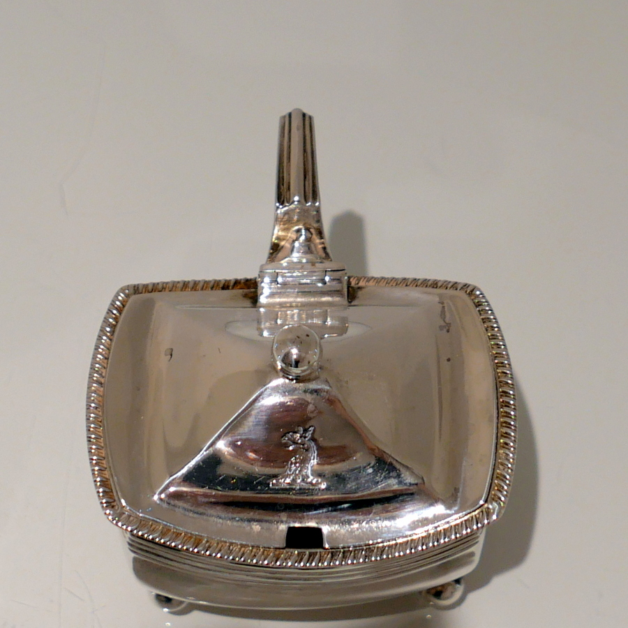 A sweet early 19th century shaped rectangular gadroon border mustard pot. Â The hinged lid is elegantly domed and engraved with a stylish contemporary crest.