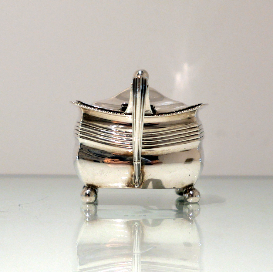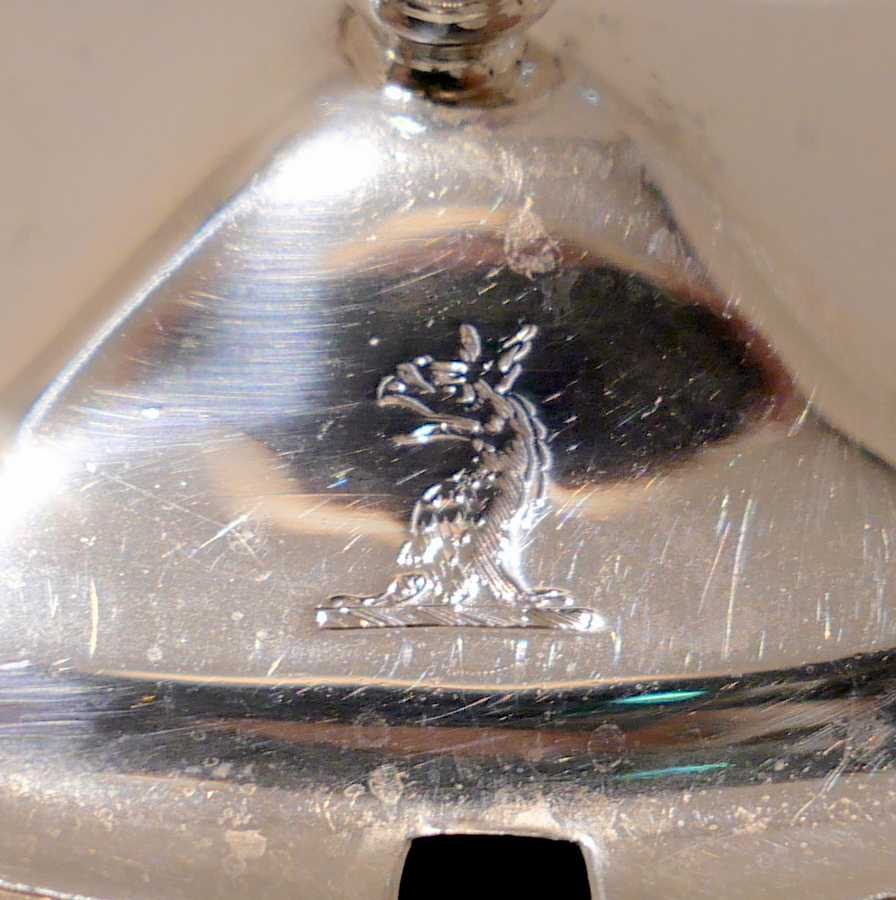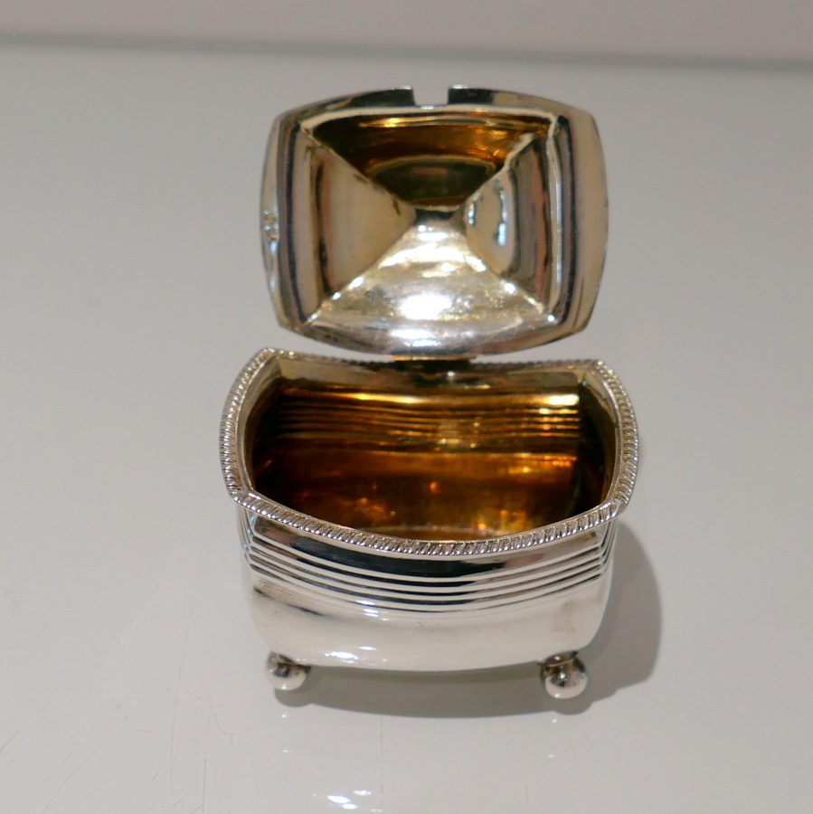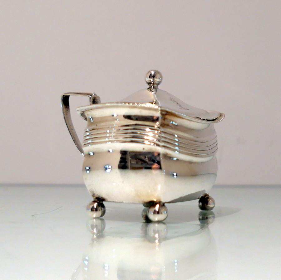 A sweet early 19th century shaped rectangular gadroon border mustard pot. Â The hinged lid is elegantly domed and engraved with a stylish contemporary crest.