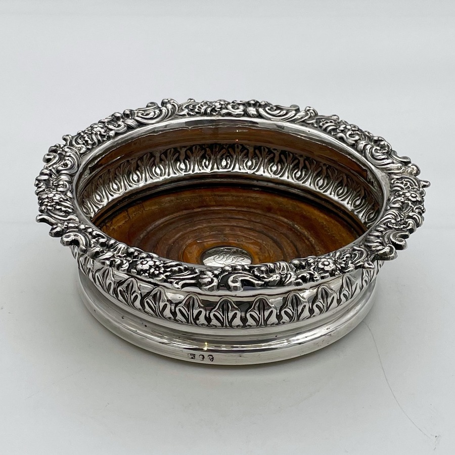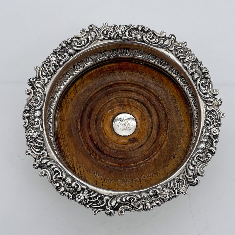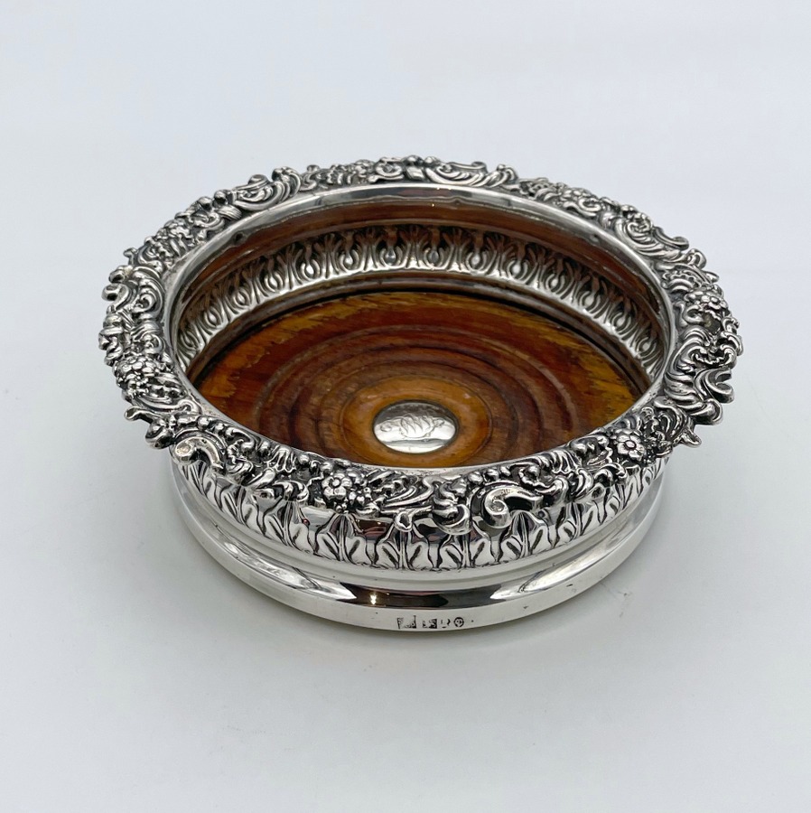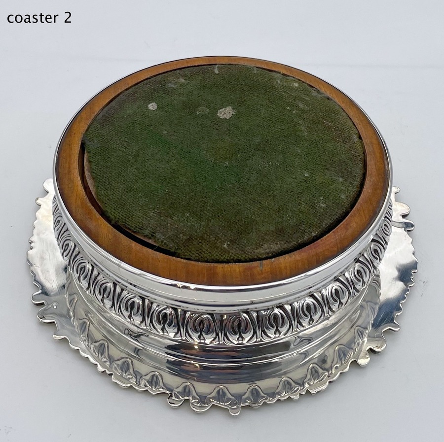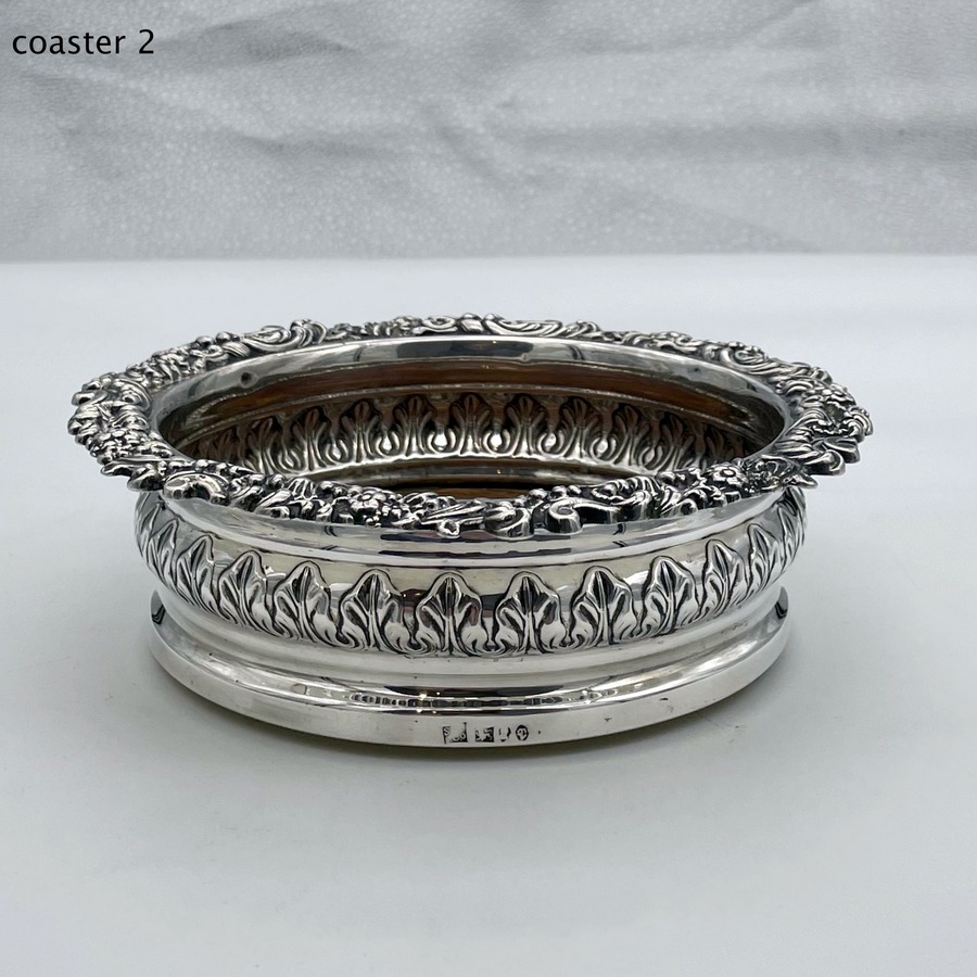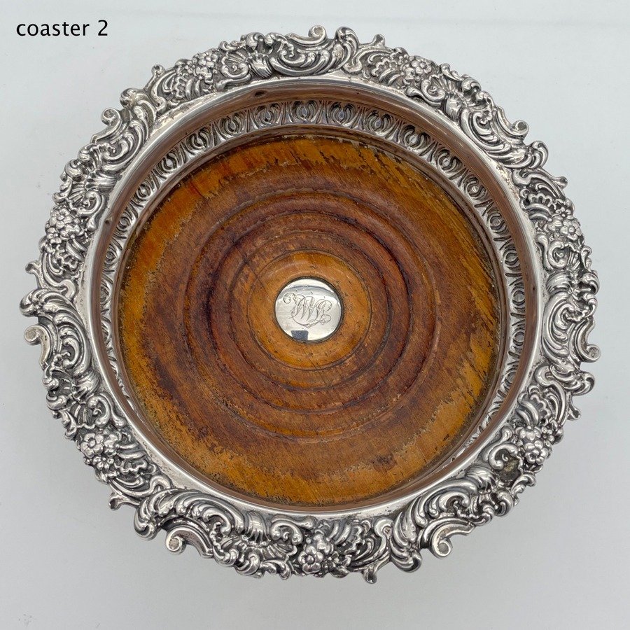 A fabulous pair of silver wine coasters decorated with rare acanthus leaf embellishing to the body and a superb ornate shell and floral borders. Â The inner wood bases have elegant turnings for lowlights and frame applied silver buttons which have presentation hand engraved contemporary initials.