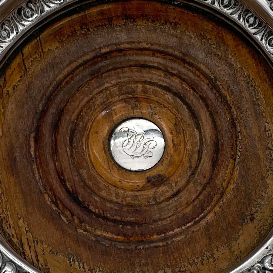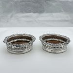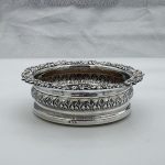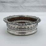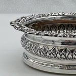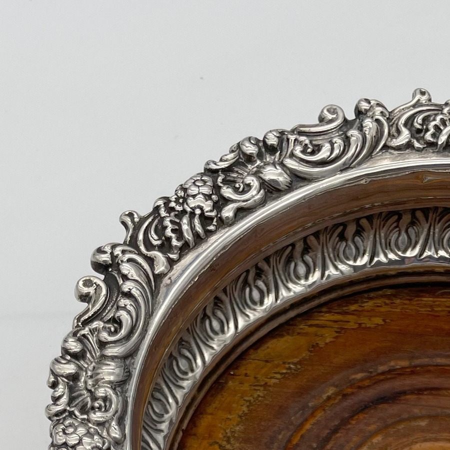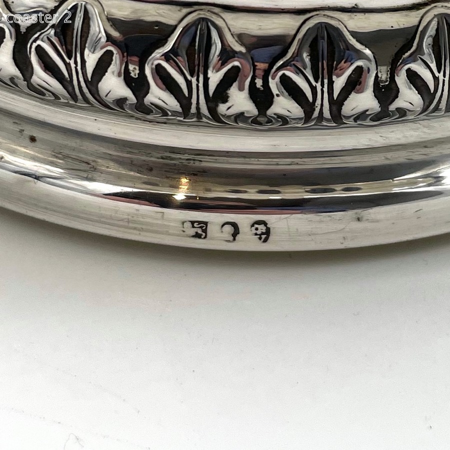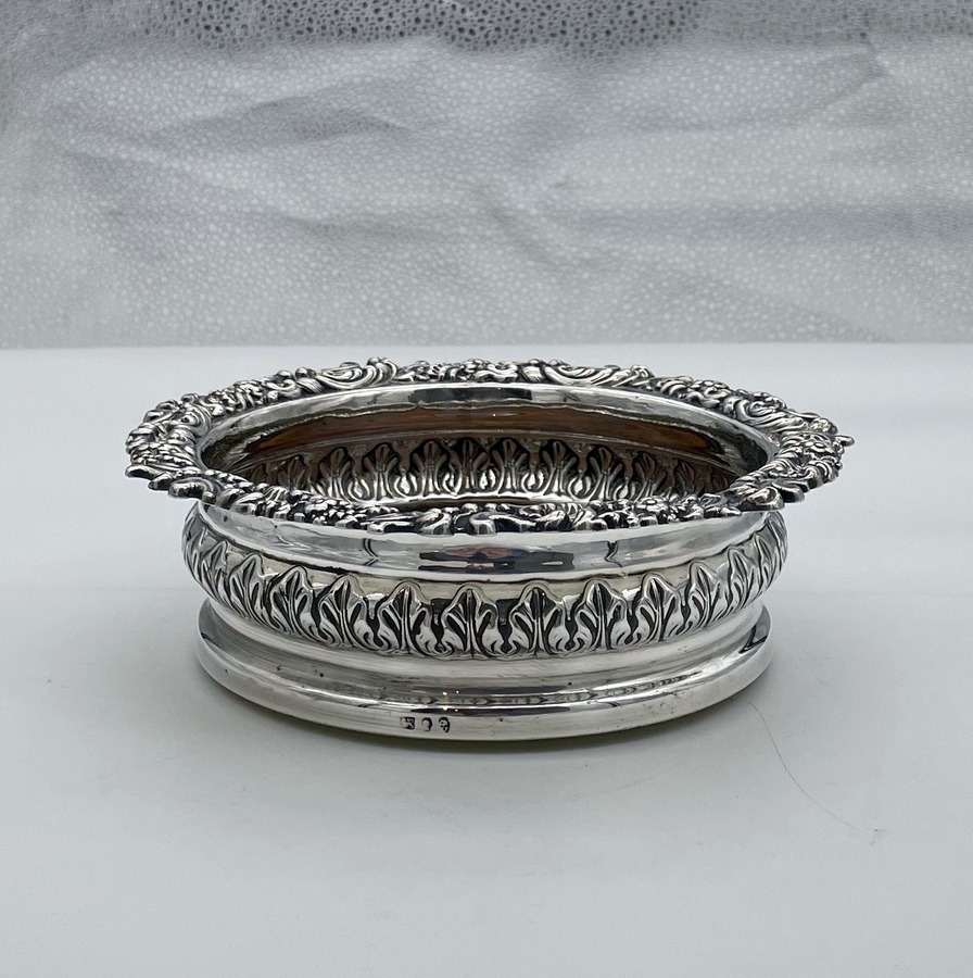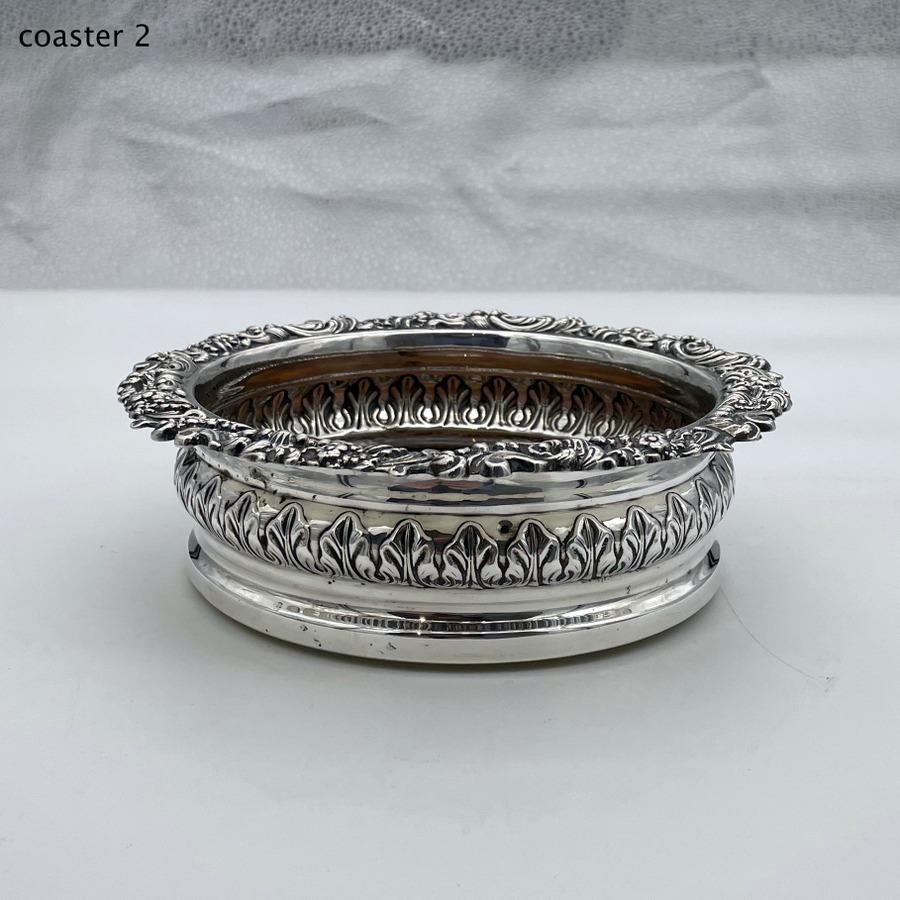 A fabulous pair of silver wine coasters decorated with rare acanthus leaf embellishing to the body and a superb ornate shell and floral borders. Â The inner wood bases have elegant turnings for lowlights and frame applied silver buttons which have presentation hand engraved contemporary initials.