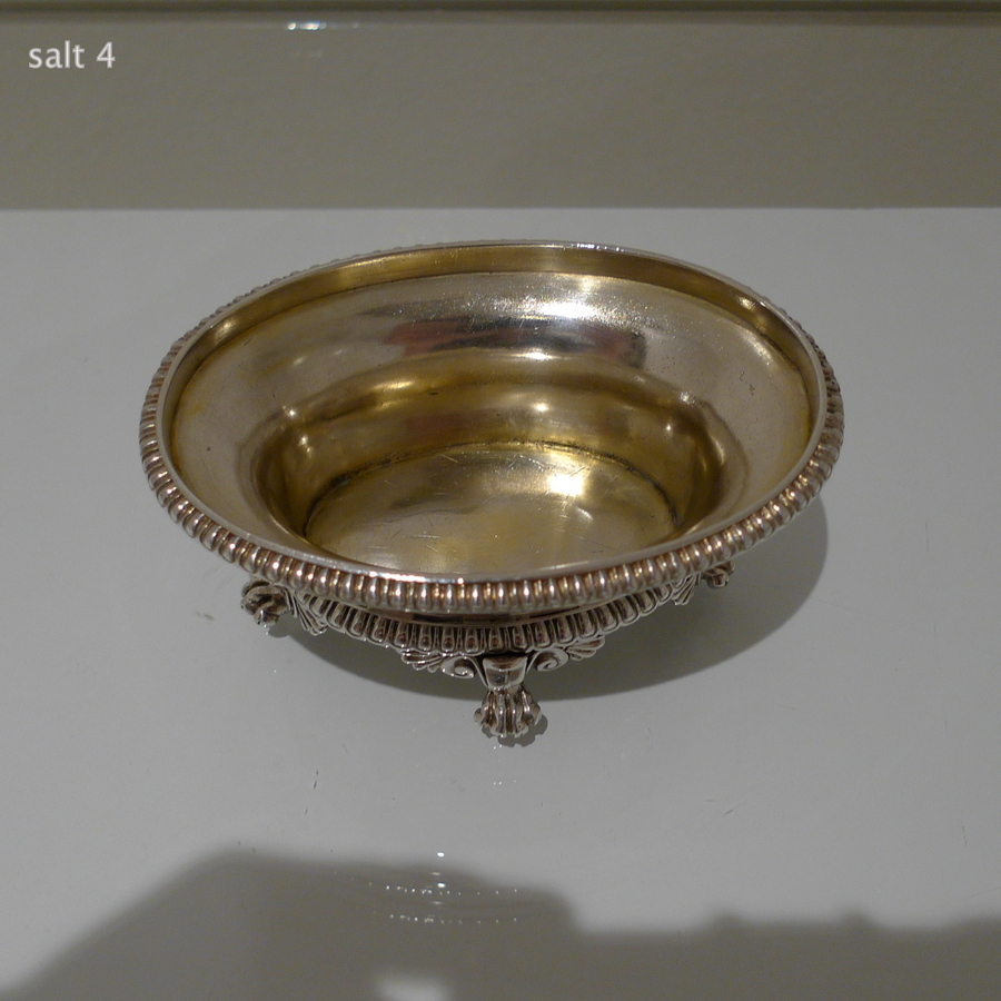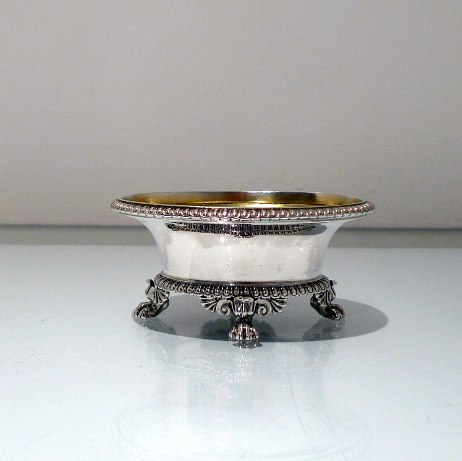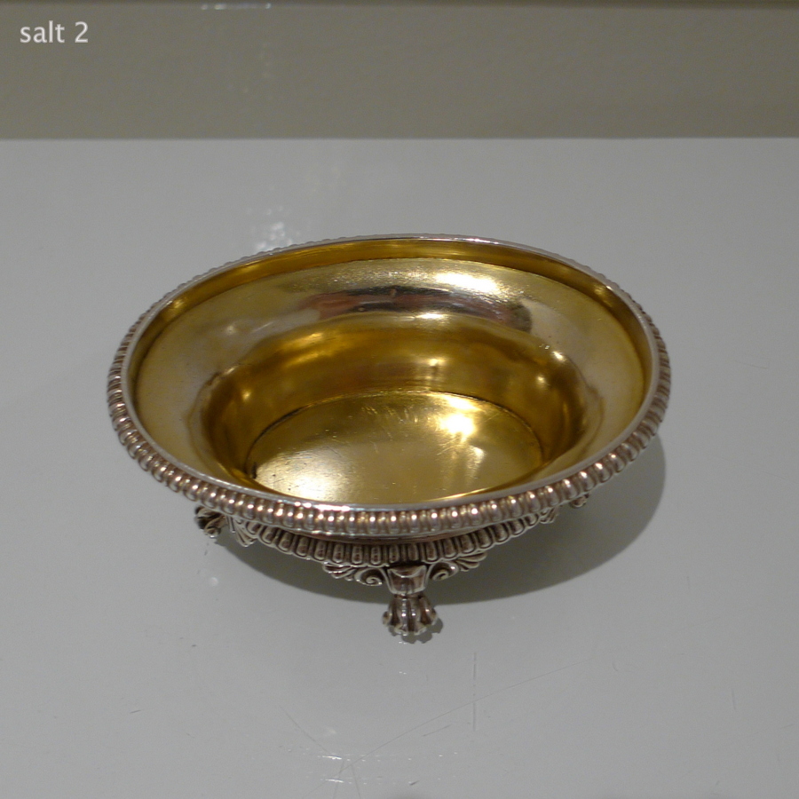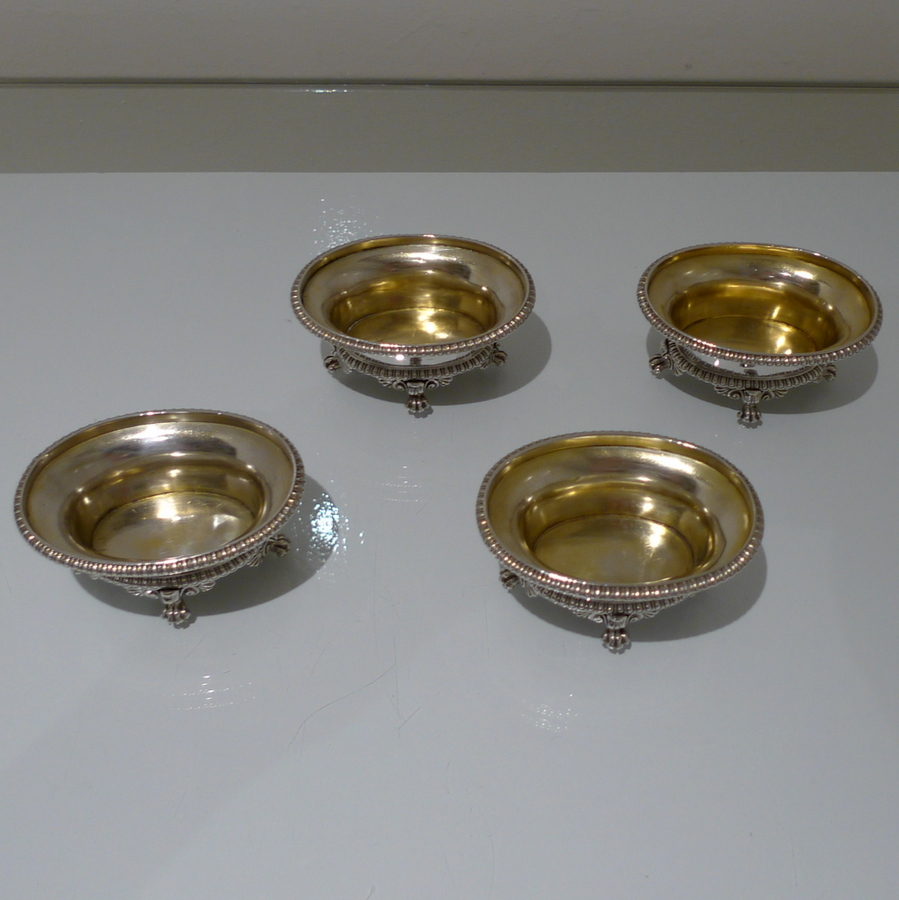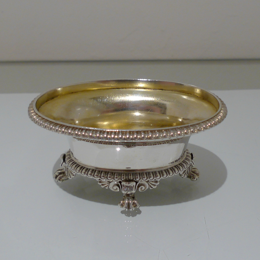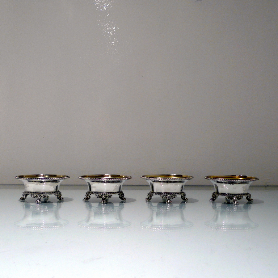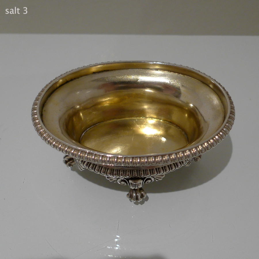 A rare and highly collectable set of four oval salt cellars, decorated with gadroon borders which sandwich a plain formed bowl, raised by four splendidly ornate feet. The interiors are gilt and the overall craftsmanship reflects the supreme workmanship of the Paul Storr workshop.
