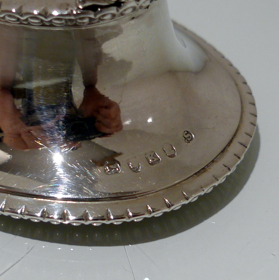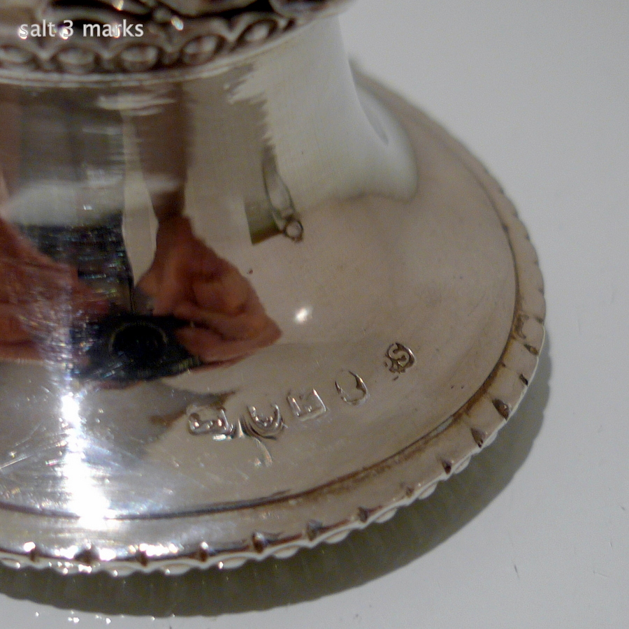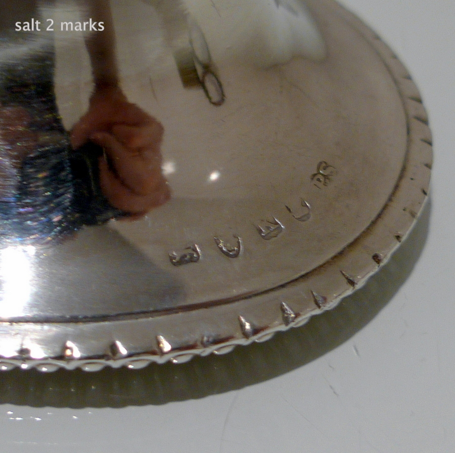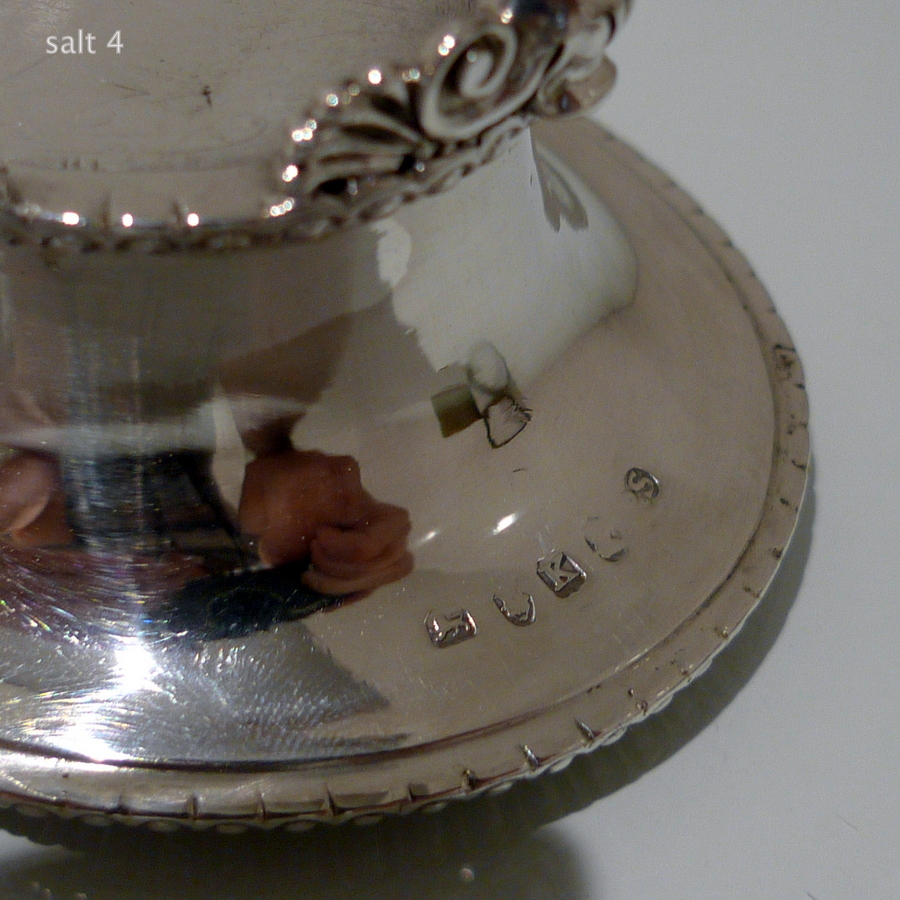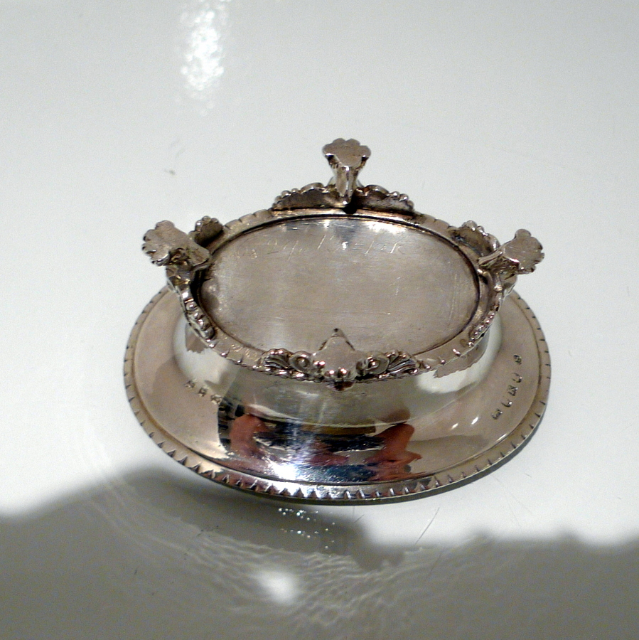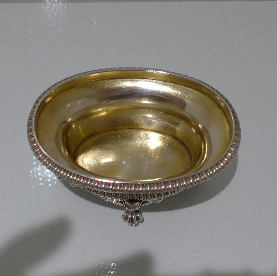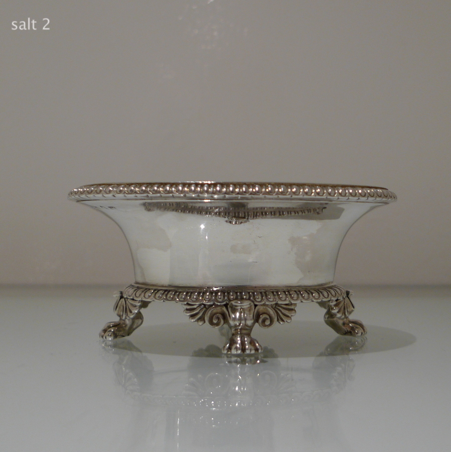 A rare and highly collectable set of four oval salt cellars, decorated with gadroon borders which sandwich a plain formed bowl, raised by four splendidly ornate feet. The interiors are gilt and the overall craftsmanship reflects the supreme workmanship of the Paul Storr workshop.
