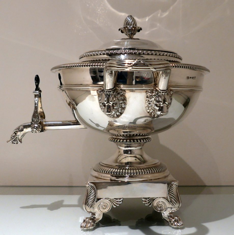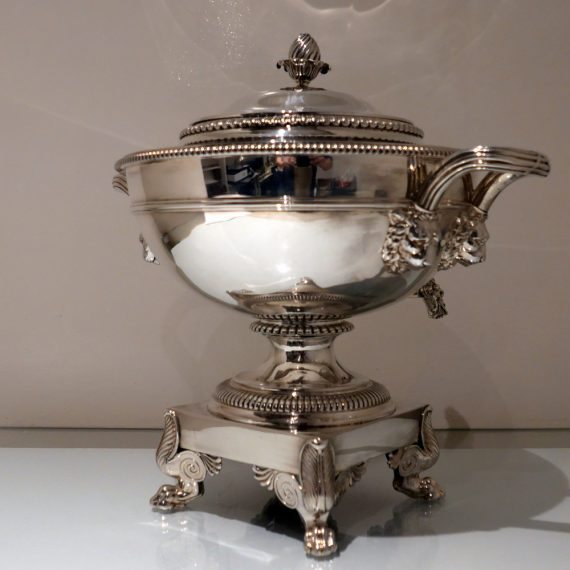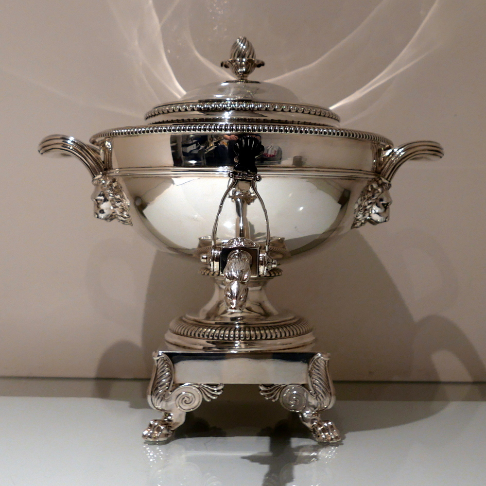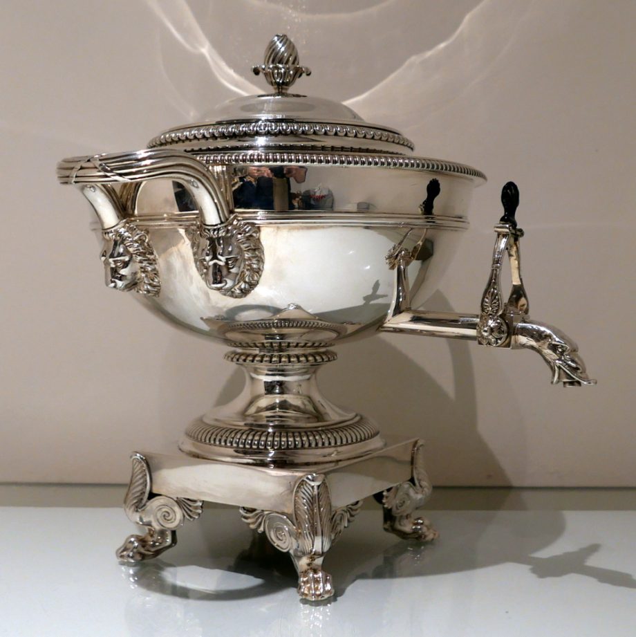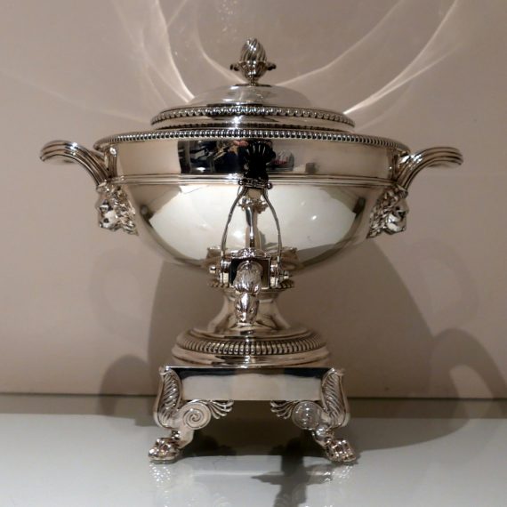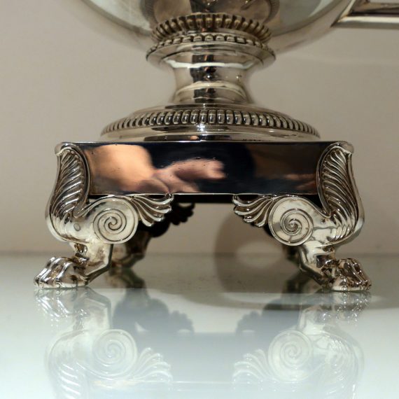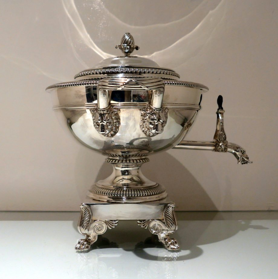 A truly stunning silver hemispherical tea urn decorated with gadroon borders for highlights.  The body has stylish  upper girdled wire and a ‘serpent’ themed tap.  The lion mane handles and elegant ornate spreading pedestal foot complete a splendid piece of craftsmanship by the master silversmith Paul Storr.  The detachable lid and upper body have identical large contemporary crests for importance.