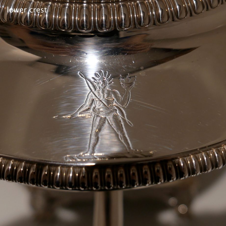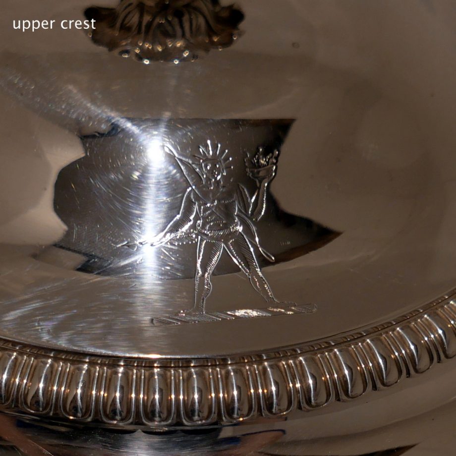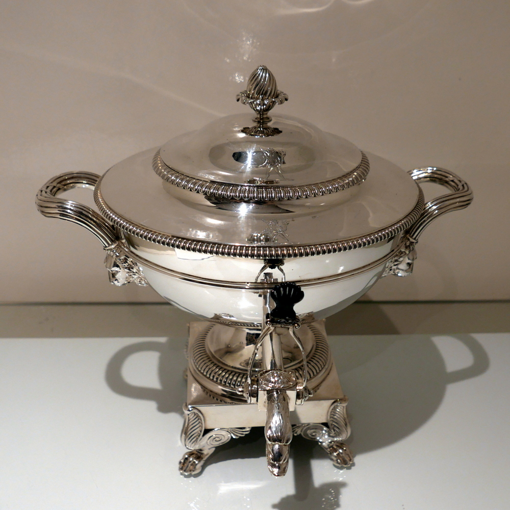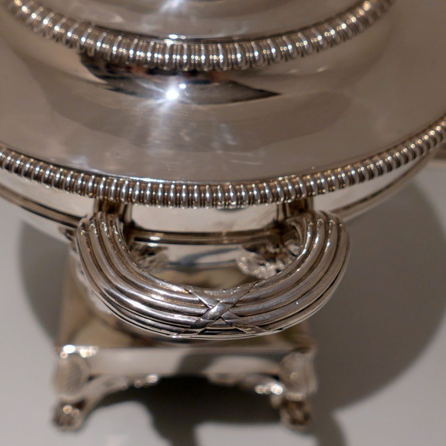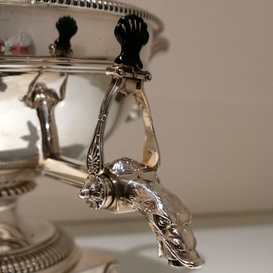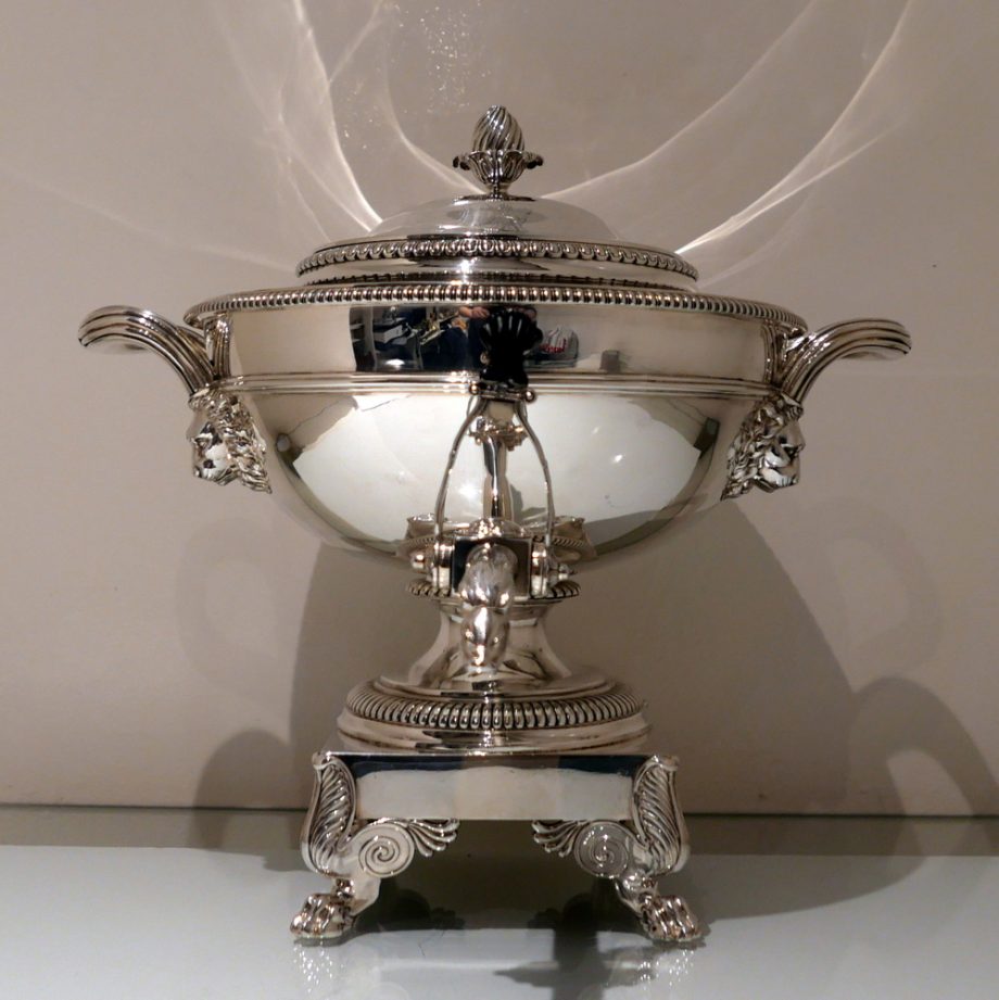 A truly stunning silver hemispherical tea urn decorated with gadroon borders for highlights.  The body has stylish  upper girdled wire and a ‘serpent’ themed tap.  The lion mane handles and elegant ornate spreading pedestal foot complete a splendid piece of craftsmanship by the master silversmith Paul Storr.  The detachable lid and upper body have identical large contemporary crests for importance.