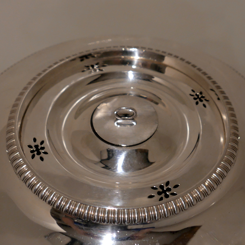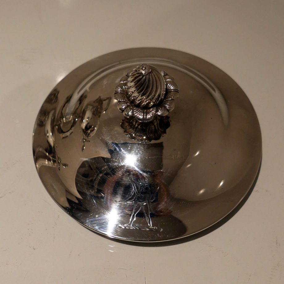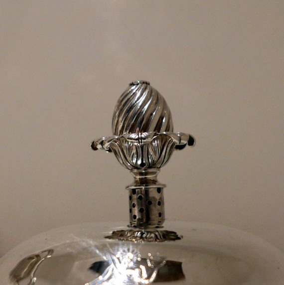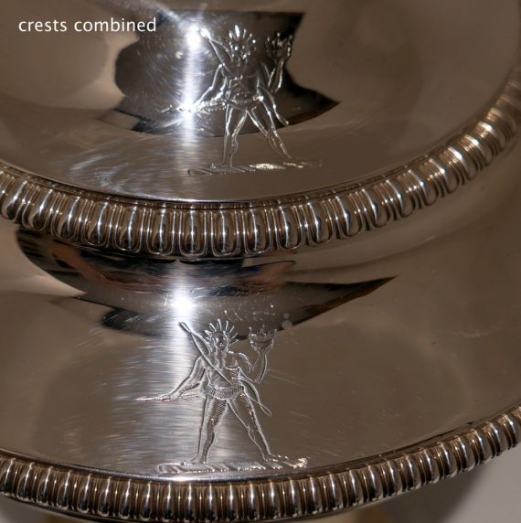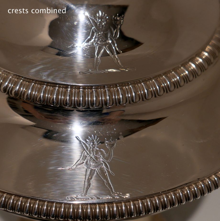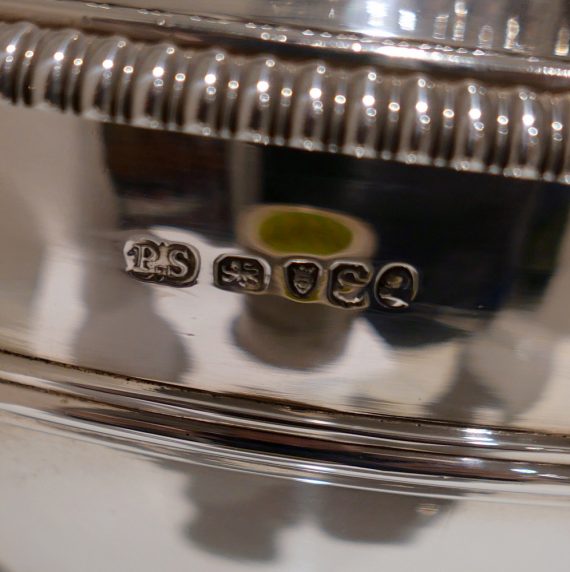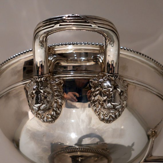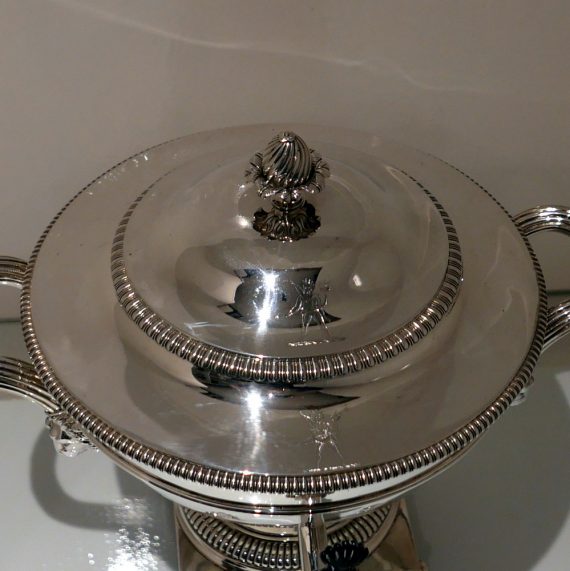 A truly stunning silver hemispherical tea urn decorated with gadroon borders for highlights.  The body has stylish  upper girdled wire and a ‘serpent’ themed tap.  The lion mane handles and elegant ornate spreading pedestal foot complete a splendid piece of craftsmanship by the master silversmith Paul Storr.  The detachable lid and upper body have identical large contemporary crests for importance.
