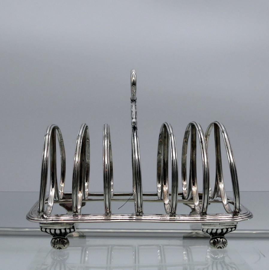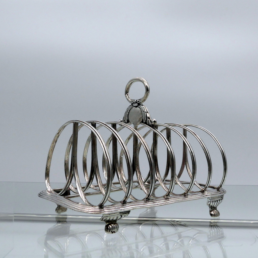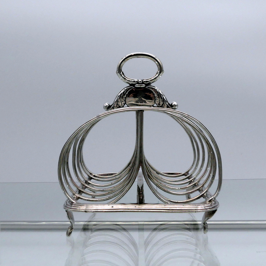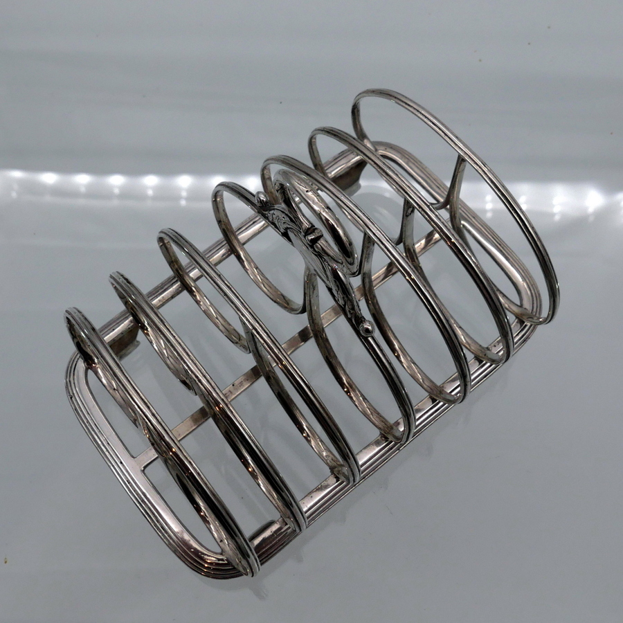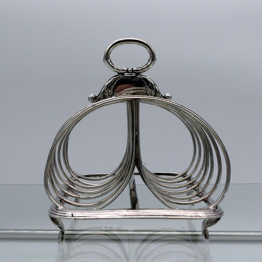 A beautiful oblong Georgian silver wire work toast rack sitting on four stylish feet and designed with an elegant central mast handle which is engraved with a delightful crest for importance.