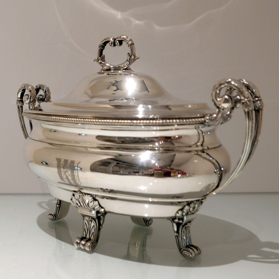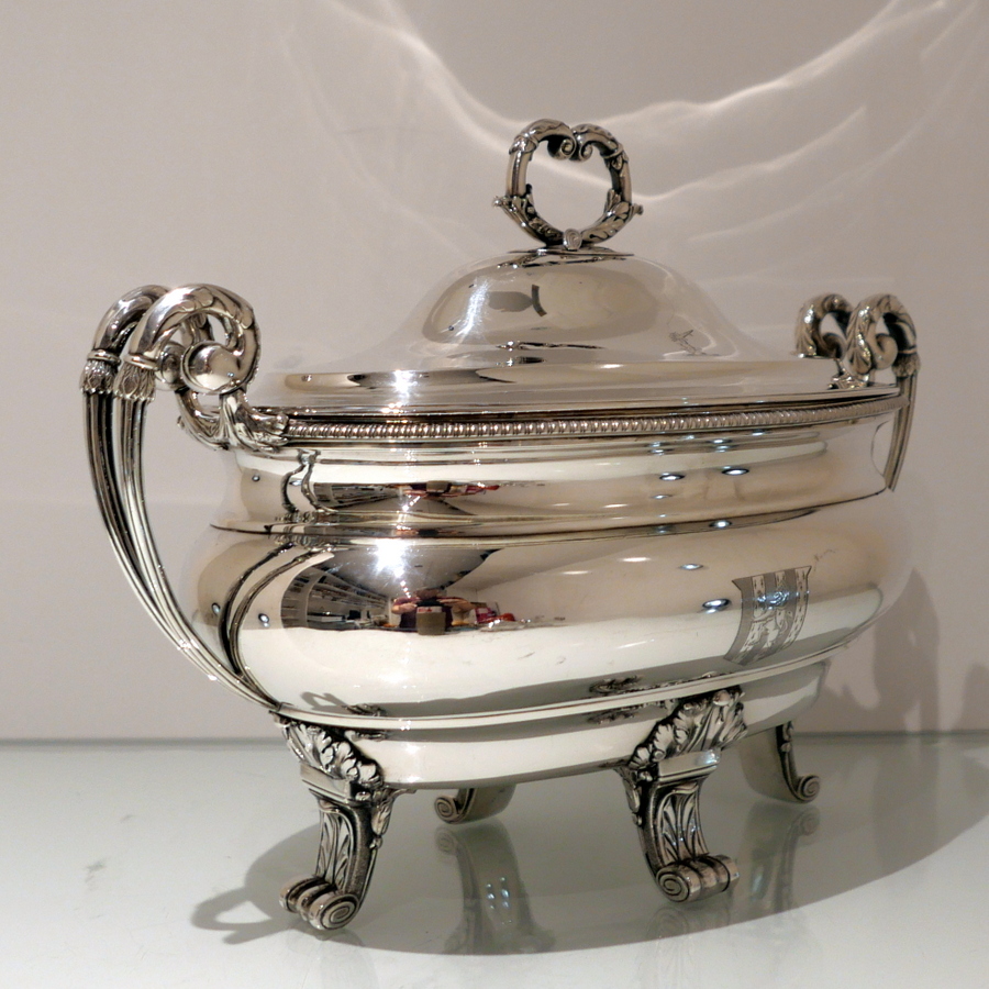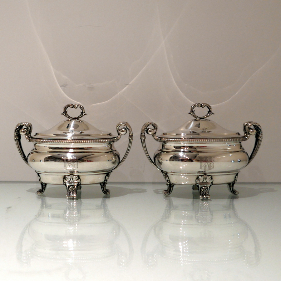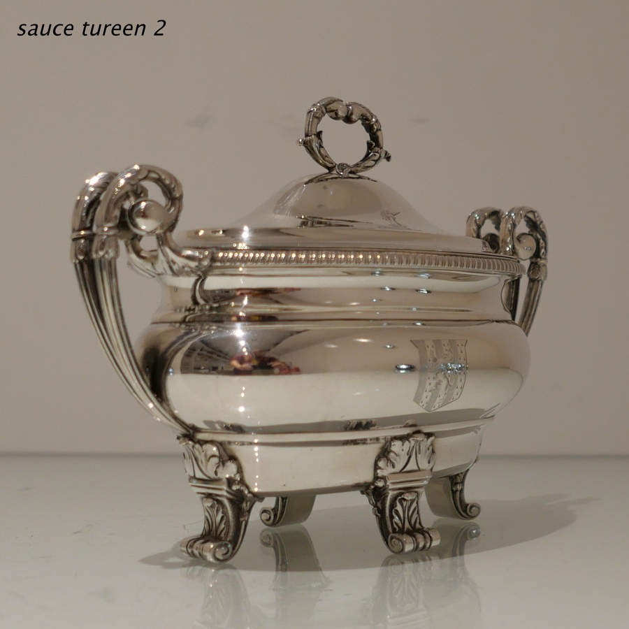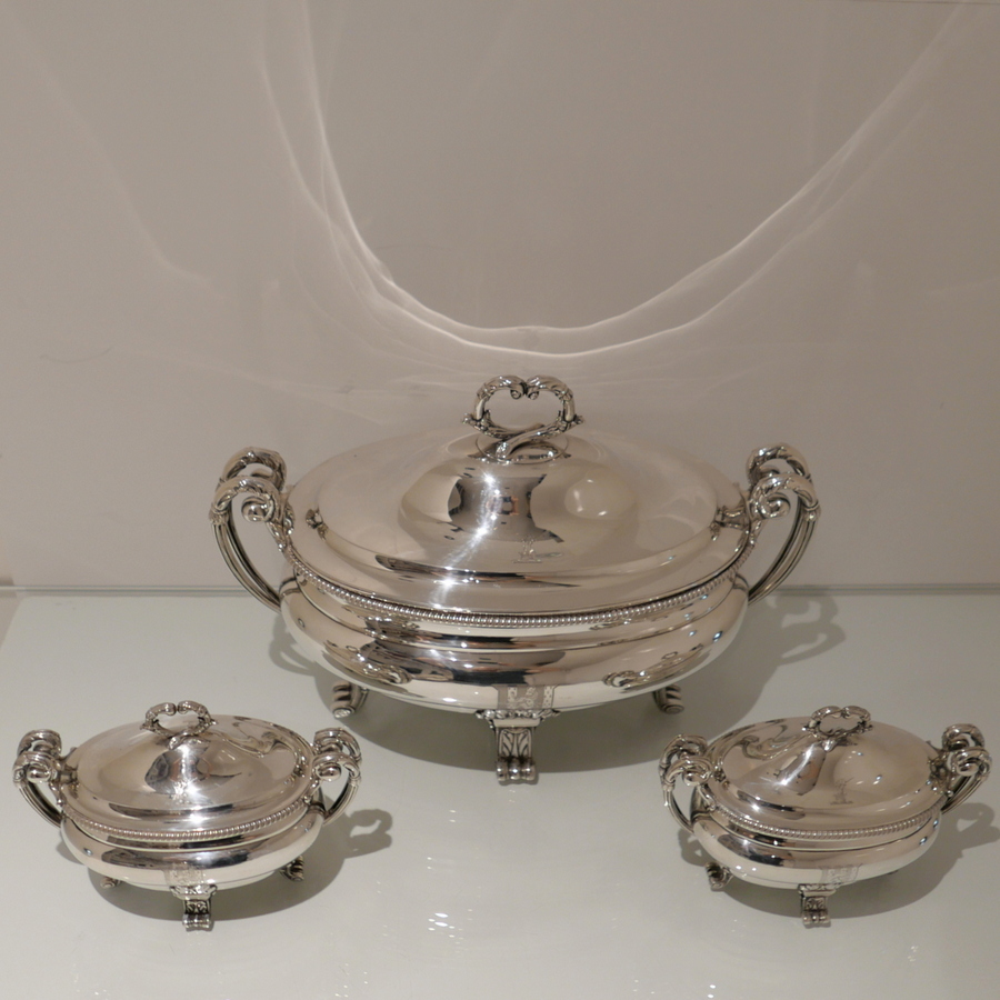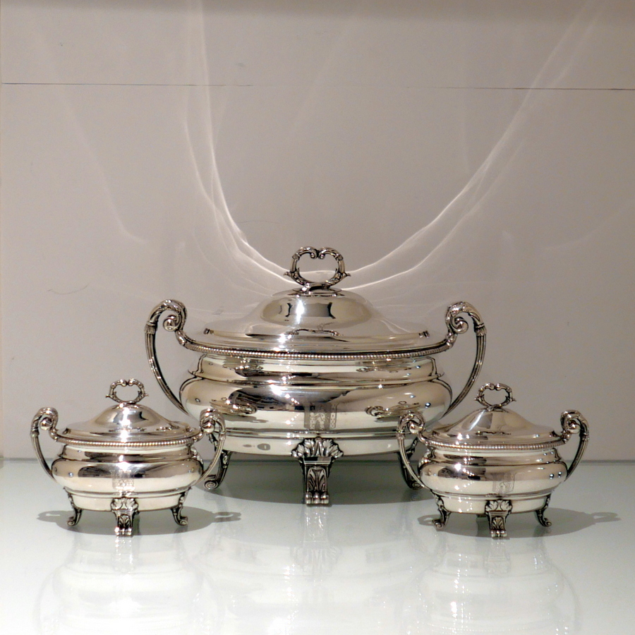 A stunning and highly collectable suite of Paul Storr serving pieces compromising of a large soup tureen and pair of sauce tureens  with elegant gadroon rims.  The body has been shaped in three elegant 1sections, noticeably the central ‘bulbous’ gallery and has exquisite applied bifurcated reeded acanthus-capped handles.  All pieces have stylish contemporary armorials and crests for importance.