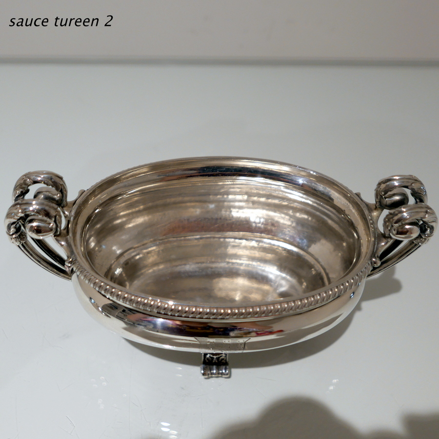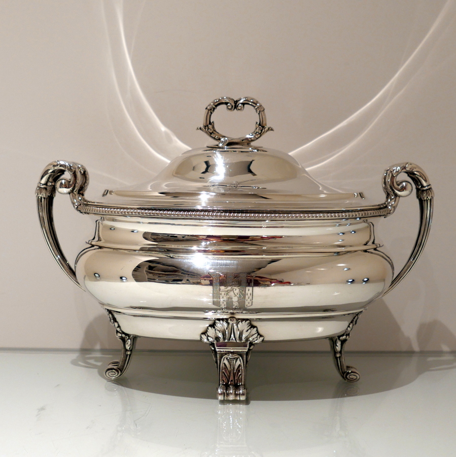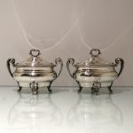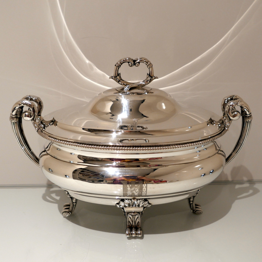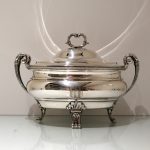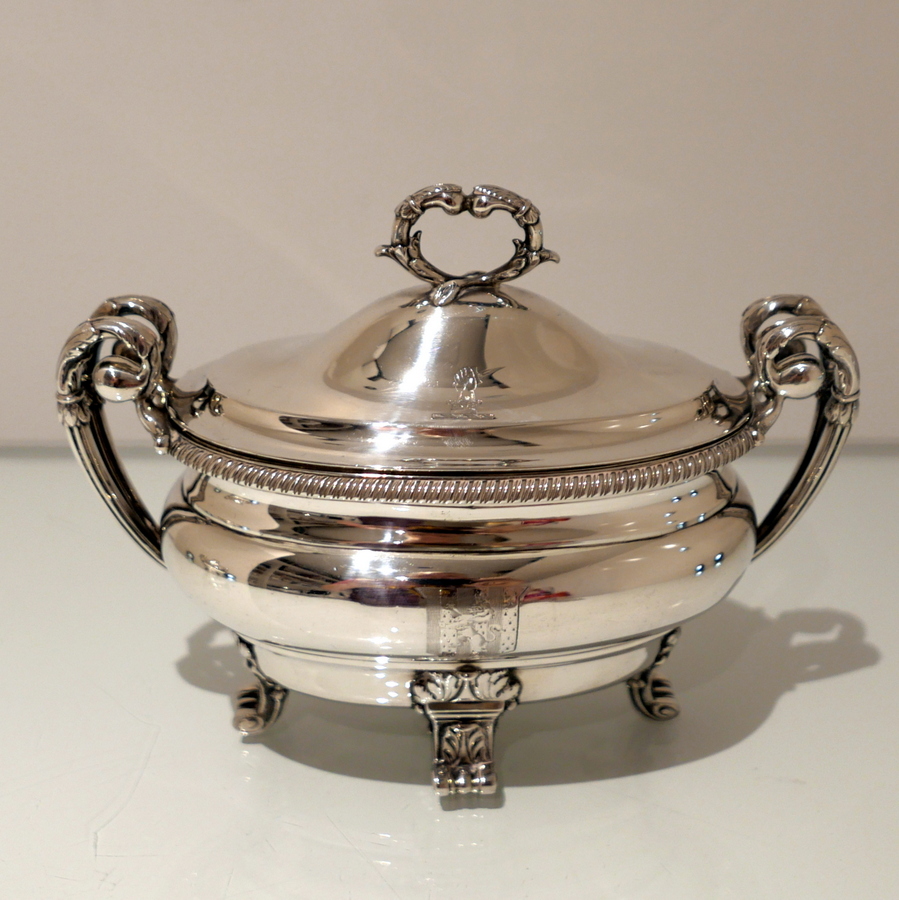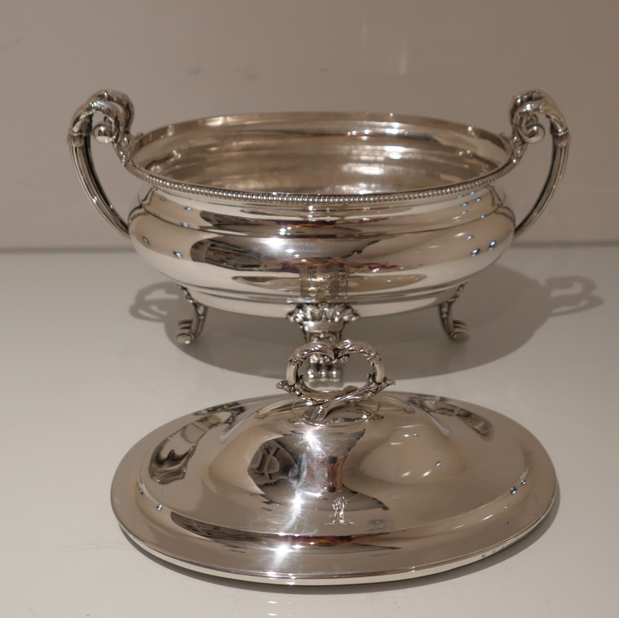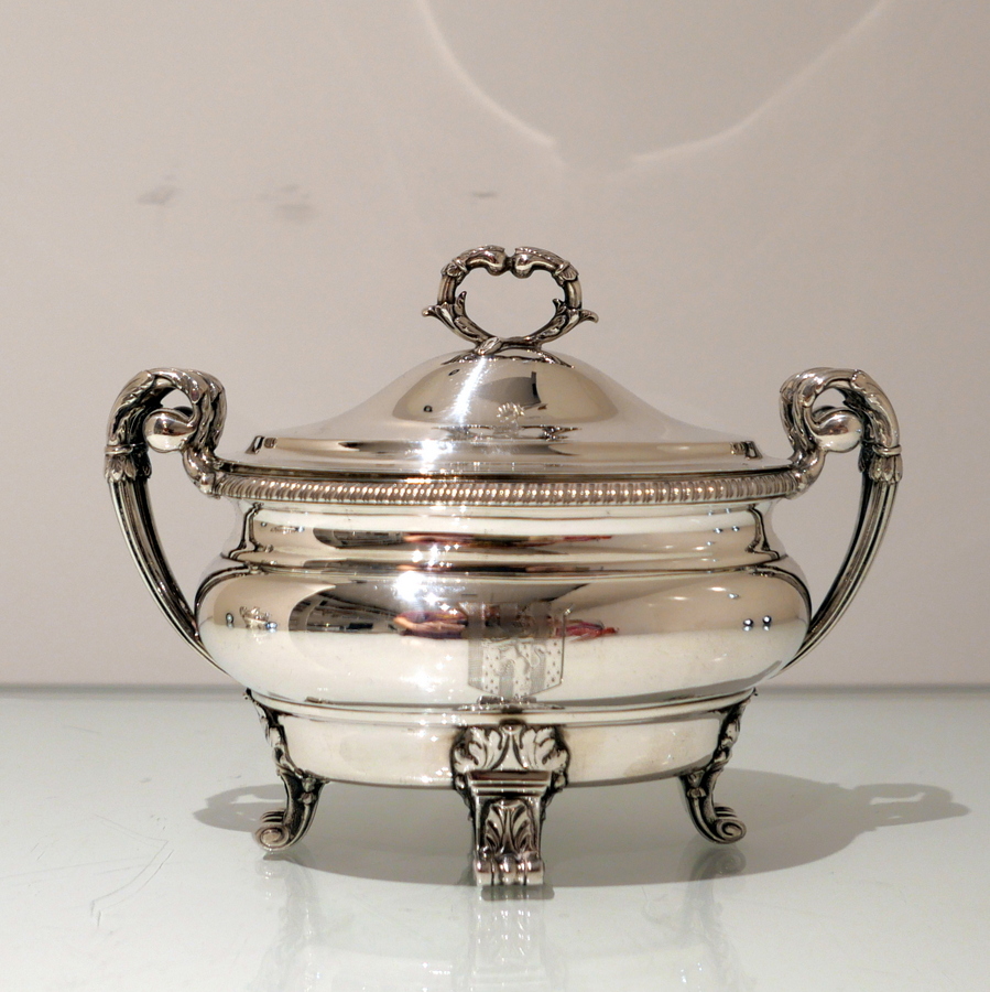 A stunning and highly collectable suite of Paul Storr serving pieces compromising of a large soup tureen and pair of sauce tureens  with elegant gadroon rims.  The body has been shaped in three elegant 1sections, noticeably the central ‘bulbous’ gallery and has exquisite applied bifurcated reeded acanthus-capped handles.  All pieces have stylish contemporary armorials and crests for importance.