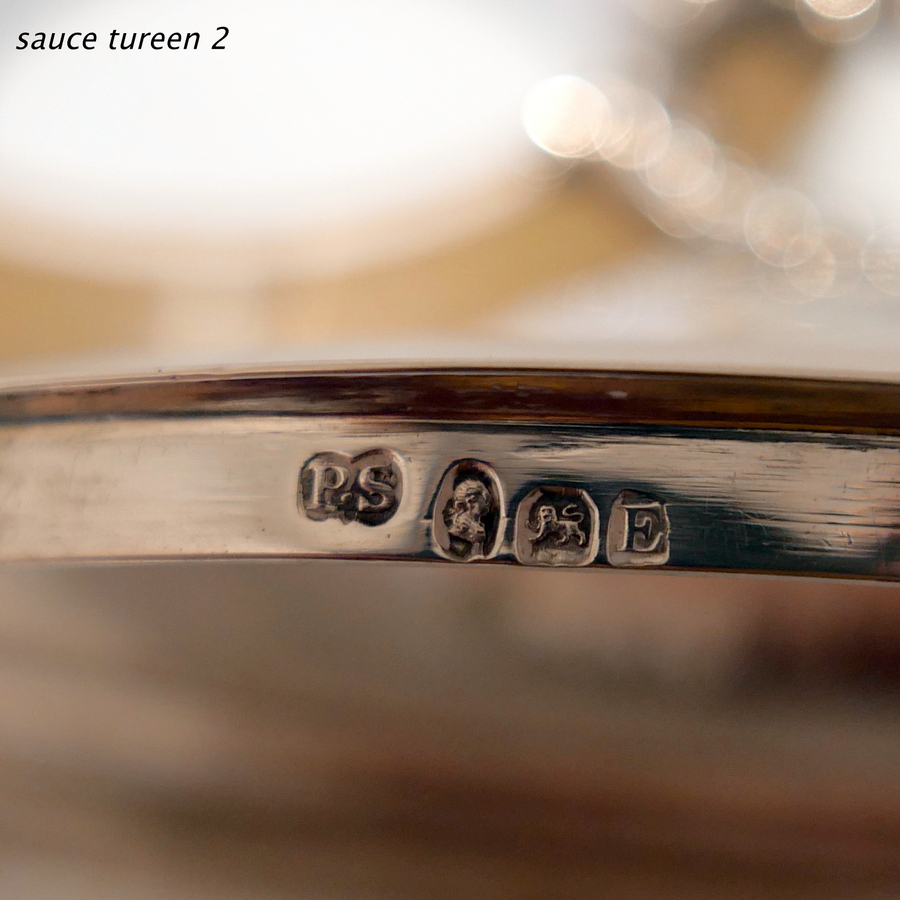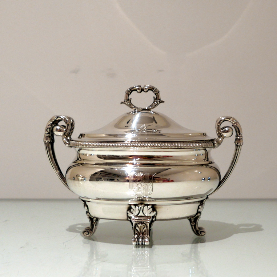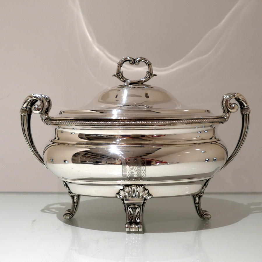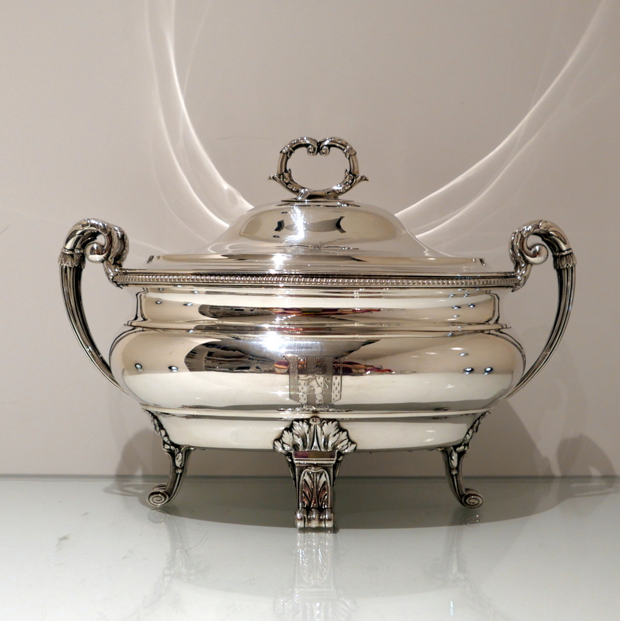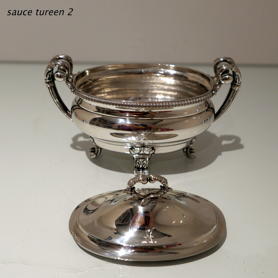 A stunning and highly collectable suite of Paul Storr serving pieces compromising of a large soup tureen and pair of sauce tureens  with elegant gadroon rims.  The body has been shaped in three elegant 1sections, noticeably the central ‘bulbous’ gallery and has exquisite applied bifurcated reeded acanthus-capped handles.  All pieces have stylish contemporary armorials and crests for importance.