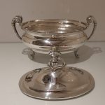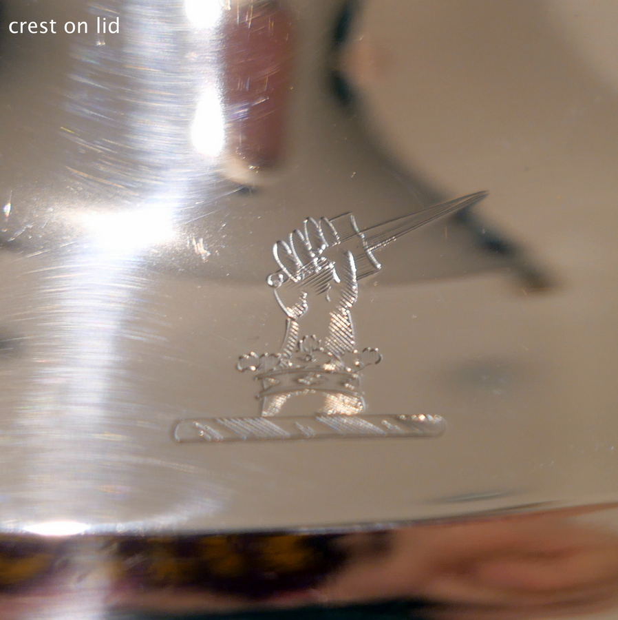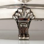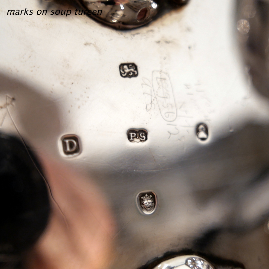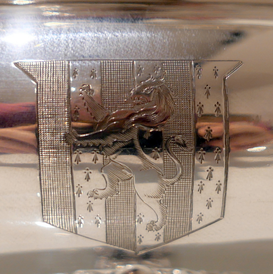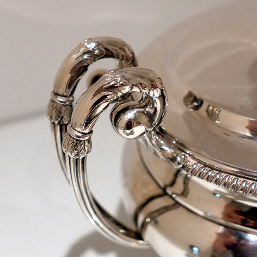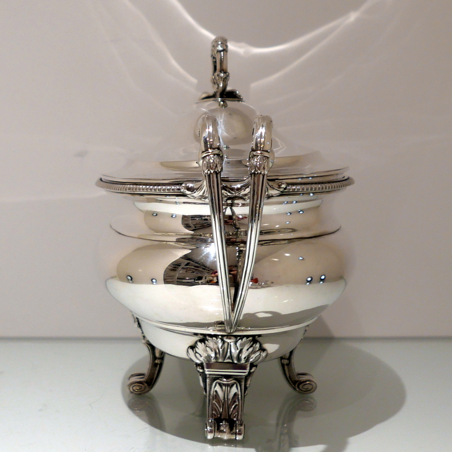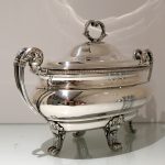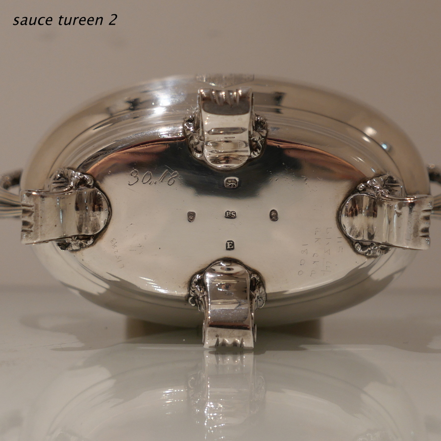 A stunning and highly collectable suite of Paul Storr serving pieces compromising of a large soup tureen and pair of sauce tureens  with elegant gadroon rims.  The body has been shaped in three elegant 1sections, noticeably the central ‘bulbous’ gallery and has exquisite applied bifurcated reeded acanthus-capped handles.  All pieces have stylish contemporary armorials and crests for importance.