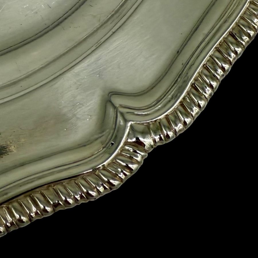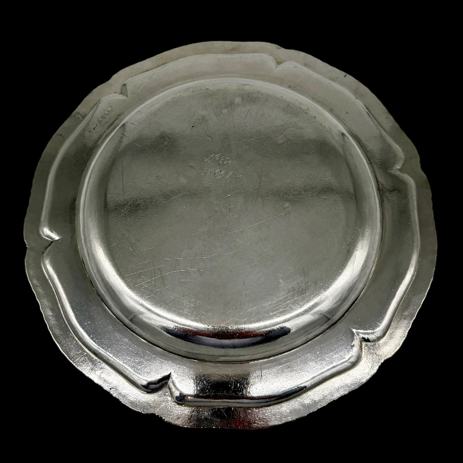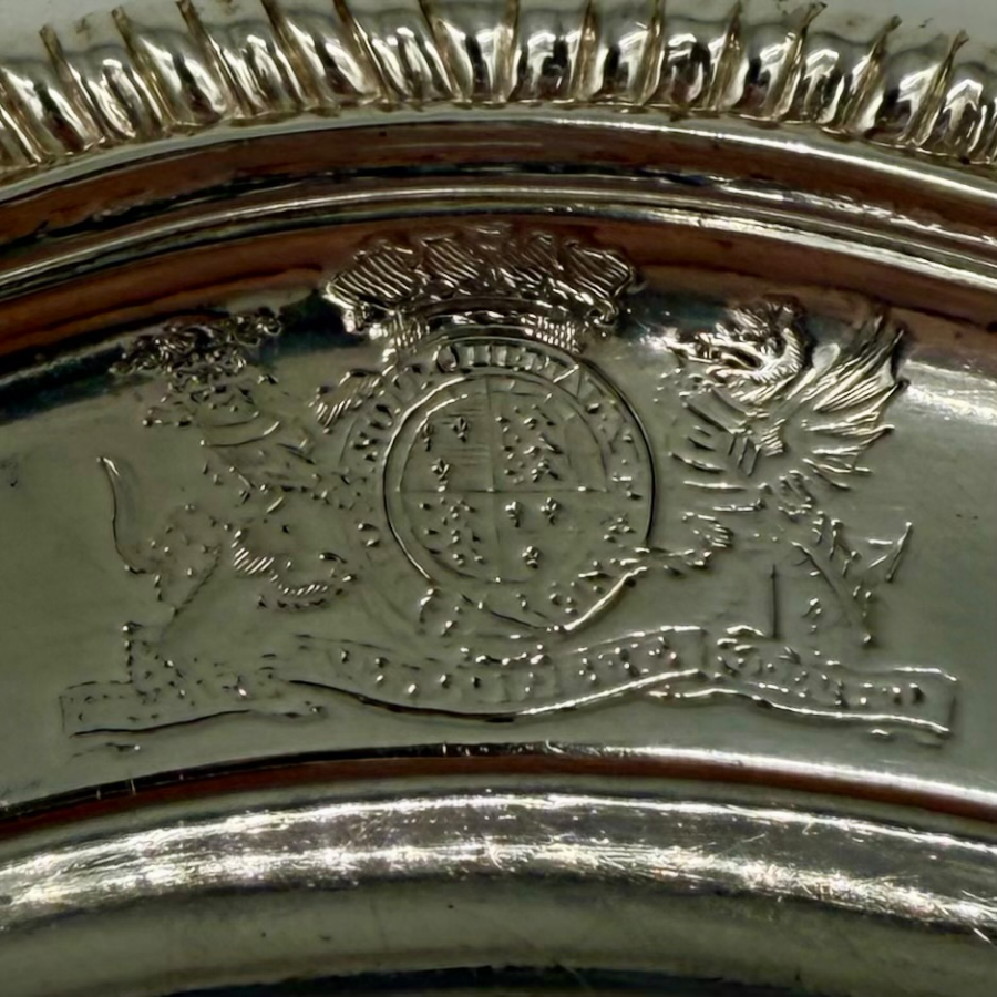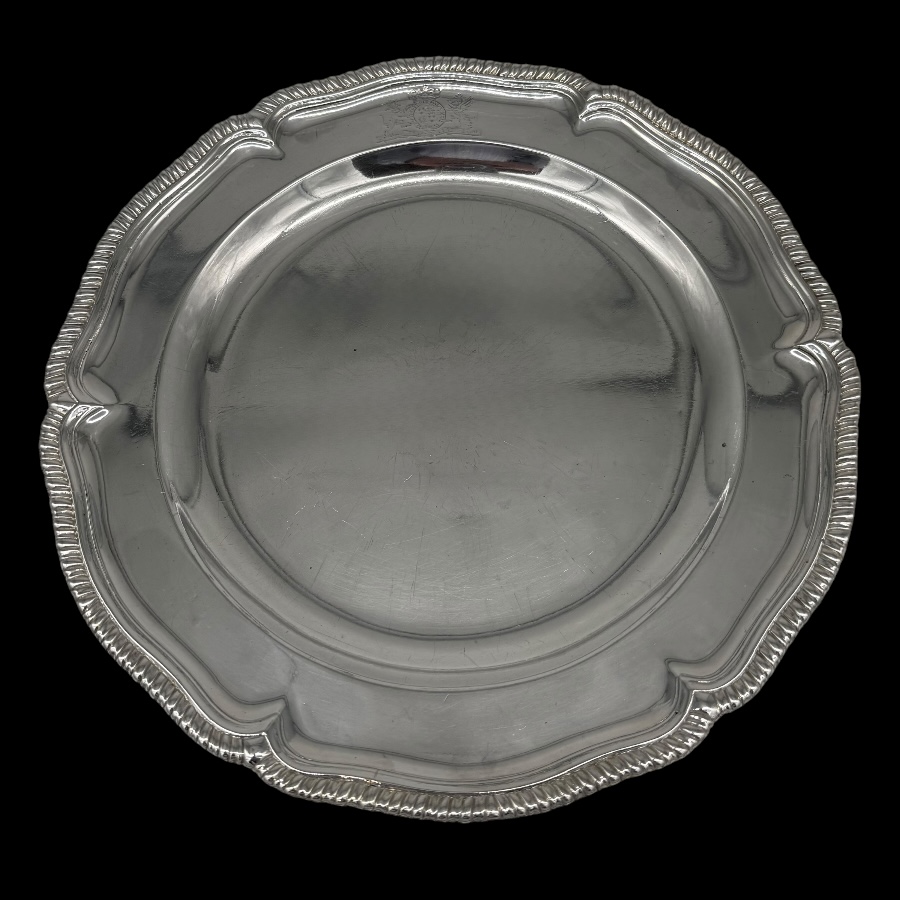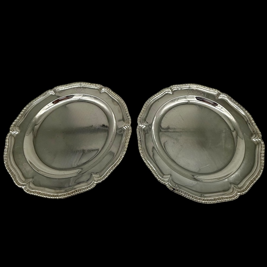 Beautiful pair of large second course underplates decorated with applied gadroon wire highlights and shaped circular in design. The inside walls has elegant regal looking original hand engraved armorials.