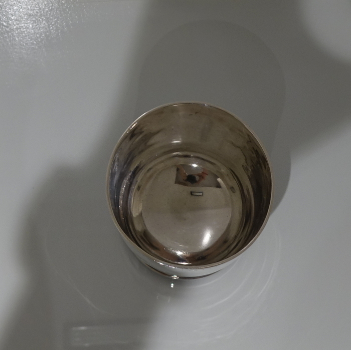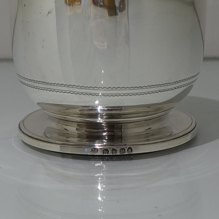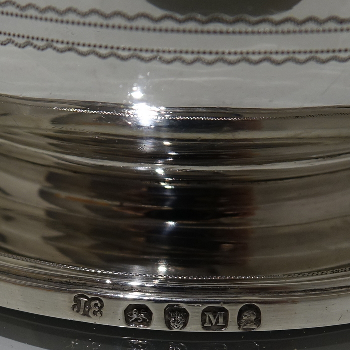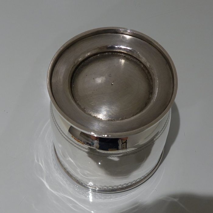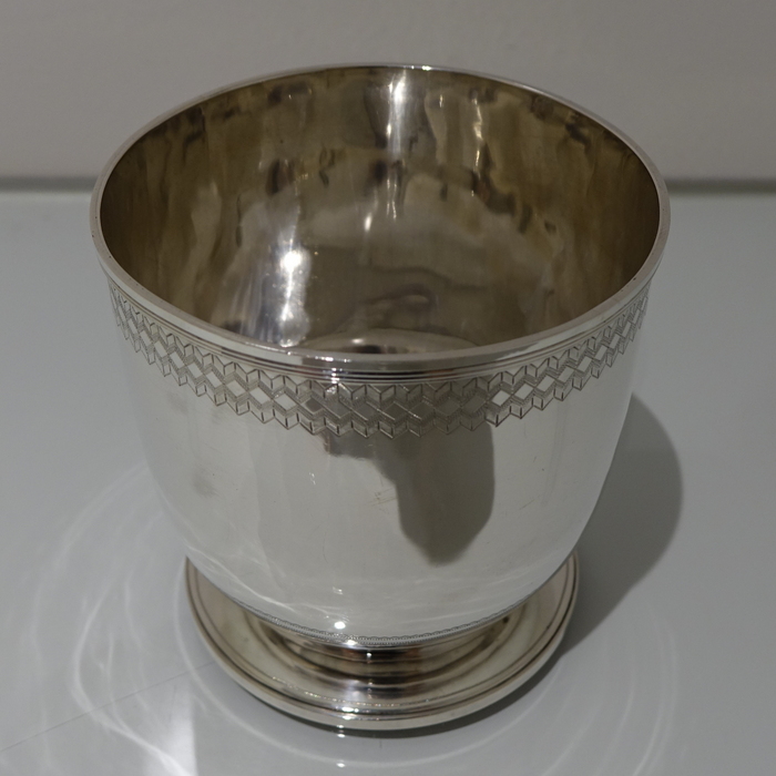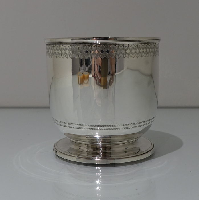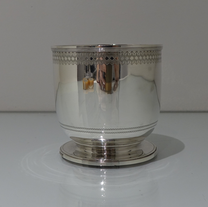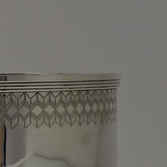 A delightful circular Georgian silver sugar/slop bowl plain formed in design with upper and lower bands of intricate bright cut hand engraving for decoration.