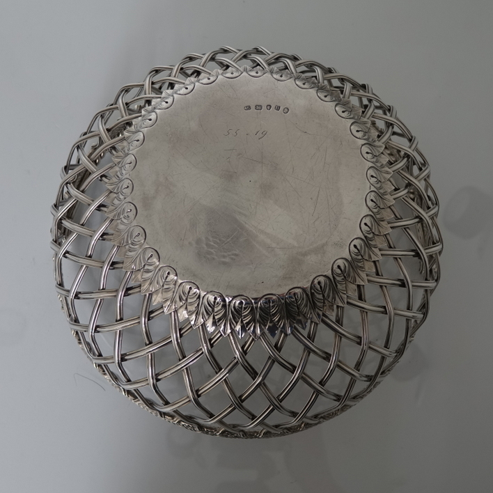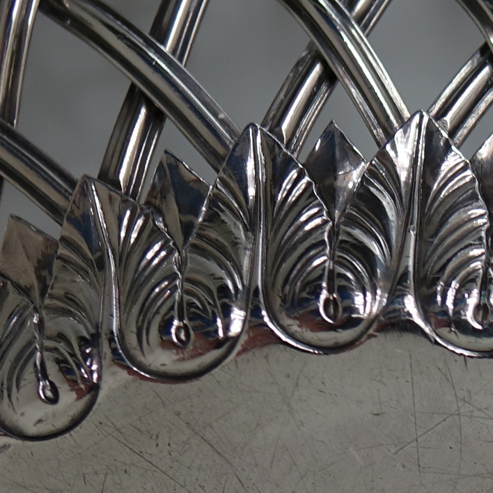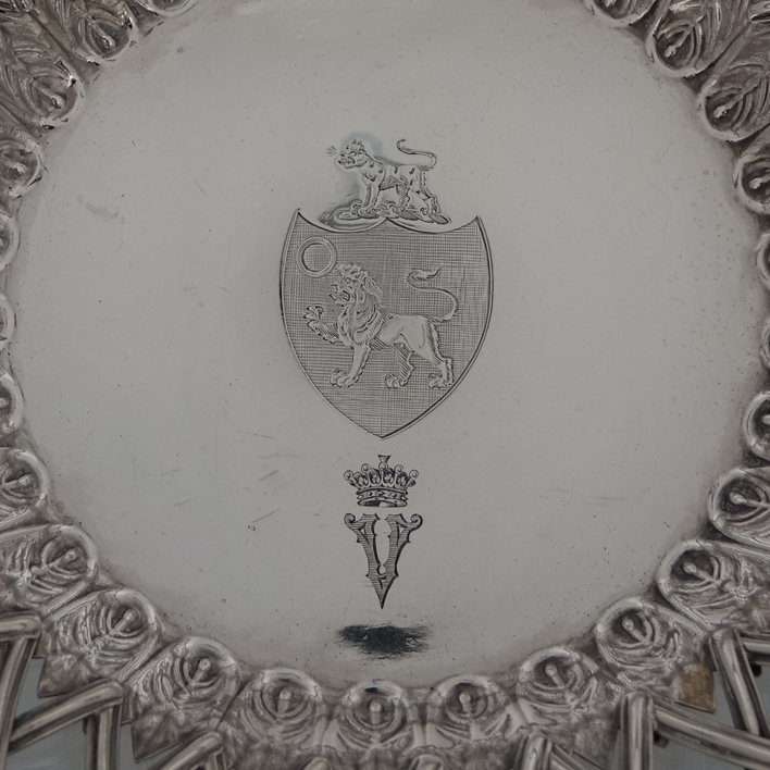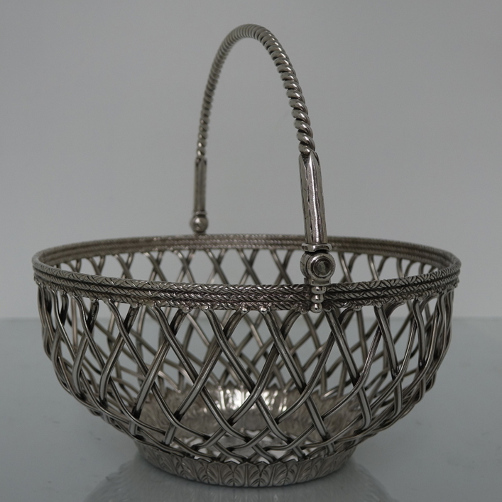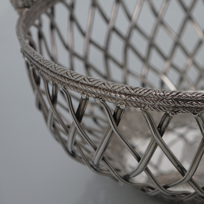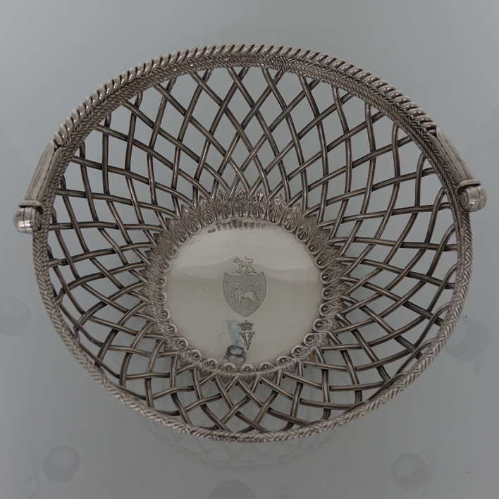 This wire-work basket boasts a noble-looking family crest (unresearched) on the inside depicting a male lion in a shield with a female lion above. Below the cartouche is a crown with a gothic V. The bread basket has a swing handled action and for additional decorative highlights is shaped in a rope form. The base of the bowl has a sunburst design with decorative acanthus leaf foliage to round off a stunning piece of craftsmanship.