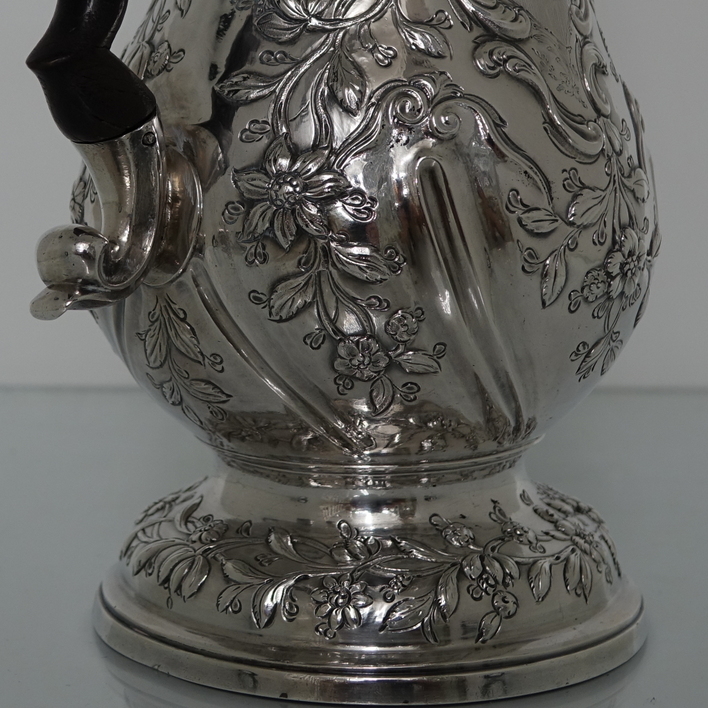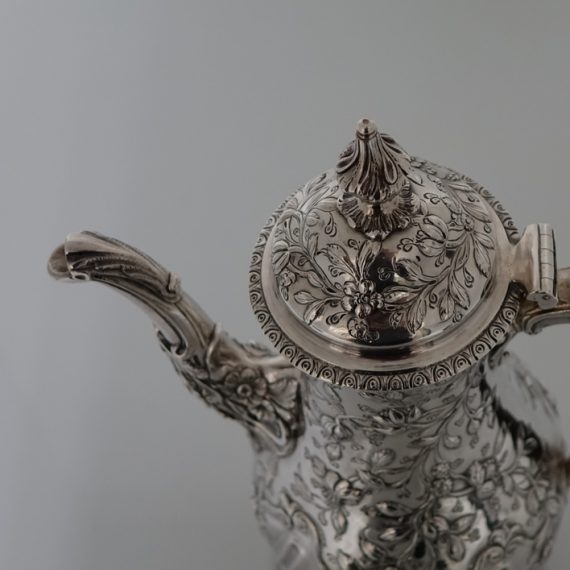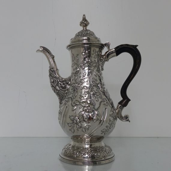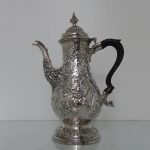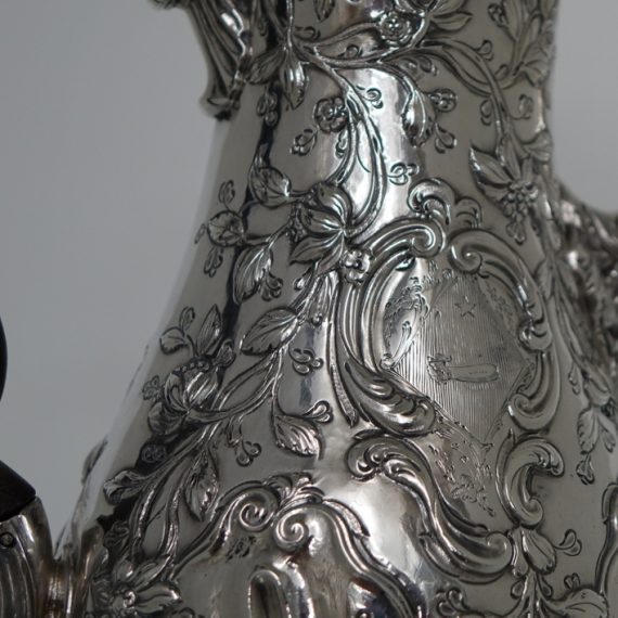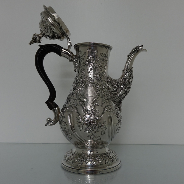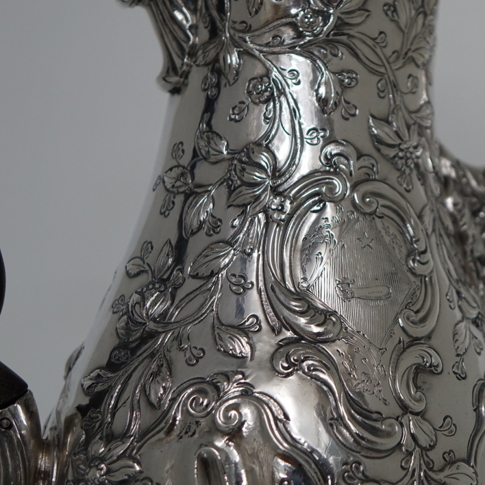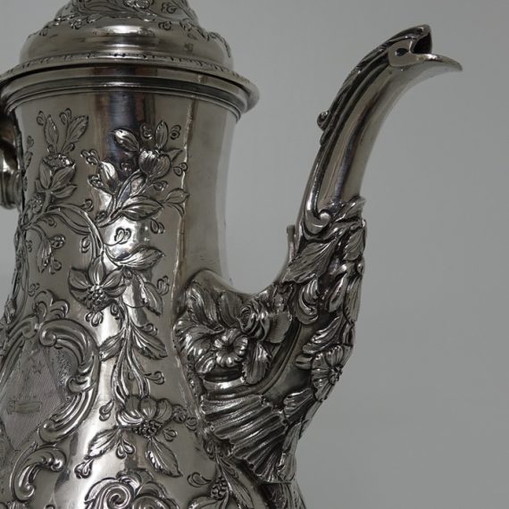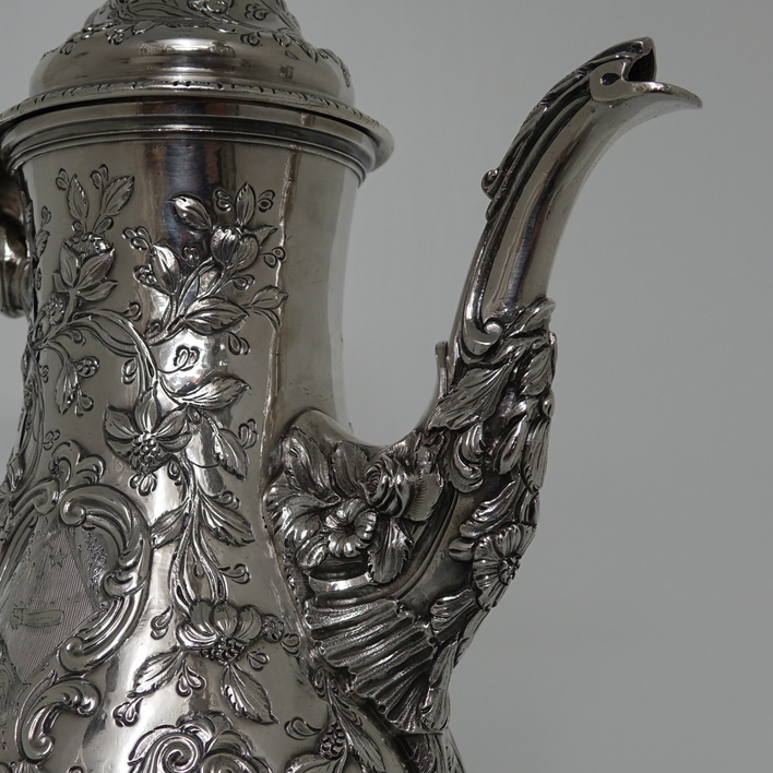 A large elegant George III Rococo coffee pot with pristine grape and vine hand chased workmanship throughout with a cartouche incorporating a family crest. The coffee pot sits on a circular raised pedestal foot and has a beautifully designed spout. The lid of the coffee pot has a knop finial and has decorative border for additional highlights. The handle of the coffee pot is double scroll pattern with an acanthus leaf thumb piece.