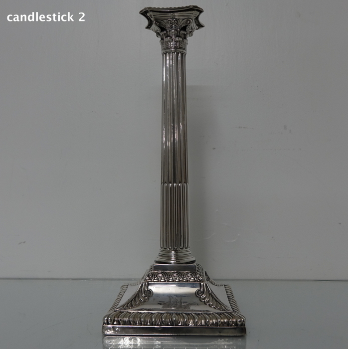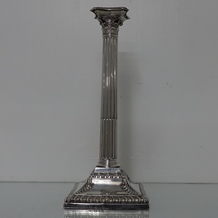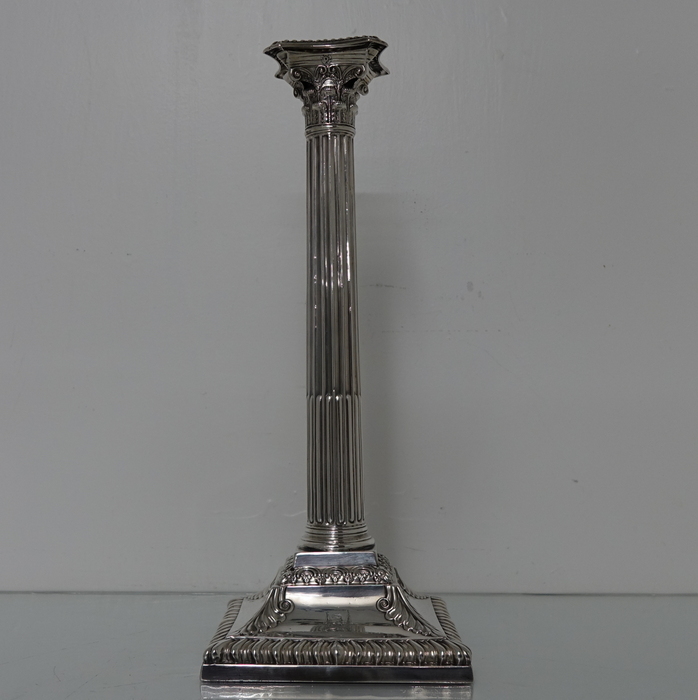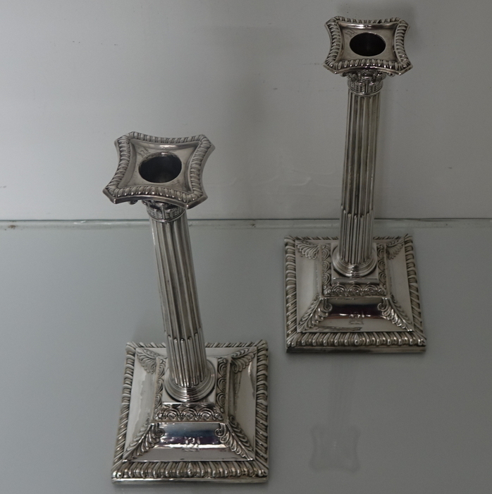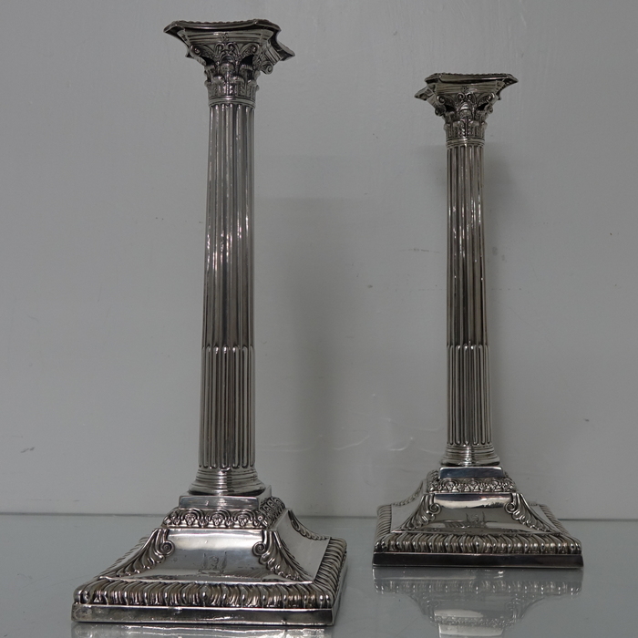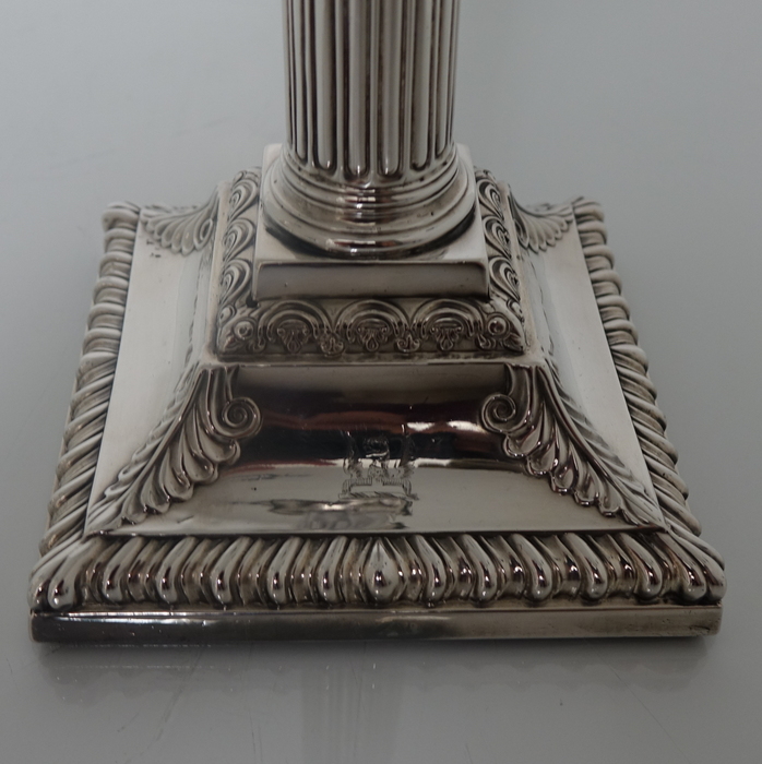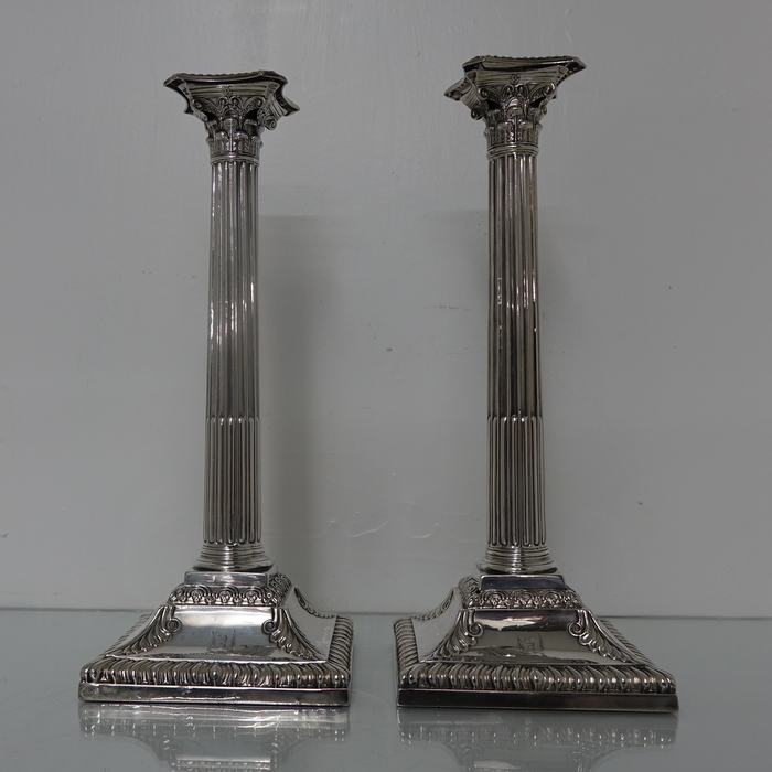 A very stylish pair of Georgian candlesticks, half corinthian column in design sitting on a square filled gadroon base with ornate embossing at the angles for lowlights. Â The sticks have detachable nozzles and there is a contemporary crest on both base and nozzle for importance.