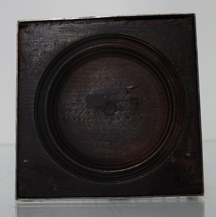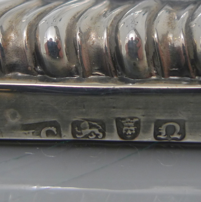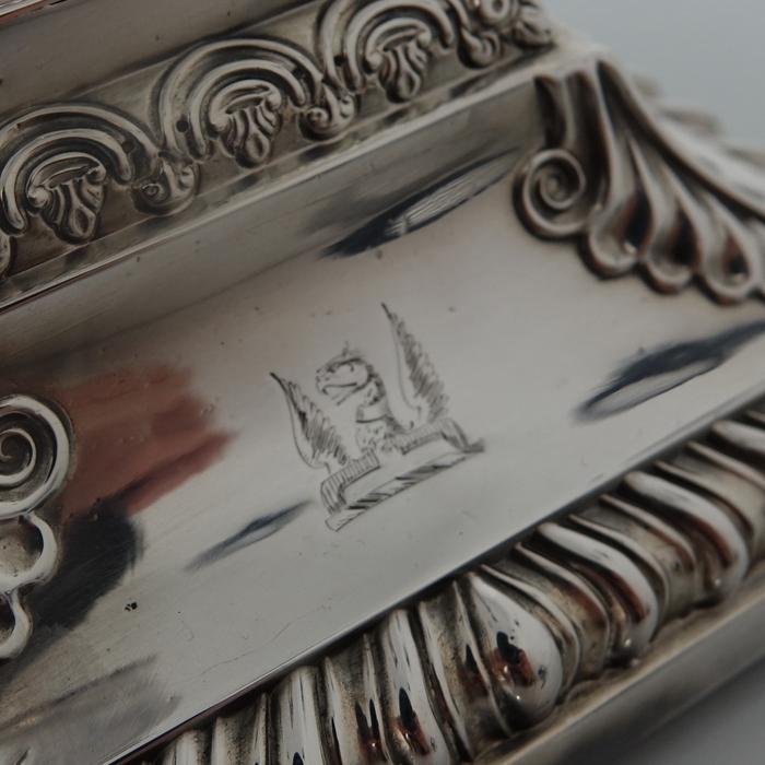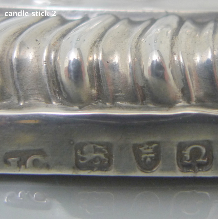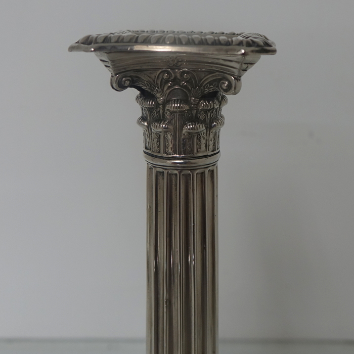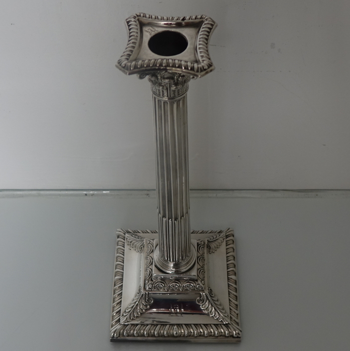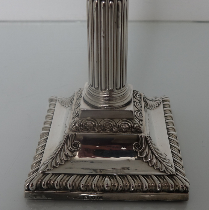 A very stylish pair of Georgian candlesticks, half corinthian column in design sitting on a square filled gadroon base with ornate embossing at the angles for lowlights. Â The sticks have detachable nozzles and there is a contemporary crest on both base and nozzle for importance.