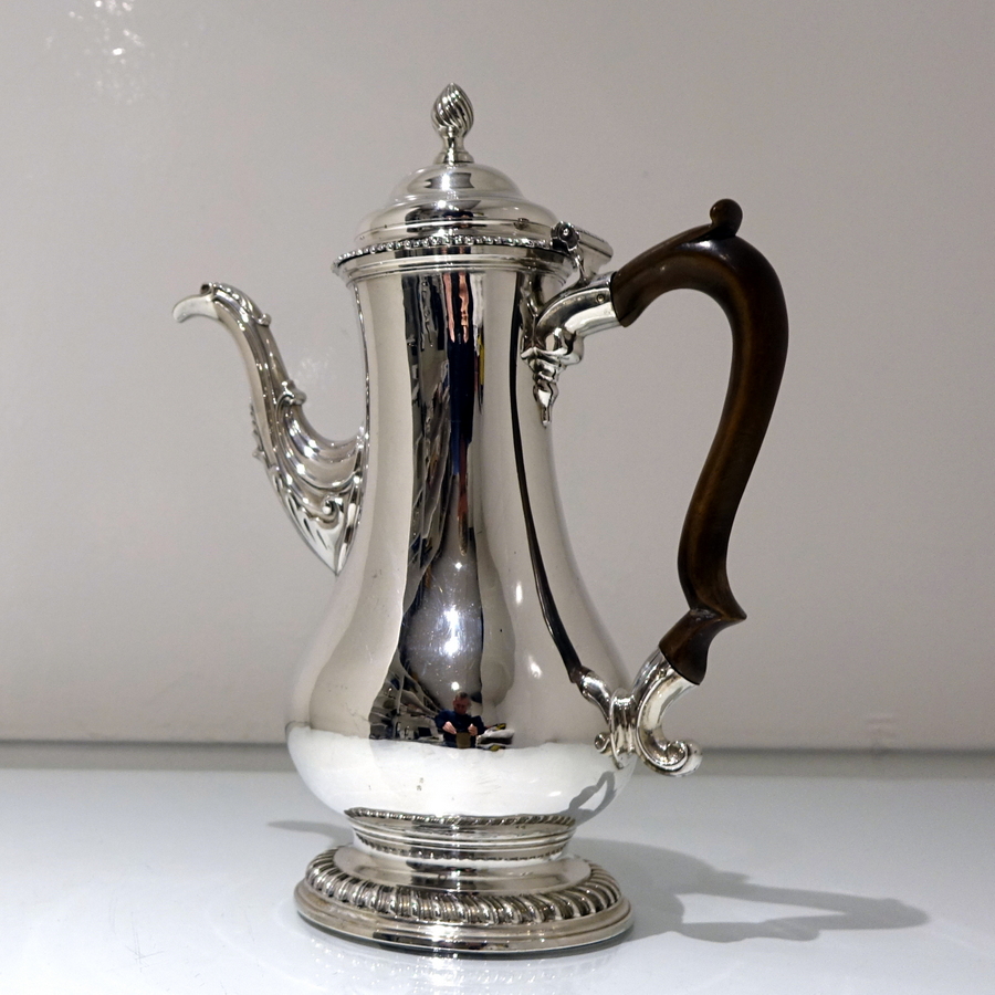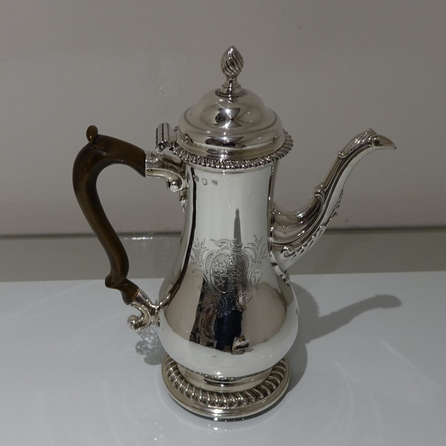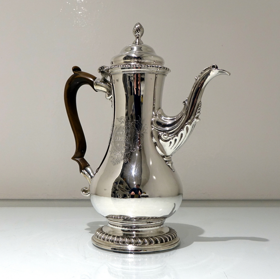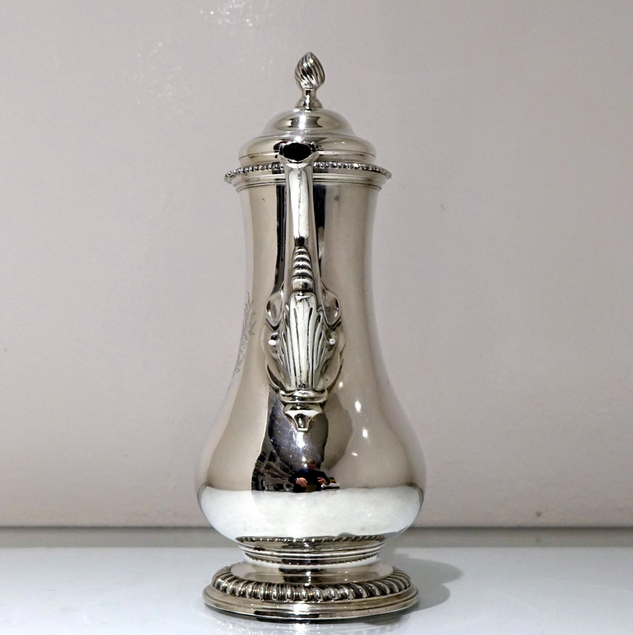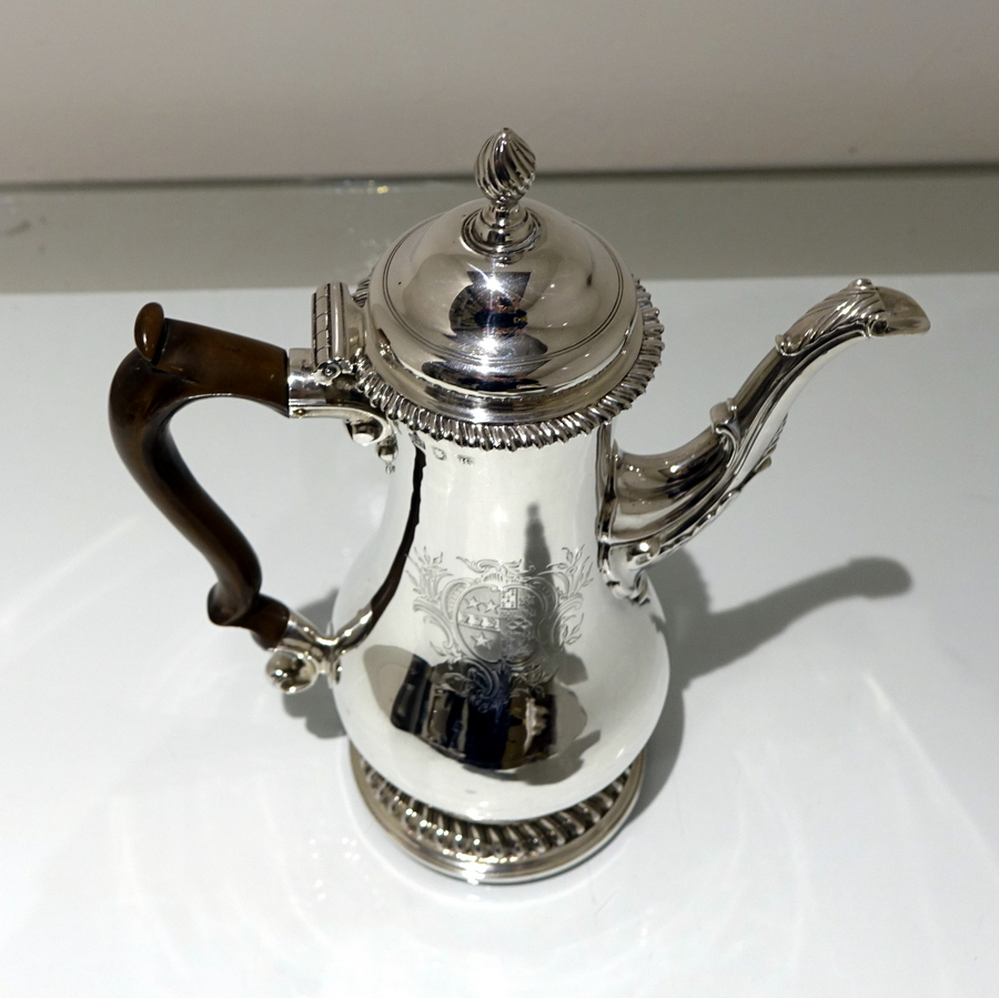 A very beautiful 18th century pear shaped coffee pot decorated with stylish gadrooned mouldings around the lid and the foot. Â The coffee pot has an elegant contemporary engraved armorial (maritial arms of Wright and his Trist wife) for importance.